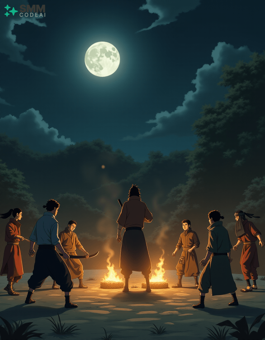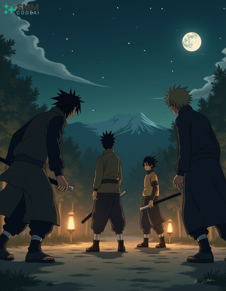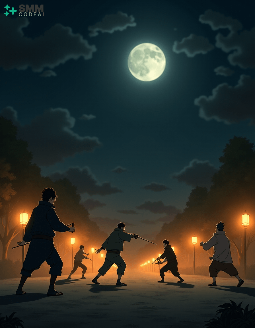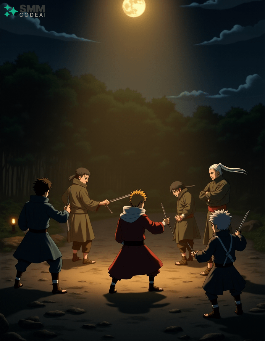 Compose an animated scene set in a dimly lit training ground at night in the Hidden Leaf Village. Show several adult ninja characters engaged in intense training exercises, each with their own unique techniques and expressions. Include characters like Orochimaru, Gaara, Kurenai, or any other mature ninja from the Naruto series. Depict them in various postures, such as performing a jutsu, practicing taijutsu, or working on weapons training. Use warm, golden tones for the moonlight casting soft shadows over their figures and highlighting their movements. Incorporate elements like flickering lanterns, smoke trails from their techniques, and the occasional sound of wind to create an atmosphere of tension and excitement. The scene should convey a sense of late-night dedication and determination among these seasoned ninja, with each character pushing themselves to their limits in pursuit of mastery and strength.