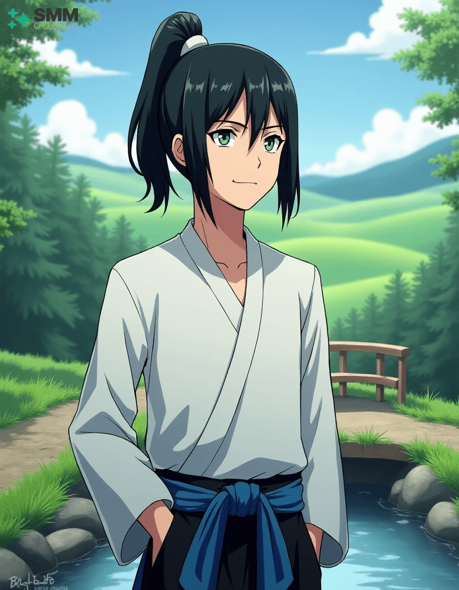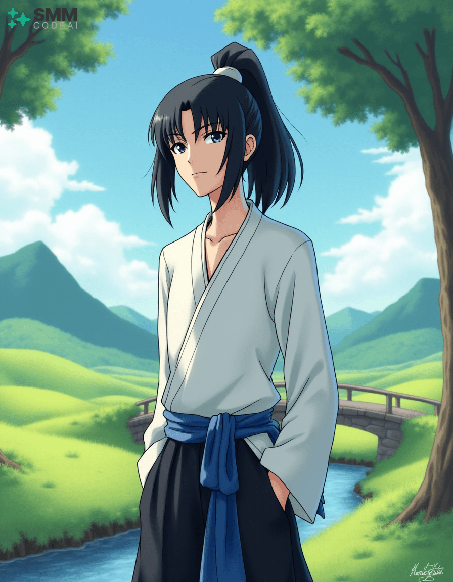 Create a serene portrait of Uryu Ishida from the anime series "Bleach." Uryu is depicted as a young man with shoulder-length, black hair tied into a high ponytail. His expressive eyes are framed by long, dark lashes and have a mischievous glint in them, reflecting his intelligence and sharp wit. He wears a traditional Zanpakuto Academy uniform with a white shirt, black pants, and the academy's blue sash. The background is a serene landscape, featuring lush greenery, rolling hills, and a small bridge over a calm stream. A gentle breeze blows through the trees, casting soft shadows on Uryu's features. Use soft, pastel colors to create a peaceful atmosphere, highlighting the tranquility and wisdom in Uryu's expression. The scene evokes a sense of adventure and camaraderie, showcasing the character's inner strength and resilience.