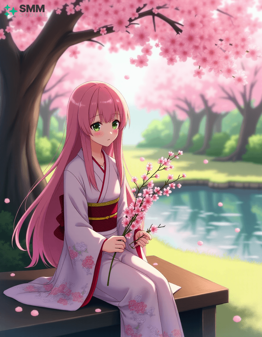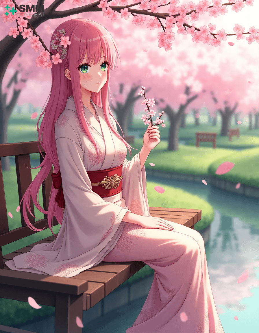 Create an image of a serene and elegant scene from an anime, showcasing a young woman with long, flowing pink hair and emerald green eyes seated gracefully on a wooden bench under a blooming cherry blossom tree. The cherry blossoms are in full bloom, their delicate petals gently falling to the ground. She wears a traditional kimono, its intricate patterns depicting cherry blossoms and other Japanese elements, tied at the waist with a soft sash. In her lap, she holds a small bouquet of fresh cherry blossom branches, each branch adorned with more fallen petals. The background is a tranquil garden, with lush green foliage, a pond reflecting the cherry trees, and a gentle stream nearby. Use a soft, ethereal lighting that highlights the delicate beauty of the flowers and the woman's serene expression. The scene exudes tranquility, nature, and a sense of timeless elegance, capturing the essence of traditional Japanese aesthetics.