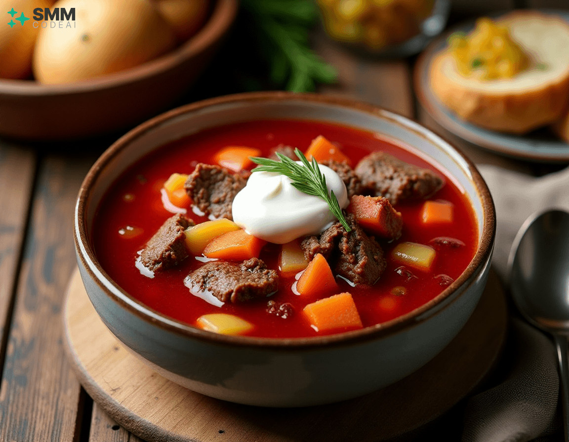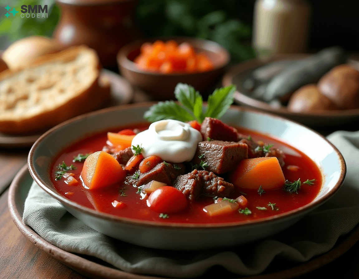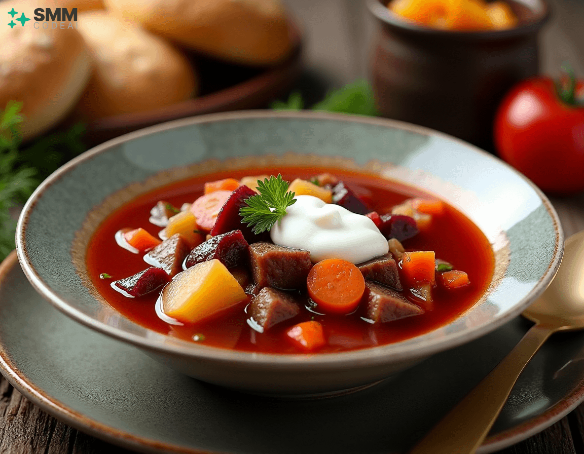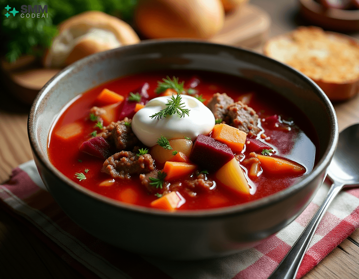 A hearty and comforting bowl of traditional Russian borscht, featuring a vibrant red soup base with tender pieces of beef and pork, simmered in a rich blend of tomato sauce and spices like dill, bay leaf, and sugar. Fresh beets contribute to the soup's deep red color and add natural sweetness. The vegetables such as shredded carrots, diced potatoes, and chopped celery provide texture and flavor. A dollop of sour cream on top adds a creamy contrast to the tartness of the borscht. Set against a wooden table with bread rolls, pickled herring, and a side of rye crust, the scene conveys warmth and nostalgia associated with Russian cuisine. Soft natural lighting highlights the rich colors and flavors, creating an inviting atmosphere that invites you to savor every delicious bite.