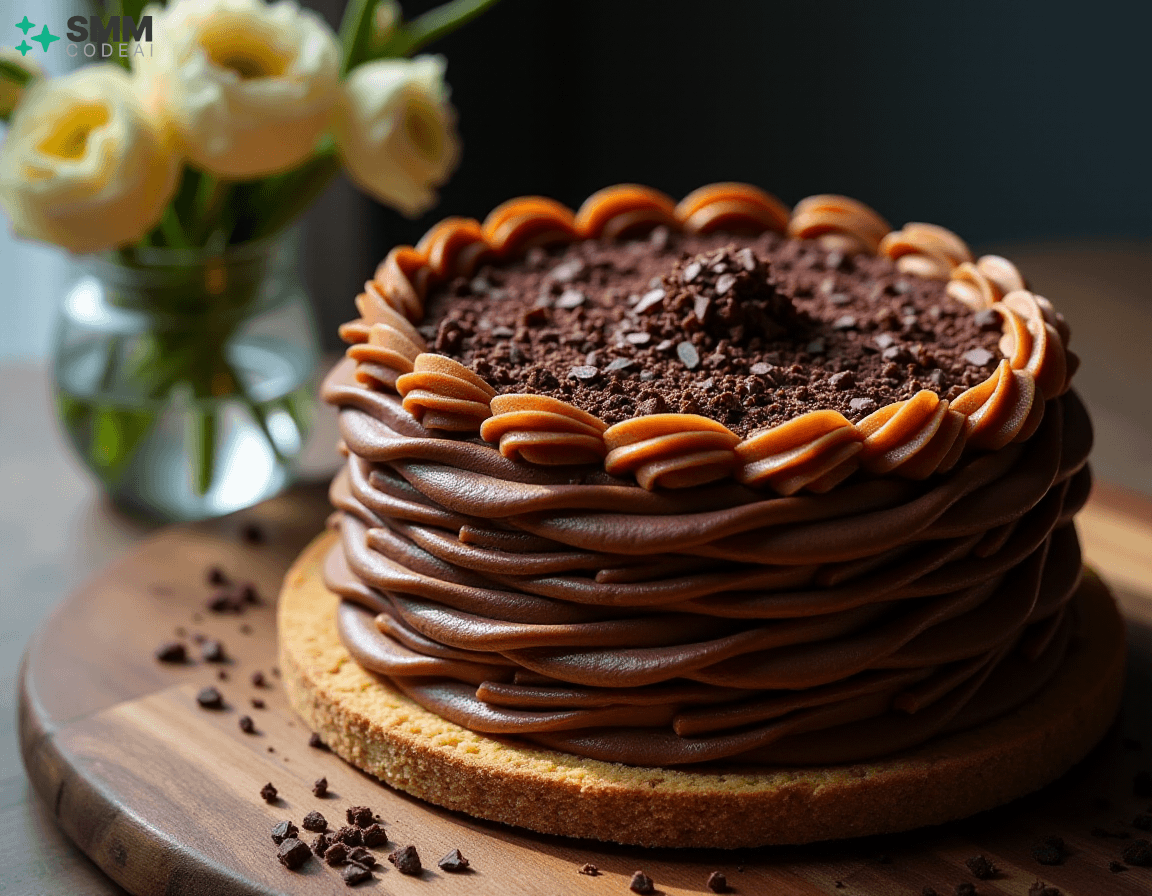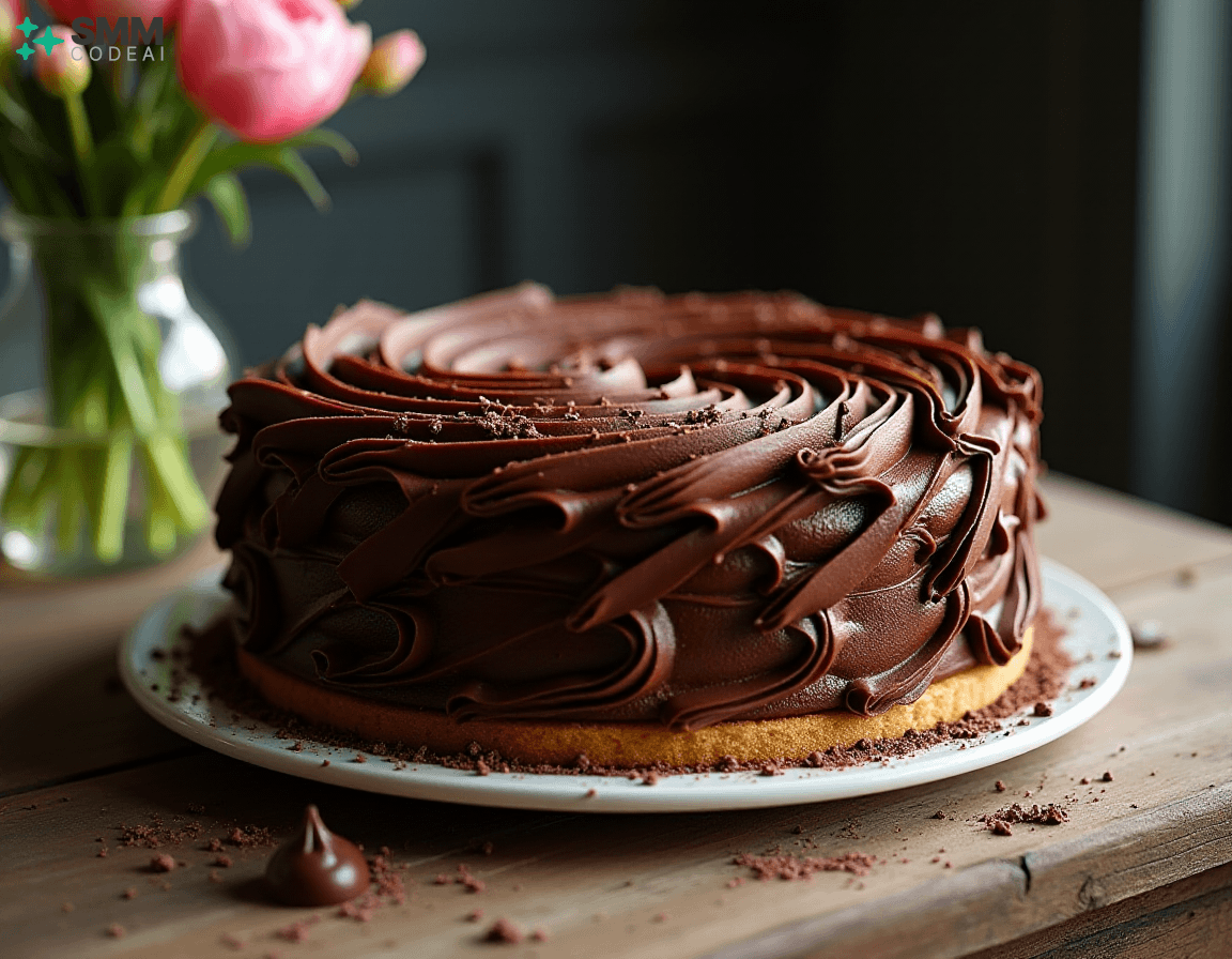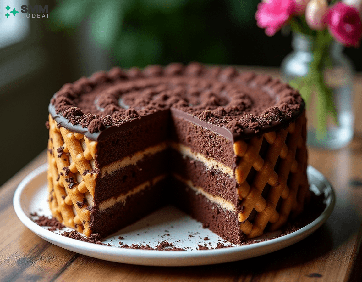 A stunningly beautiful chocolate lattice cake with intricate layers of rich, decadent chocolate and crisp, buttery biscuit crust. Each layer is adorned with delicate piping, creating a mesmerizing visual effect. The top is crowned with a sprinkle of dark chocolate shavings, adding depth and elegance to the dessert. Soft natural lighting highlights the intricate details and textures, casting soft shadows that enhance the beauty of the cake. A rustic wooden table with a glass vase filled with fresh flowers provides a perfect backdrop for this stunning display of culinary artistry. Capture every exquisite element, from the golden-brown biscuit crust to the dark chocolate shavings on top, in high detail to create an image that will leave viewers spellbound and eager to taste the deliciousness hidden within.