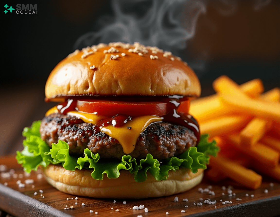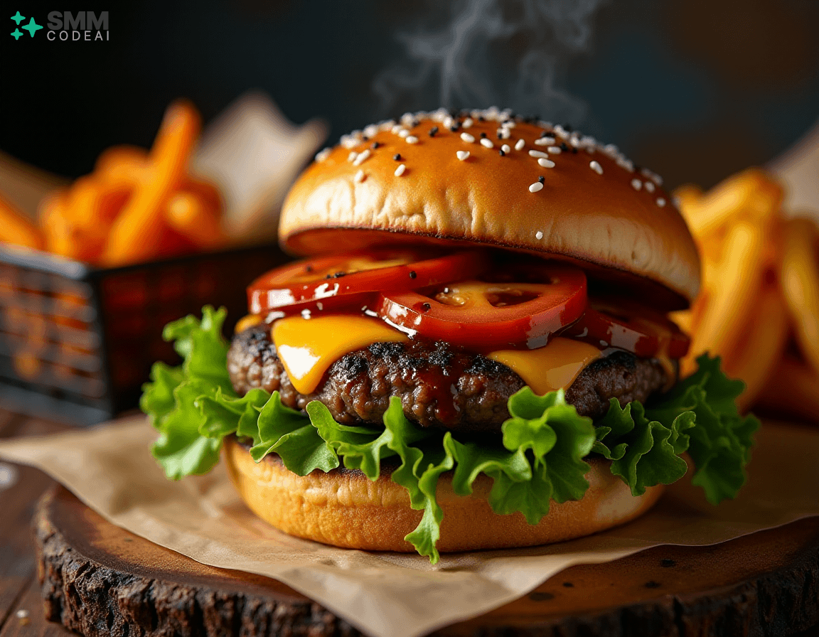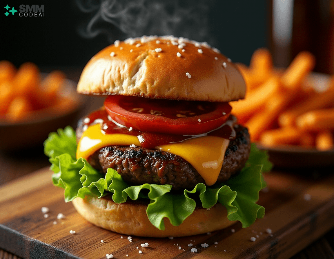 A perfectly grilled burger, its juicy patty glistening with a caramelized crust, nestled between a lightly toasted brioche bun, golden and slightly crisp. Fresh, vibrant green lettuce peeks out from the bottom slice, topped with a slice of ripe, ruby-red tomato and a generous layer of melted cheddar, oozing slightly. A drizzle of rich, smoky barbecue sauce glistens atop the burger, with a sprinkle of cracked black pepper for contrast. The beef patty should be cooked to medium-rare perfection, with a charred exterior that adds depth of flavor. Set on a rustic wooden table, surrounded by hand-cut, golden-brown fries dusted with sea salt and a side of sweet potato fries, the scene is enhanced by warm, soft lighting that casts a gentle glow, highlighting the textures and colors. The composition captures the burger slightly off-center, inviting the viewer's eye to explore the delicious details. This image embodies rustic food photography, evoking the mouthwatering aroma of grilled meat and the satisfying crunch of fresh vegetables, with steam subtly rising from the burger, promising an unforgettable bite.