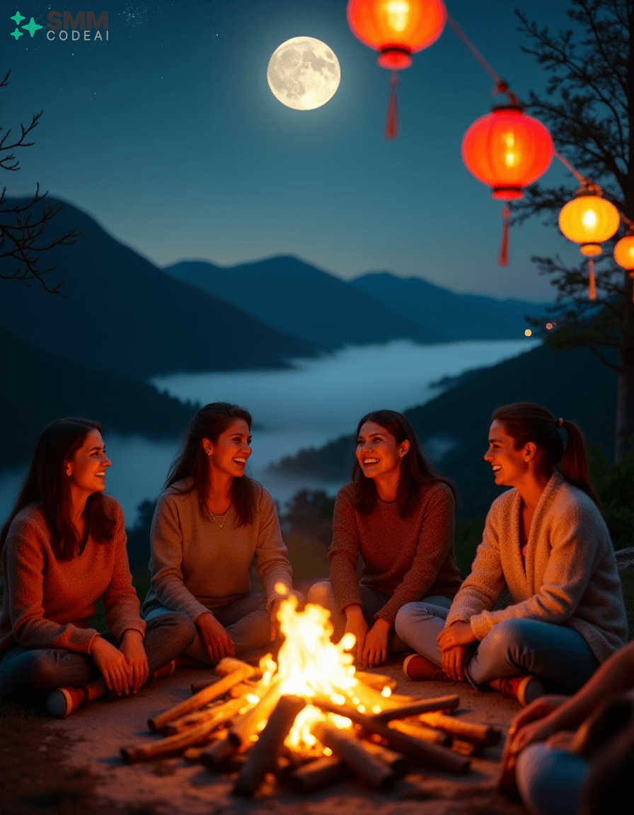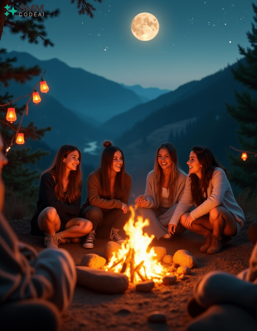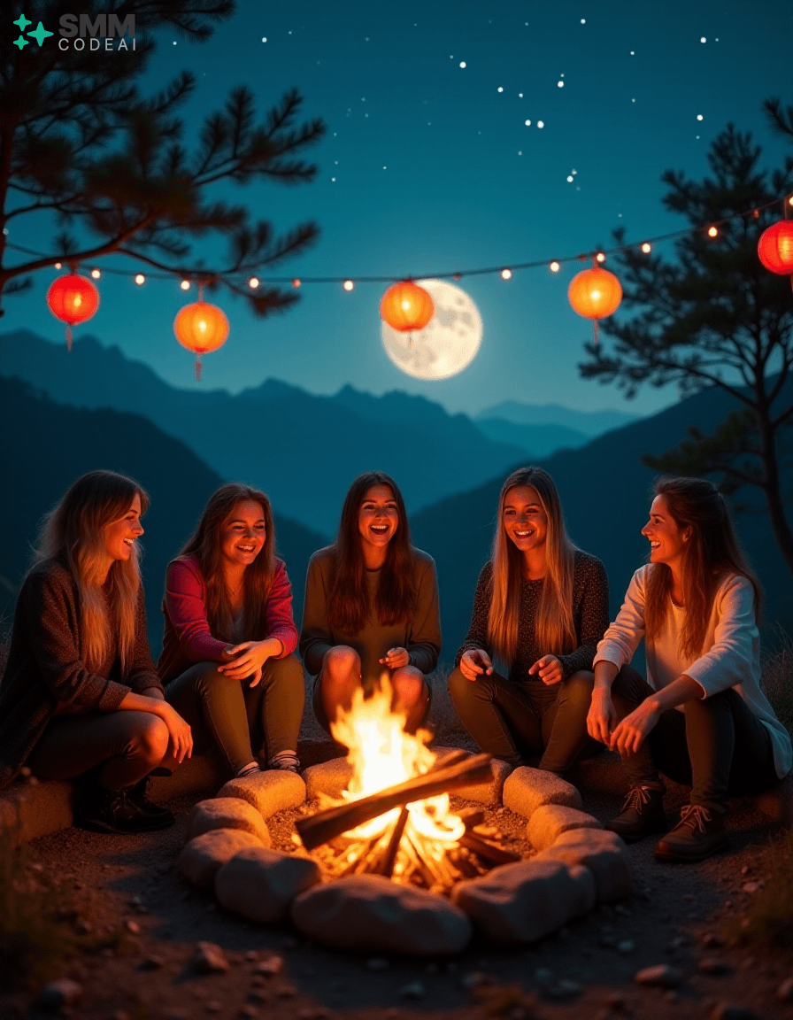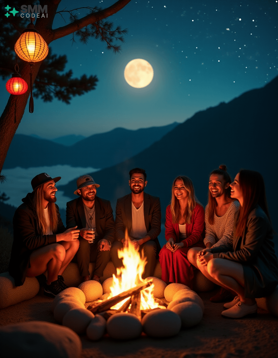 Create an eye-catching photograph capturing a group of friends gathered around a cozy outdoor bonfire under the warm glow of the full moon. The scene is set in a scenic mountainous area with soft mist rolling through the valleys and twinkling stars above. Each friend wears stylish, contrasting outfits, their laughter mingling with the crackling fire and gentle breeze. Brightly colored lanterns hang from nearby trees, adding a festive touch to the night. The atmosphere is lively yet intimate, highlighting the joy of friendship and the beauty of nature under the moonlight. Use a shallow depth of field to focus on the faces of the friends while softly blurring the background, emphasizing their connection in this magical moment.