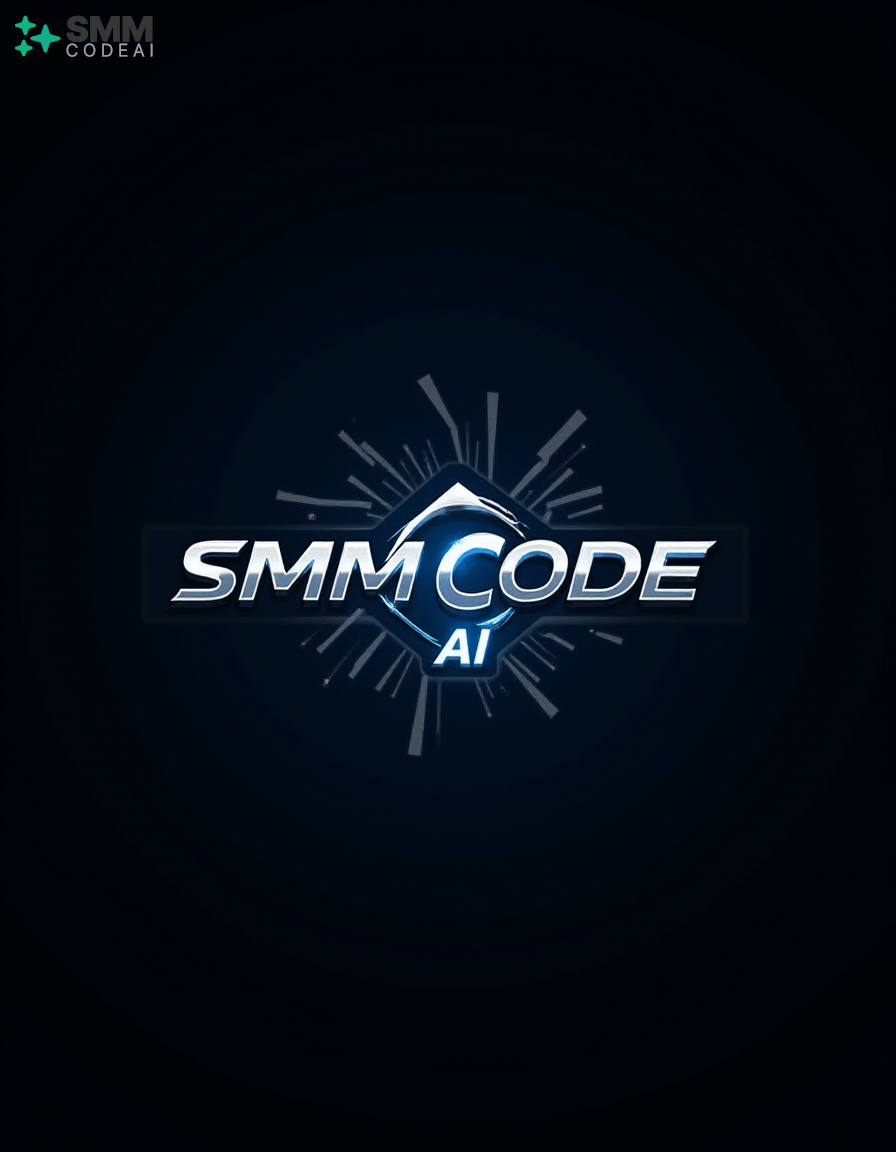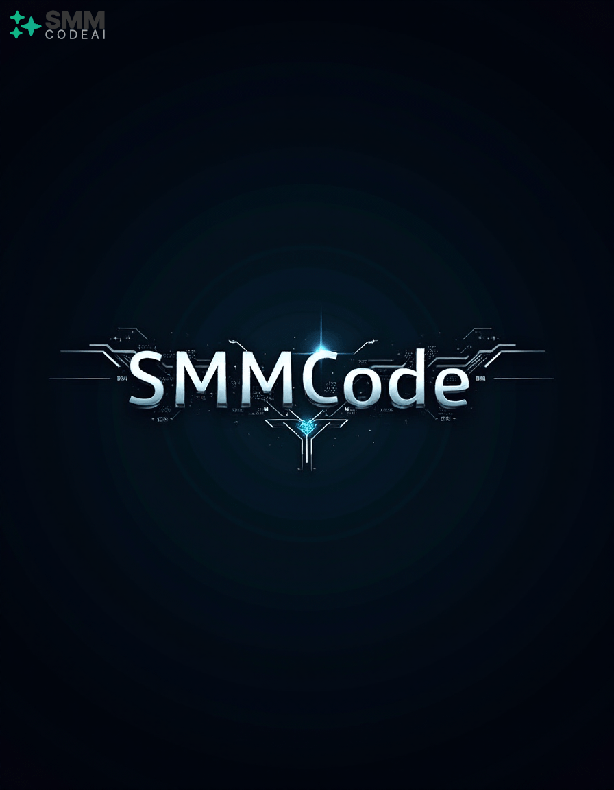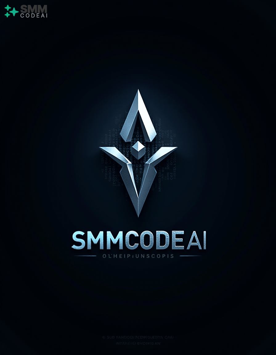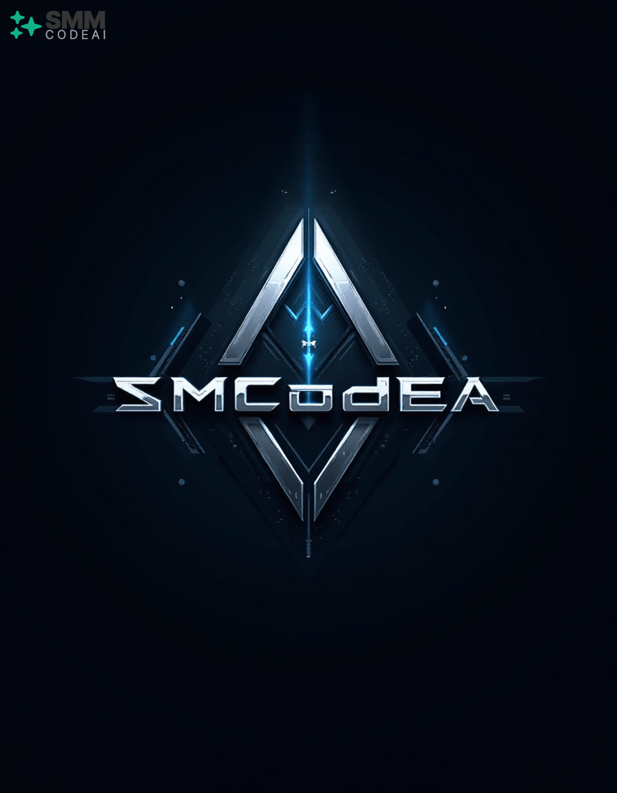 Create a bold and futuristic logo for SMMCode AI in a cyberpunk style. Use sharp, angular lines and metallic colors such as silver, chrome, and deep blues to evoke a sense of technology and high-tech. Incorporate digital elements like binary code, holograms, or circuitry patterns. The name "SMMCode AI" should be prominently displayed in a clean, modern font with a futuristic twist. Consider using a sleek, geometric shape or abstract design as the central element of the logo to represent innovation and intelligence. Ensure that the logo is versatile enough for different mediums and applications while maintaining its unique cyberpunk aesthetic.