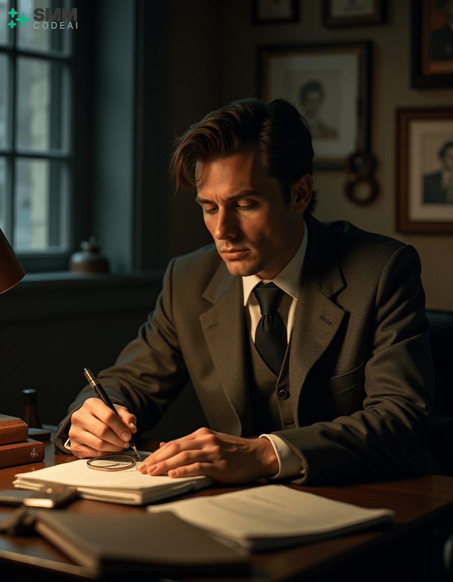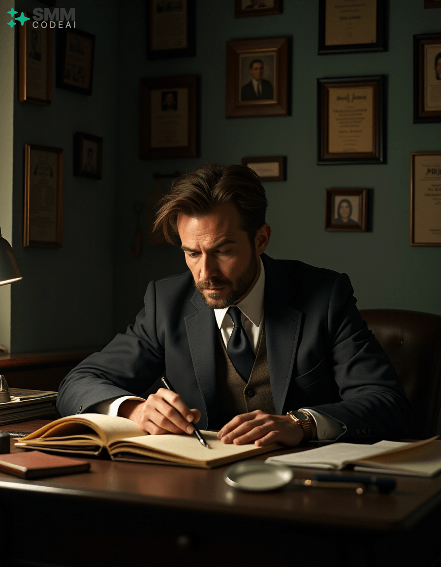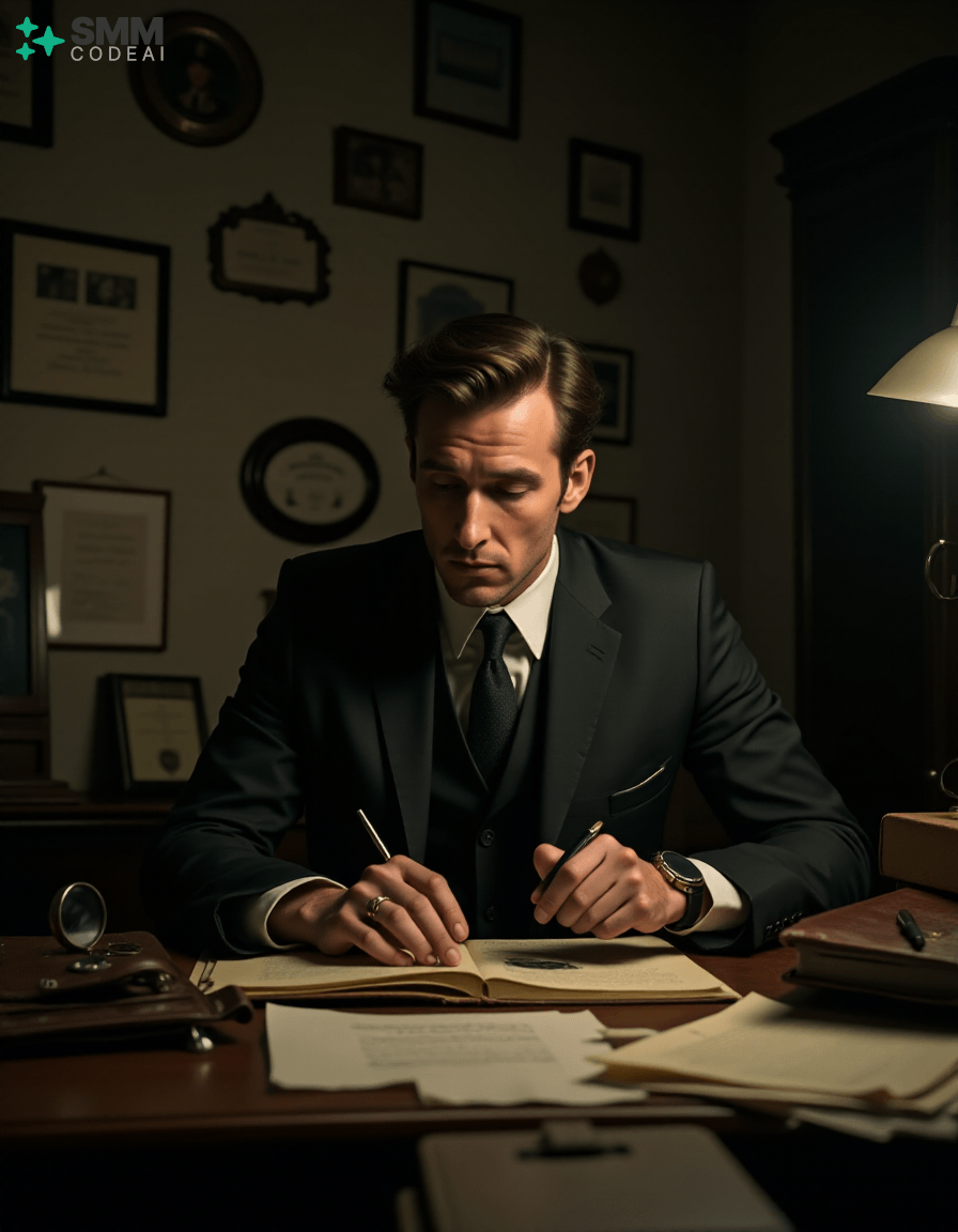 Create an atmospheric portrait of a vintage detective sitting at his cluttered desk in a dimly lit, old-fashioned police station. He wears a well-worn suit with a crisp shirt and a sharp tie, displaying a thoughtful expression as he reviews a stack of papers and a magnifying glass. His hair is neatly combed, but slightly tousled from the day's work. The walls are lined with framed photos and awards, creating an aura of professionalism and experience. The desk is filled with various tools and items used in his investigation, including a leather-bound notebook, a penlight, and a pair of handcuffs hanging on the wall. The lighting is soft and warm, casting shadows that accentuate his features and create a cozy atmosphere. Use a 50mm lens to capture the essence of his work while maintaining clarity in his expression. The mood should be nostalgic and intriguing, evoking a sense of mystery and adventure as the detective delves into solving a case.