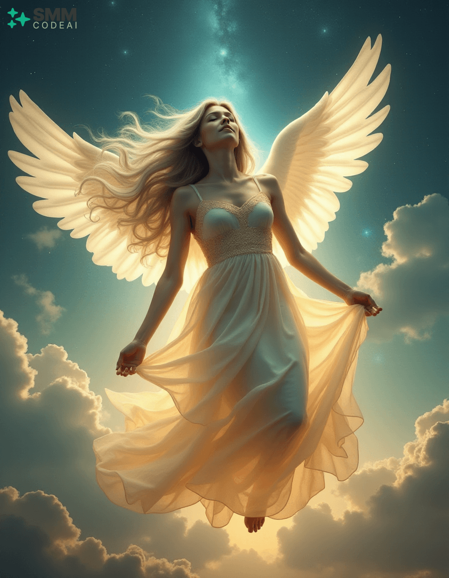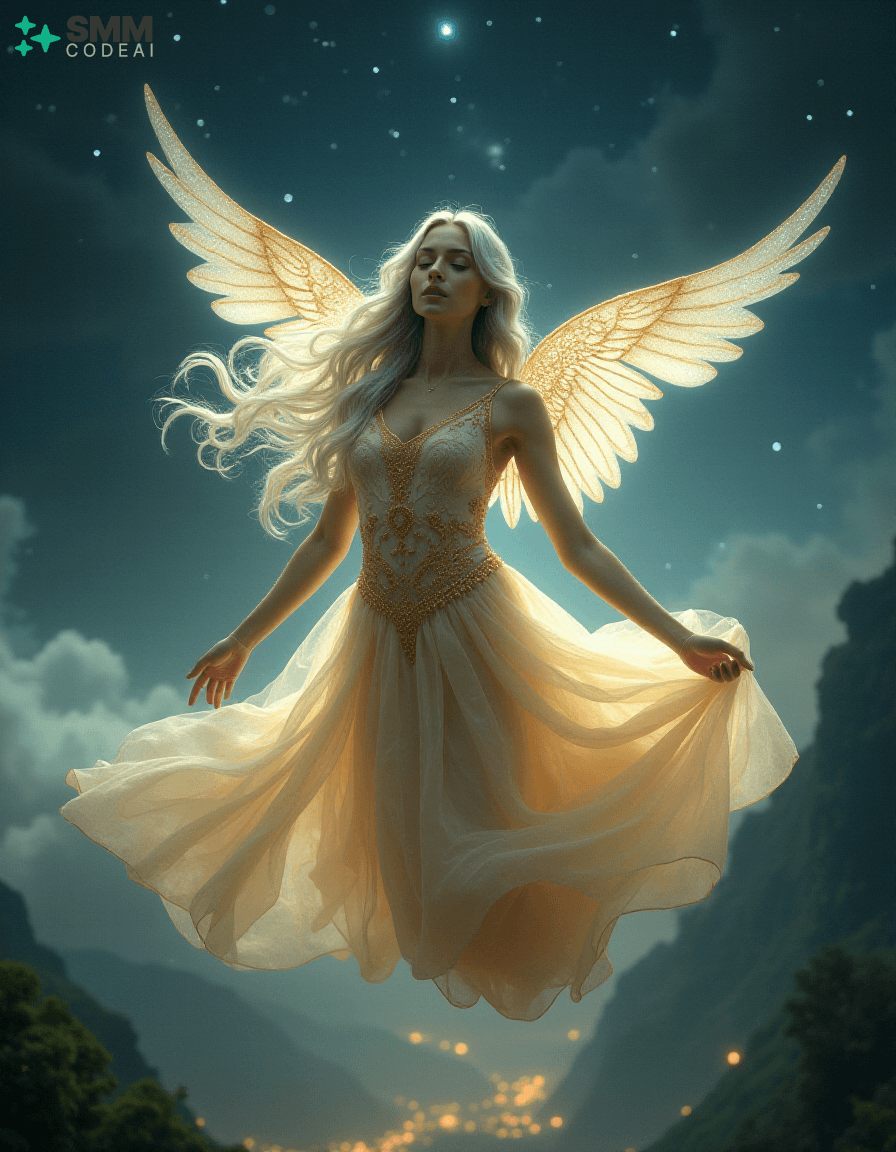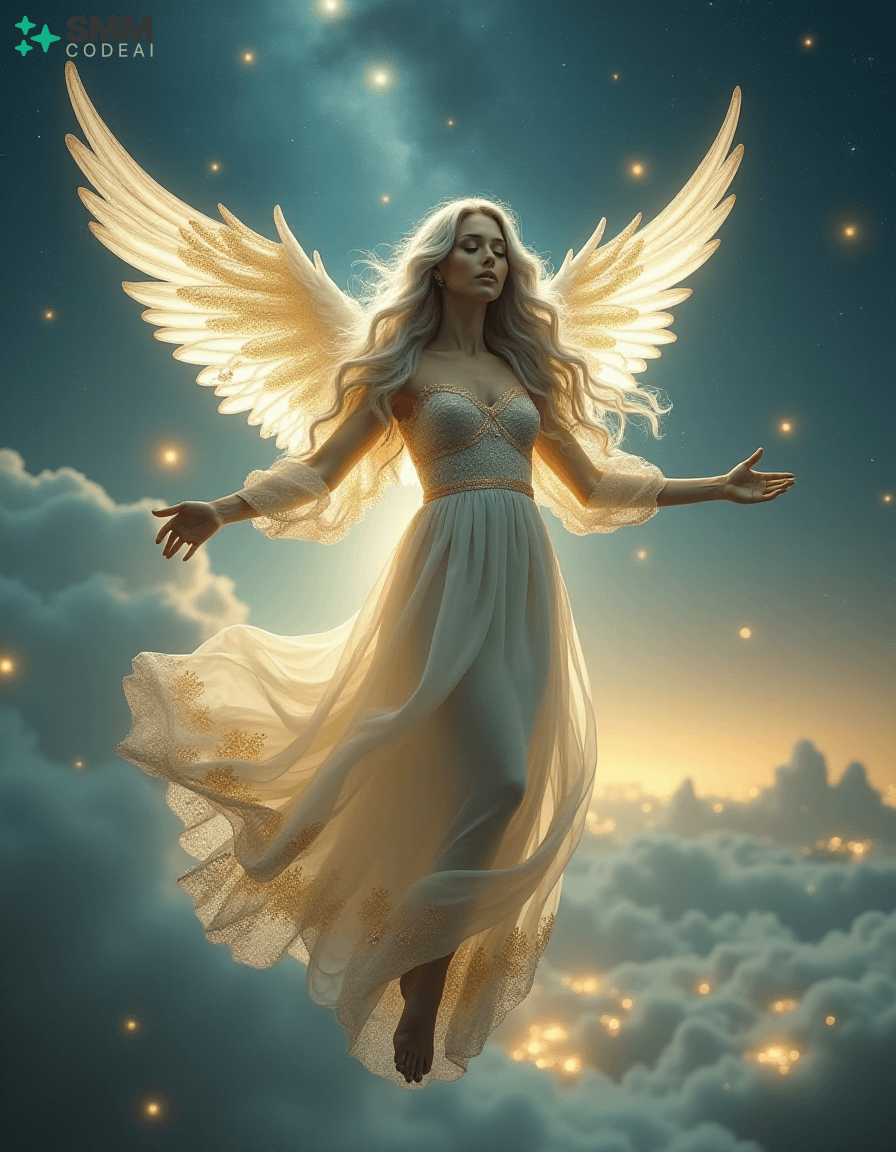 Create a captivating portrait of an ethereal angel floating gracefully in mid-air. She wears a beautiful, flowing gown that is shimmering with divine light and adorned with intricate golden patterns. Her hair is long and cascades down her back, with a touch of silver mixed among the soft, white strands. She has a serene expression on her face, and her eyes are closed as if in deep meditation or contemplation. The background should feature a vast expanse of stars twinkling above, with a faint glow emanating from an ethereal city below. The lighting is soft and magical, casting gentle shadows that highlight her features and create a sense of otherworldly beauty. Use a 50mm lens to capture the intimate details of her face while softly blurring the background, emphasizing the peaceful atmosphere and the timeless beauty of nature. The mood should be otherworldly and mystical, capturing the essence of an ethereal angel's presence and the serenity it brings to those around her.