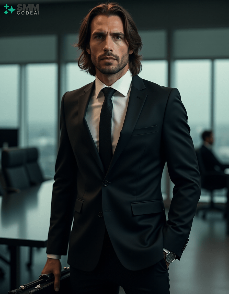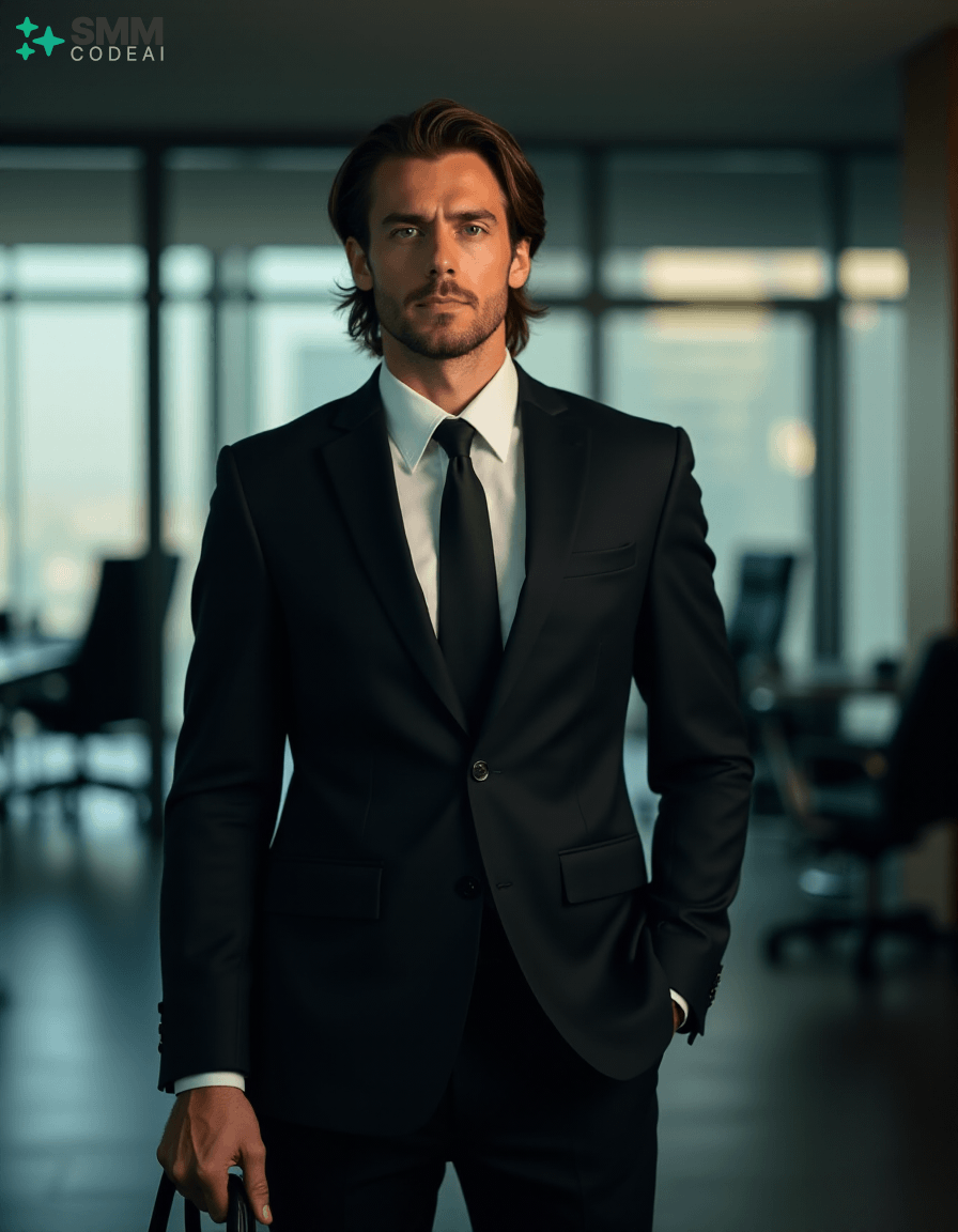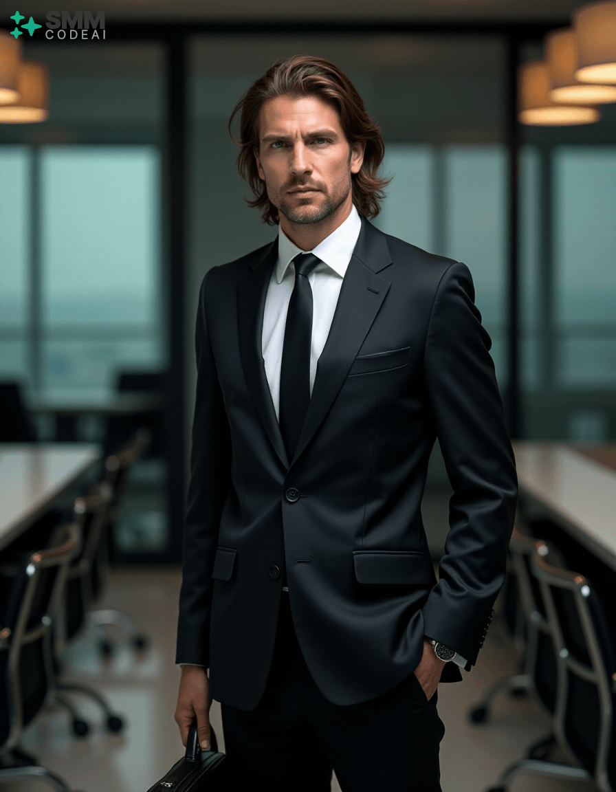 Create an authoritative portrait of a serious professional standing in a modern office setting. He wears a sharp black suit with a crisp white shirt and a stylish tie, conveying a sense of professionalism and competence. His long, neatly styled hair is slightly tousled from the day's work, and his face is set in a determined expression. He holds a briefcase firmly in one hand, ready to address an important meeting or client interaction. The background should feature a high-tech conference room with modern furniture and sleek, reflective surfaces. The lighting is soft and professional, casting shadows that highlight his features and create a sense of confidence and reliability. Use a 50mm lens to capture the intimate details of his face while maintaining clarity in his expression. The mood should be serious and focused, capturing the essence of a professional who embodies expertise and dedication in their work.