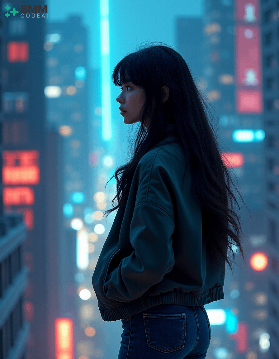 Create a portrait of a visionary woman standing in her futuristic city apartment, with a look of determination on her face as she looks out over a sprawling metropolis bathed in neon lights. Her long, flowing hair is styled in loose waves and falls just past her shoulders, framed by bold bangs that are a striking contrast to the sleek geometric patterns of her outfit. She wears a stylish yet practical outfit, consisting of a fitted jacket with large pockets, paired with slim jeans and ankle boots. The background should feature high-rise buildings reaching towards the sky, their windows reflecting the bright city lights, and a holographic display floating above her shoulder. The lighting is dramatic, casting sharp shadows that accentuate her features and create an air of confidence and innovation. Use a 35mm lens to capture the energy and excitement of the moment while maintaining clarity in her expression. The mood should be energetic and forward-thinking, capturing the spirit of a visionary who sees beyond the ordinary and drives progress for the future.