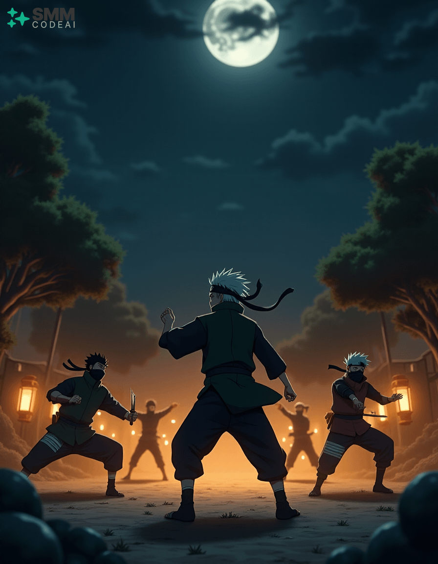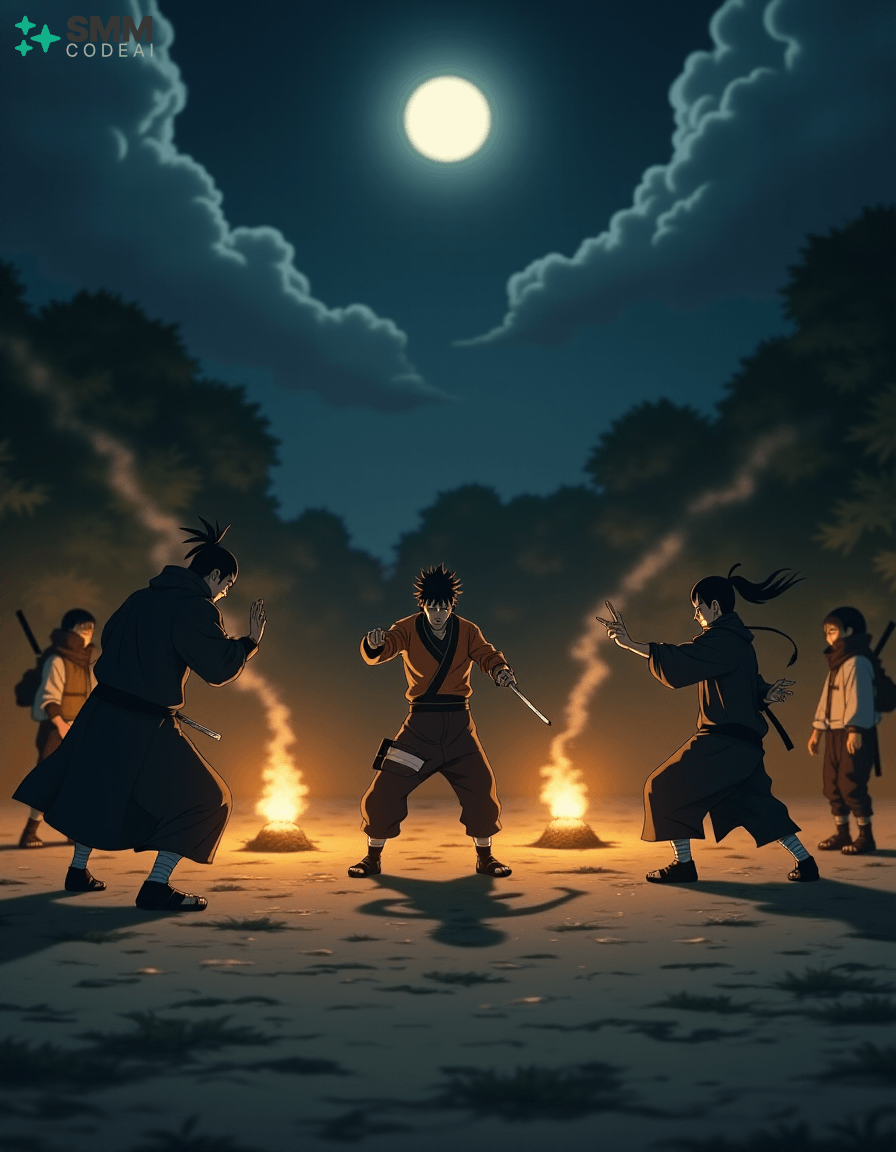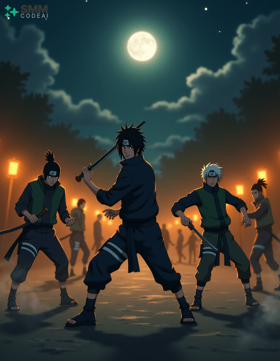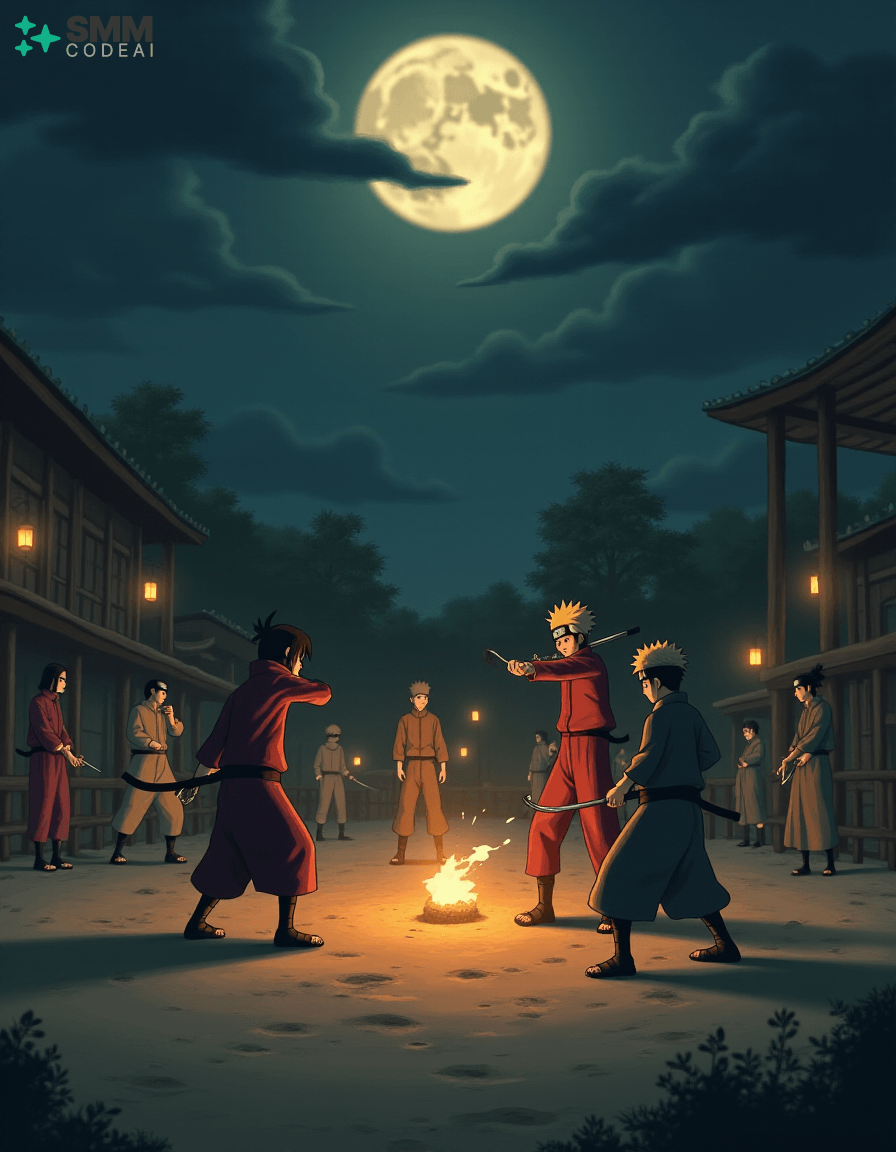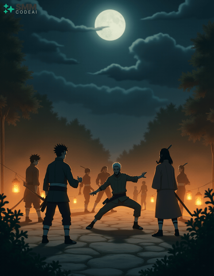 Compose an animated scene set in a dimly lit training ground at night in the Hidden Leaf Village. Show several adult ninja characters engaged in intense training exercises, each with their own unique techniques and expressions. Include characters like Orochimaru, Gaara, Kurenai, or any other mature ninja from the Naruto series. Depict them in various postures, such as performing a jutsu, practicing taijutsu, or working on weapons training. Use warm, golden tones for the moonlight casting soft shadows over their figures and highlighting their movements. Incorporate elements like flickering lanterns, smoke trails from their techniques, and the occasional sound of wind to create an atmosphere of tension and excitement. The scene should convey a sense of late-night dedication and determination among these seasoned ninja, with each character pushing themselves to their limits in pursuit of mastery and strength.