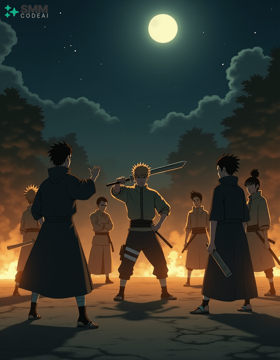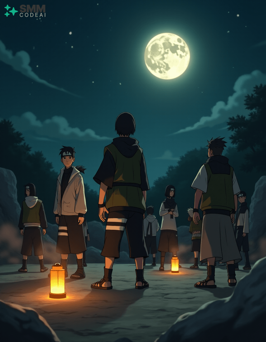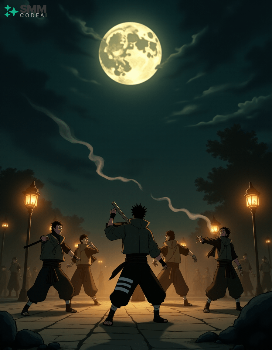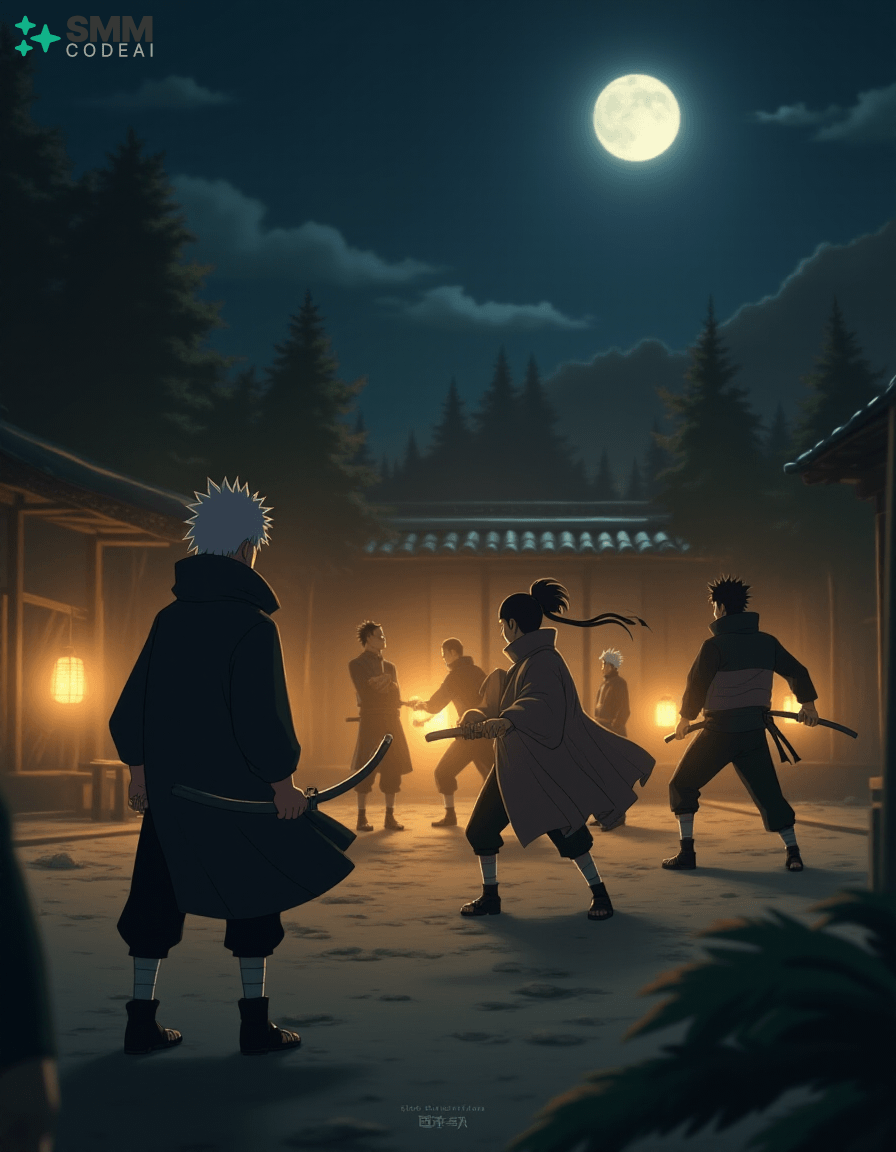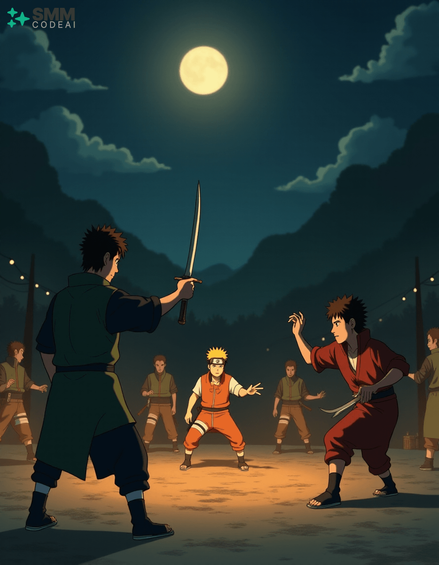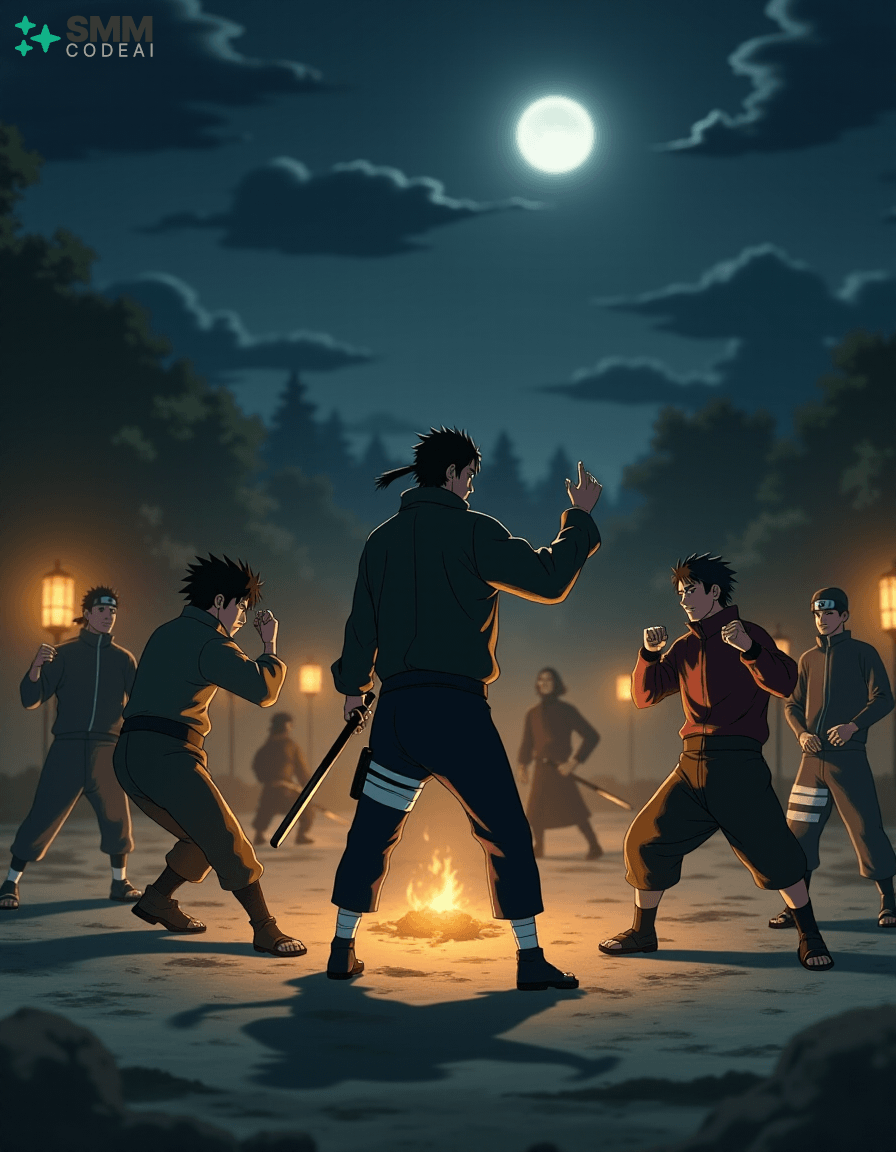 Compose an animated scene set in a dimly lit training ground at night in the Hidden Leaf Village. Show several adult ninja characters engaged in intense training exercises, each with their own unique techniques and expressions. Include characters like Orochimaru, Gaara, Kurenai, or any other mature ninja from the Naruto series. Depict them in various postures, such as performing a jutsu, practicing taijutsu, or working on weapons training. Use warm, golden tones for the moonlight casting soft shadows over their figures and highlighting their movements. Incorporate elements like flickering lanterns, smoke trails from their techniques, and the occasional sound of wind to create an atmosphere of tension and excitement. The scene should convey a sense of late-night dedication and determination among these seasoned ninja, with each character pushing themselves to their limits in pursuit of mastery and strength.