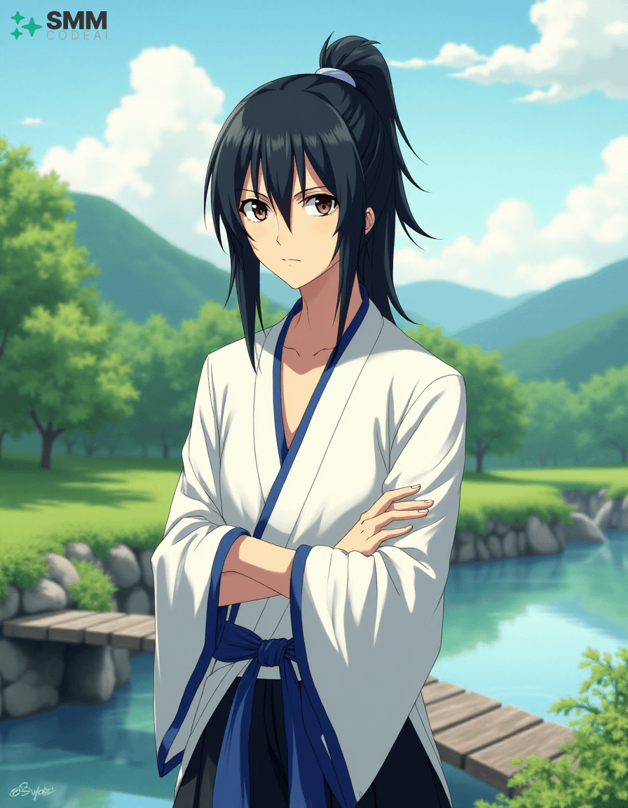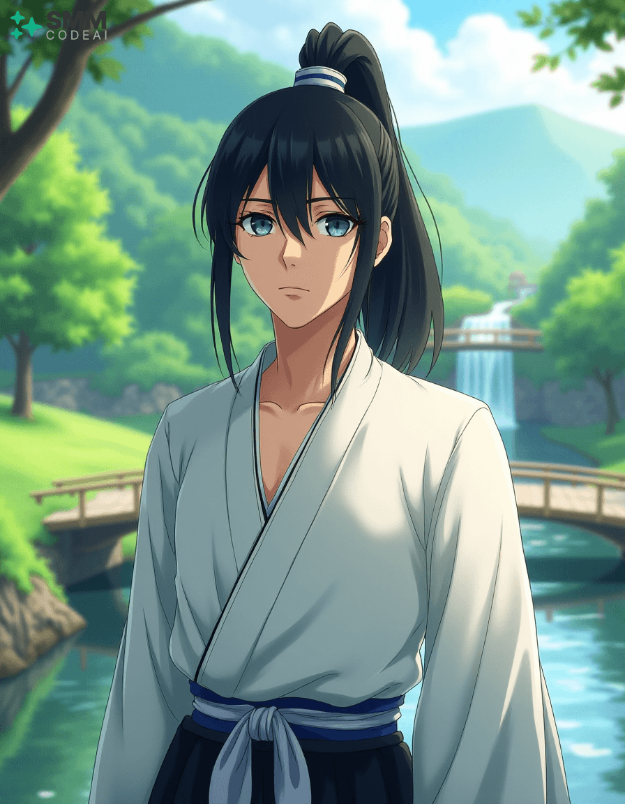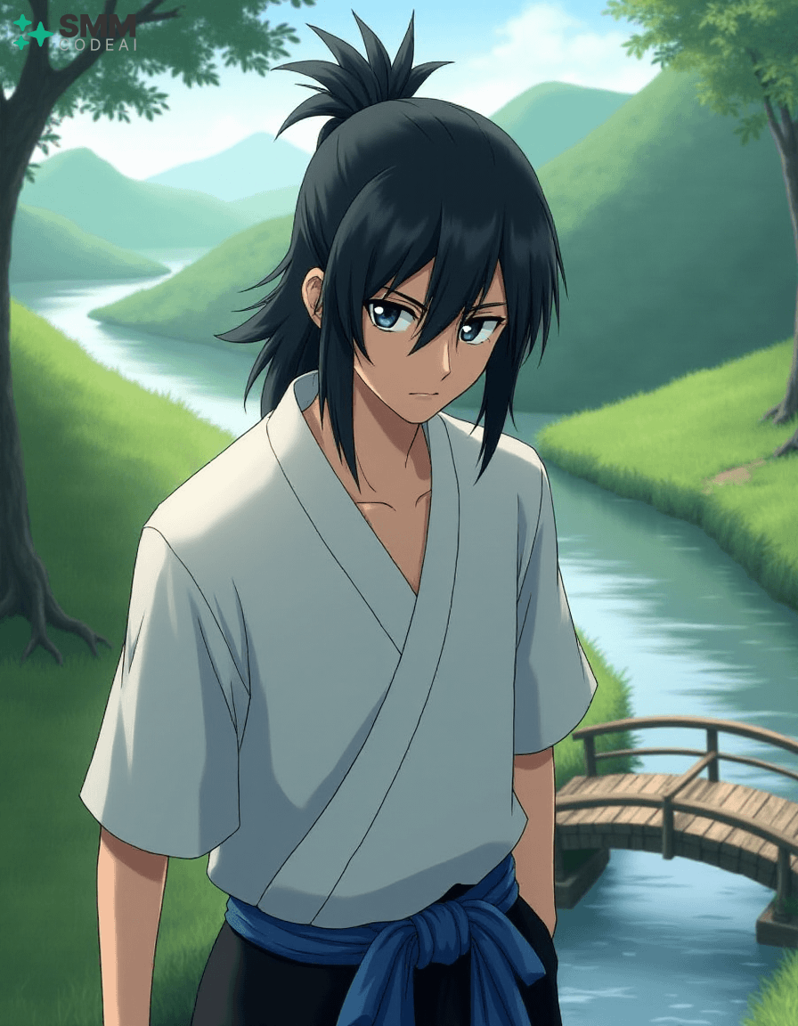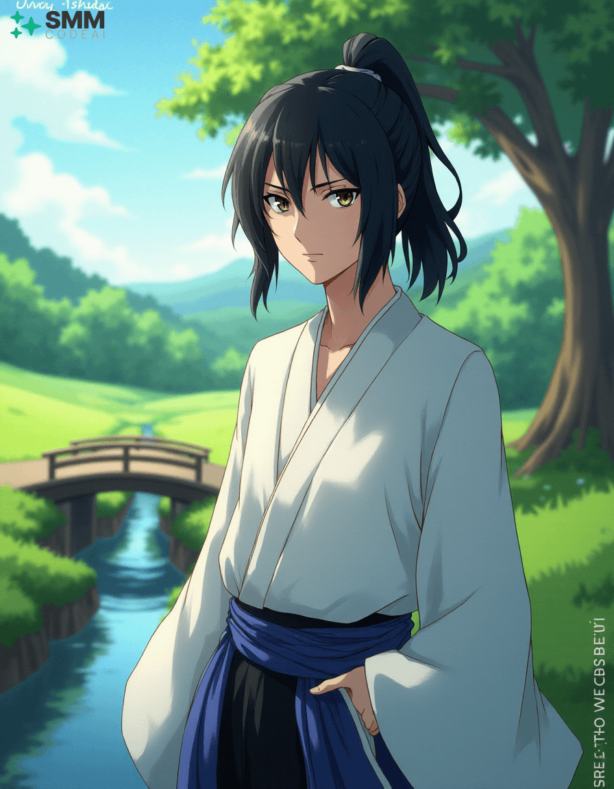 Create a serene portrait of Uryu Ishida from the anime series "Bleach." Uryu is depicted as a young man with shoulder-length, black hair tied into a high ponytail. His expressive eyes are framed by long, dark lashes and have a mischievous glint in them, reflecting his intelligence and sharp wit. He wears a traditional Zanpakuto Academy uniform with a white shirt, black pants, and the academy's blue sash. The background is a serene landscape, featuring lush greenery, rolling hills, and a small bridge over a calm stream. A gentle breeze blows through the trees, casting soft shadows on Uryu's features. Use soft, pastel colors to create a peaceful atmosphere, highlighting the tranquility and wisdom in Uryu's expression. The scene evokes a sense of adventure and camaraderie, showcasing the character's inner strength and resilience.