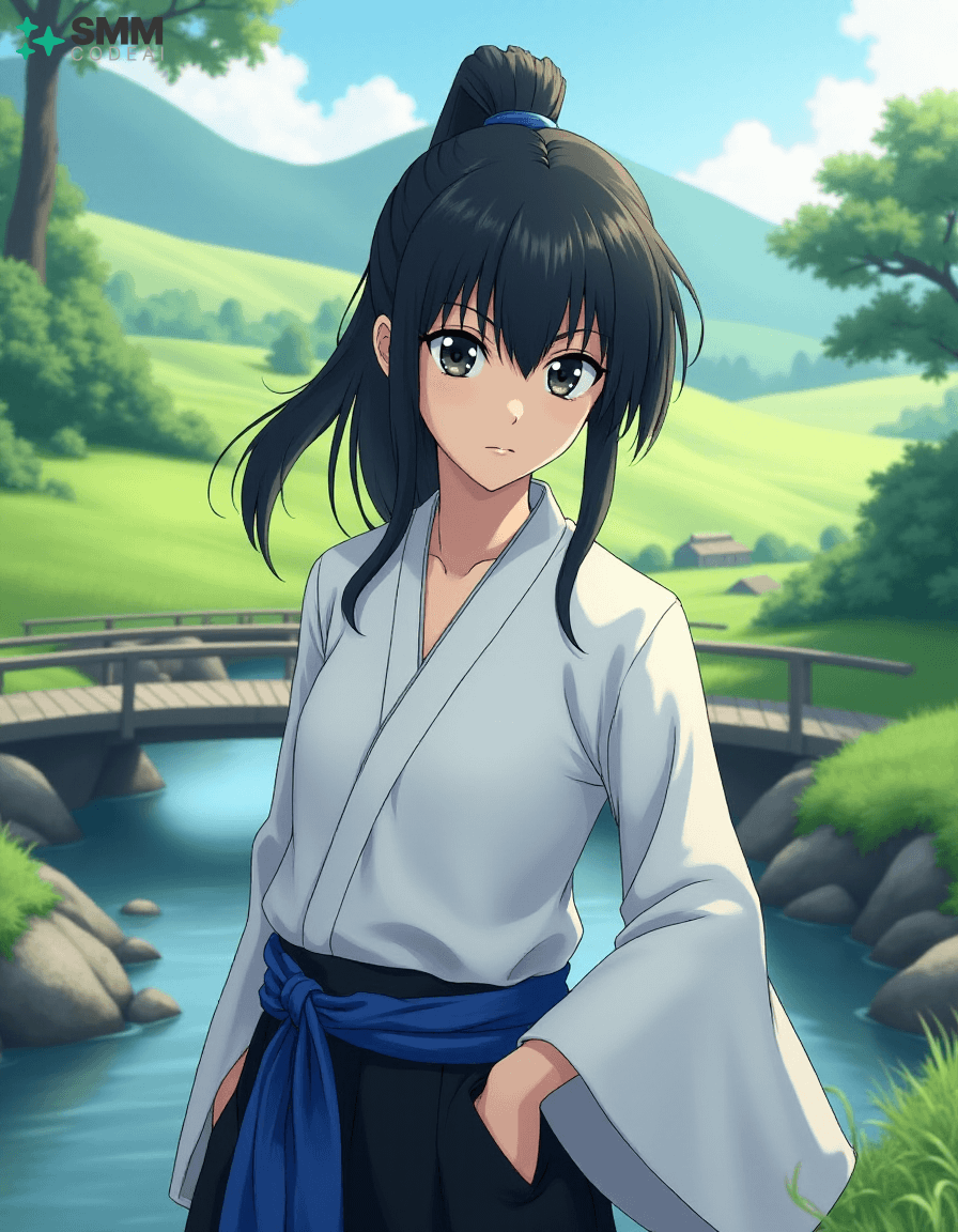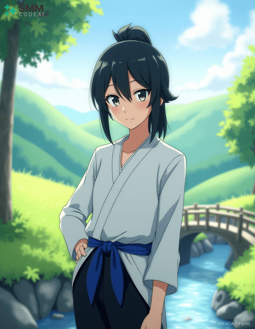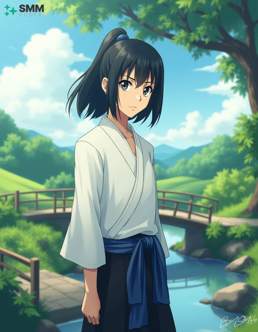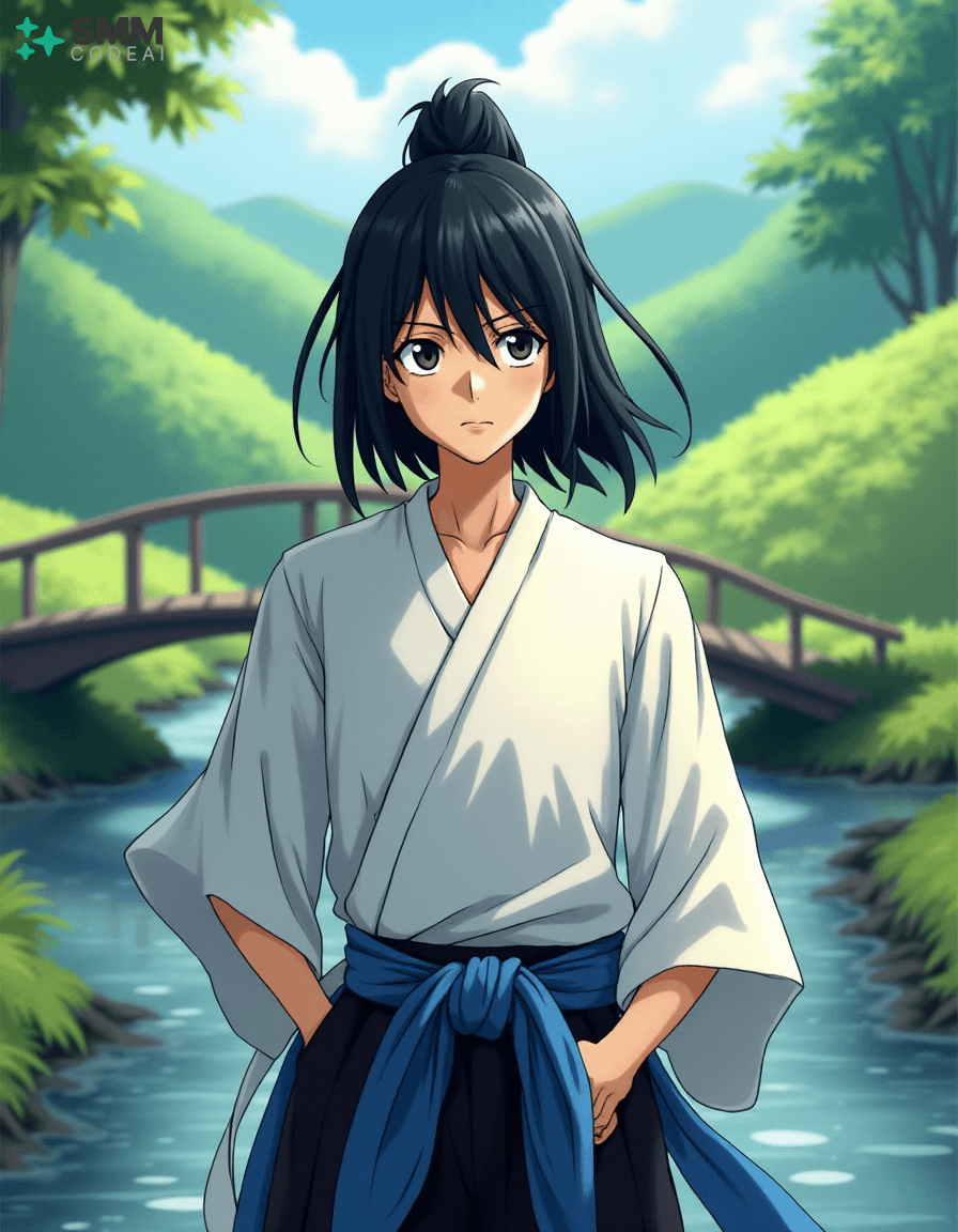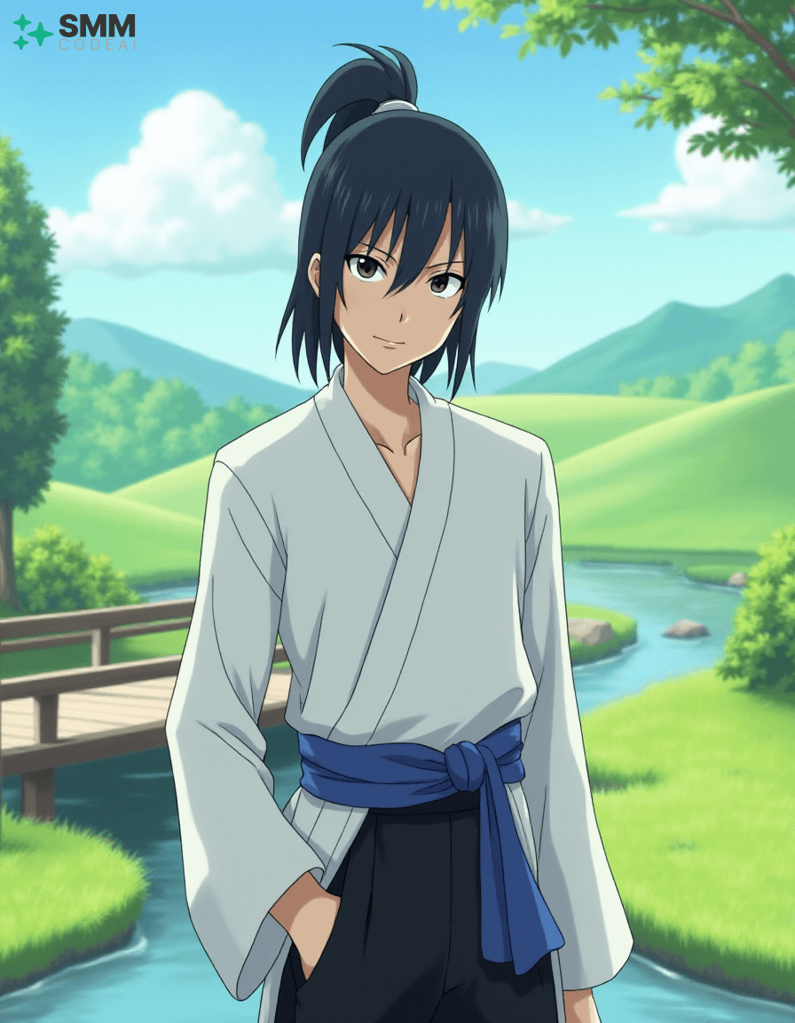 Create a serene portrait of Uryu Ishida from the anime series "Bleach." Uryu is depicted as a young man with shoulder-length, black hair tied into a high ponytail. His expressive eyes are framed by long, dark lashes and have a mischievous glint in them, reflecting his intelligence and sharp wit. He wears a traditional Zanpakuto Academy uniform with a white shirt, black pants, and the academy's blue sash. The background is a serene landscape, featuring lush greenery, rolling hills, and a small bridge over a calm stream. A gentle breeze blows through the trees, casting soft shadows on Uryu's features. Use soft, pastel colors to create a peaceful atmosphere, highlighting the tranquility and wisdom in Uryu's expression. The scene evokes a sense of adventure and camaraderie, showcasing the character's inner strength and resilience.