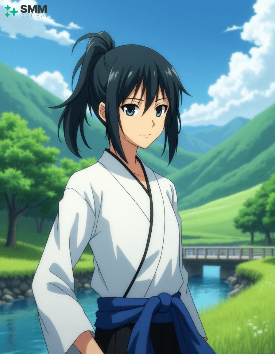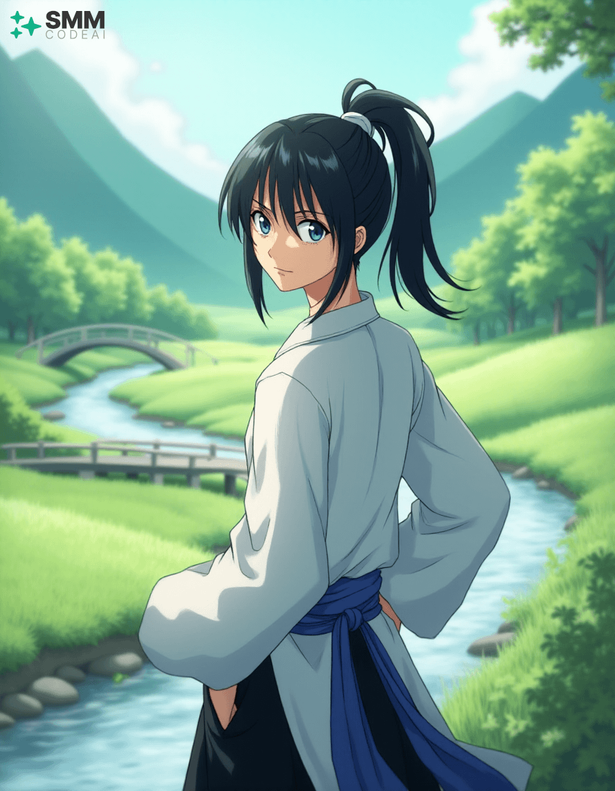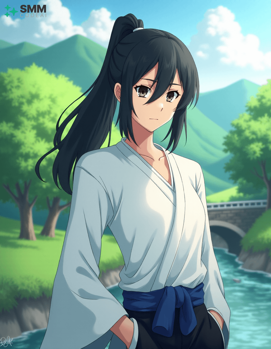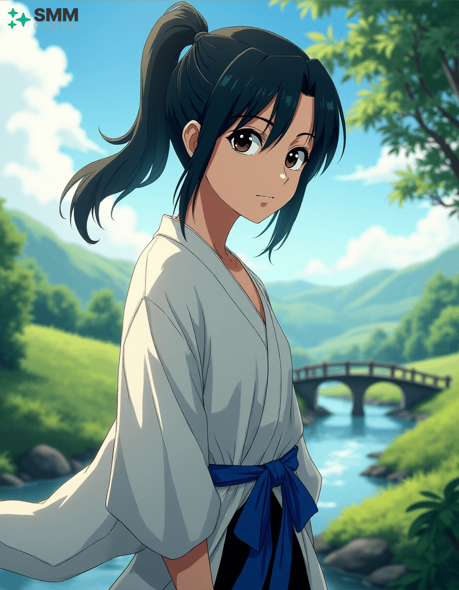 Create a serene portrait of Uryu Ishida from the anime series "Bleach." Uryu is depicted as a young man with shoulder-length, black hair tied into a high ponytail. His expressive eyes are framed by long, dark lashes and have a mischievous glint in them, reflecting his intelligence and sharp wit. He wears a traditional Zanpakuto Academy uniform with a white shirt, black pants, and the academy's blue sash. The background is a serene landscape, featuring lush greenery, rolling hills, and a small bridge over a calm stream. A gentle breeze blows through the trees, casting soft shadows on Uryu's features. Use soft, pastel colors to create a peaceful atmosphere, highlighting the tranquility and wisdom in Uryu's expression. The scene evokes a sense of adventure and camaraderie, showcasing the character's inner strength and resilience.