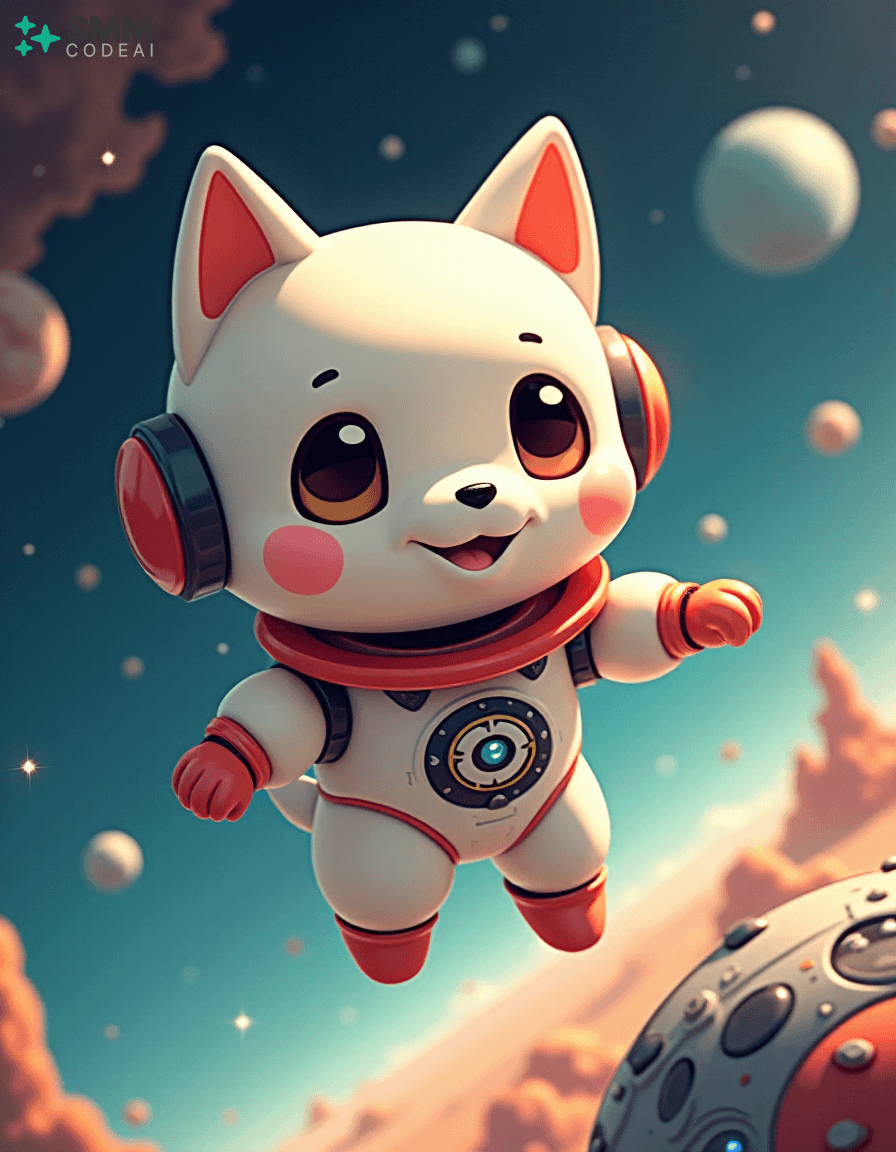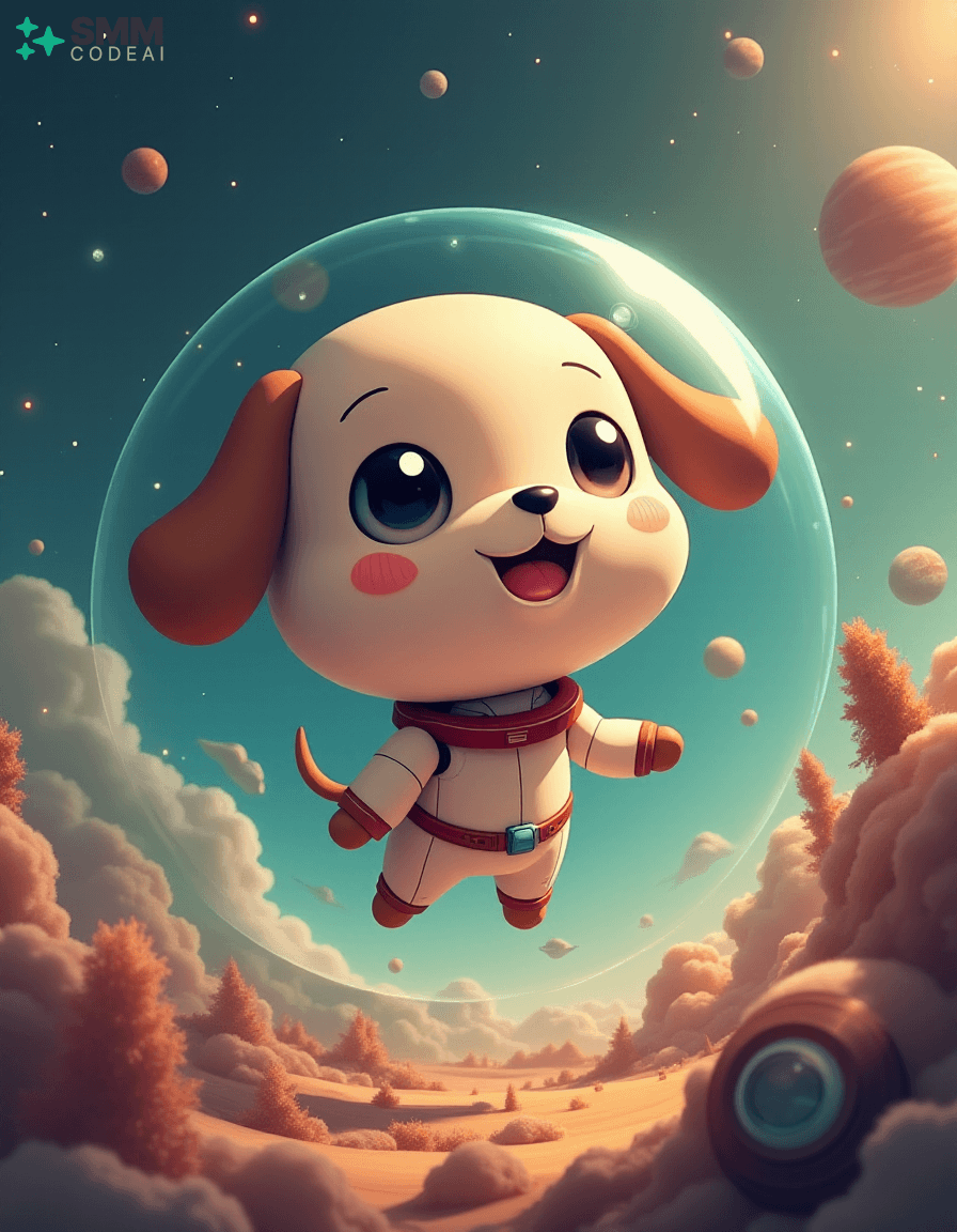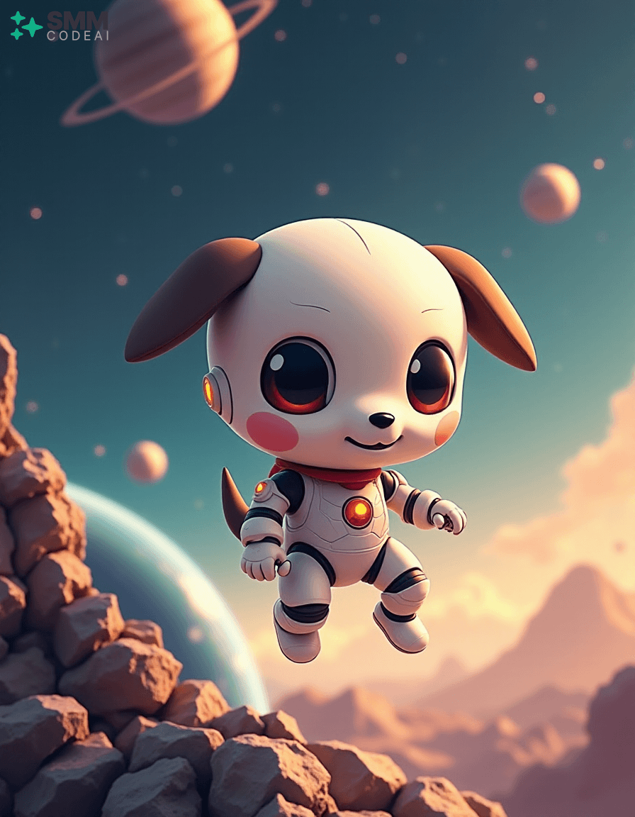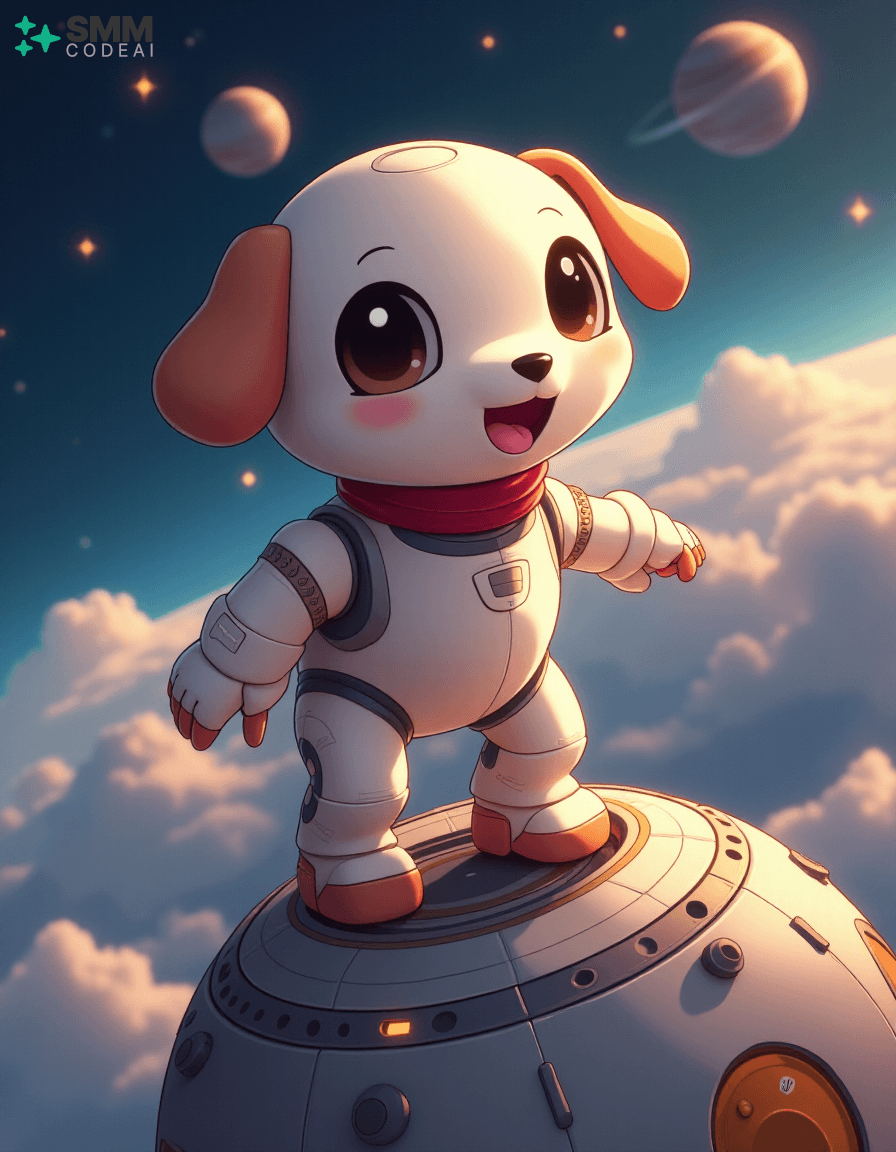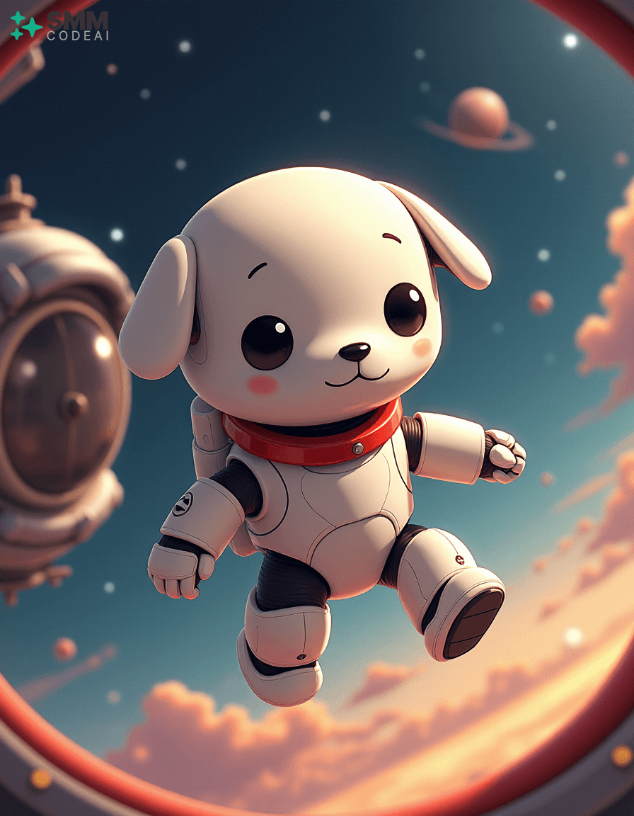 Create an image of a cute, anthropomorphic robot puppy exploring the vastness of space. The robot has soft, rounded features with big, round eyes and a small, expressive mouth. It is clad in a sleek, white suit with a red collar, giving it a friendly yet adventurous look. The background shows the robot floating around a spherical spaceship filled with various instruments and controls, suggesting that it is on an important mission. Stars and planets twinkle in the distance, creating a sense of wonder and excitement. The lighting should be soft and warm, casting gentle shadows on the robot's features and highlighting its playful expression. The overall atmosphere is charming and futuristic, capturing the essence of space exploration and adventure in an anime style.