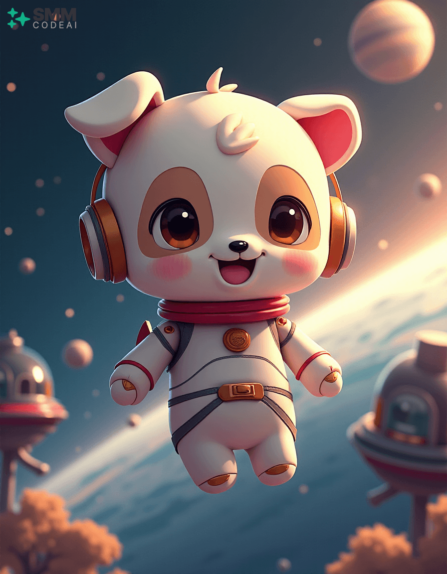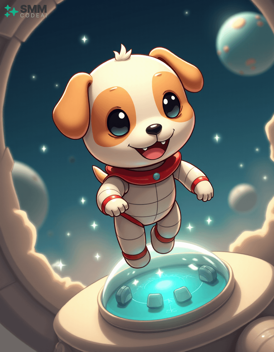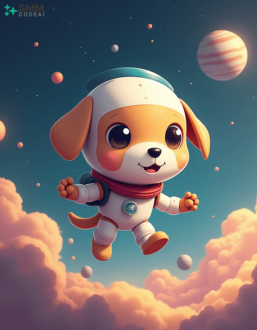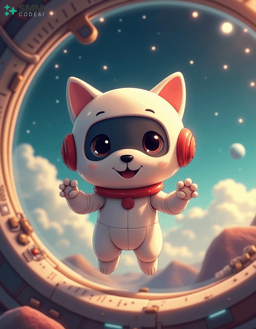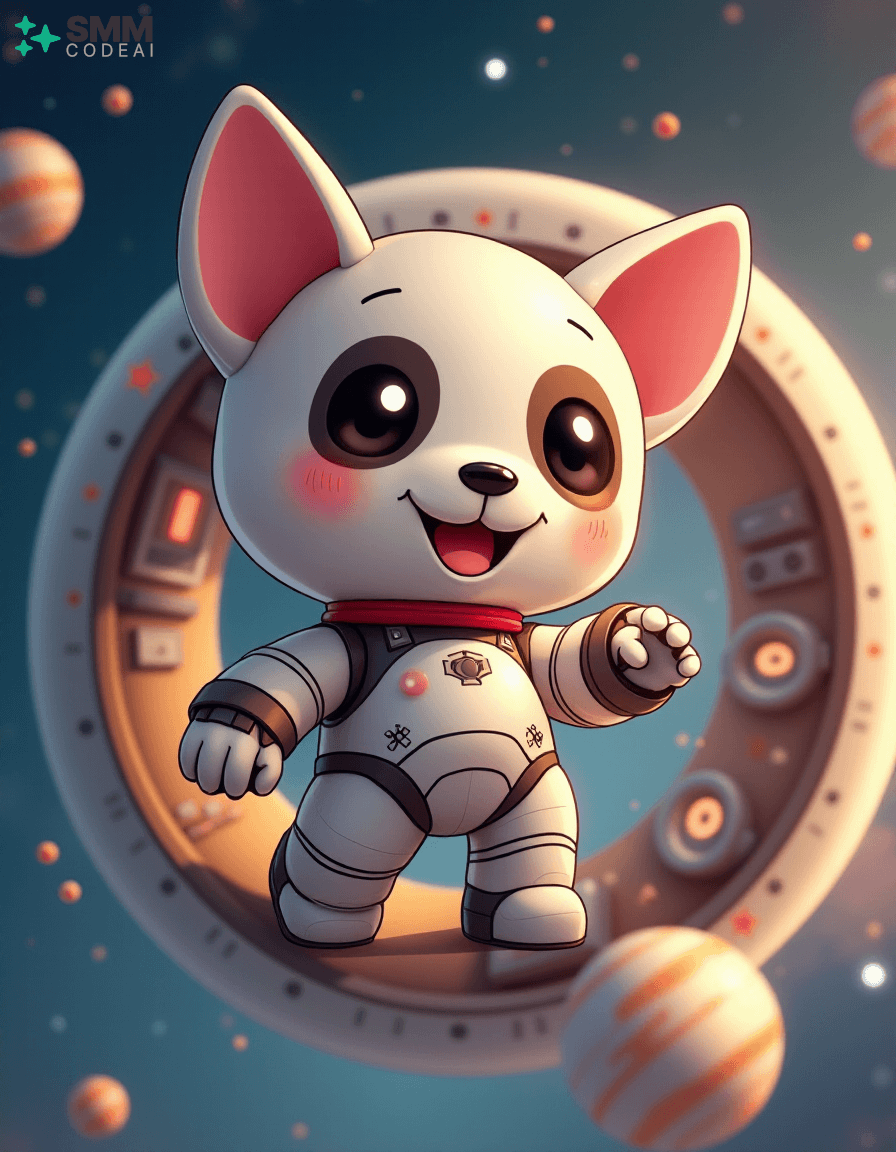 Create an image of a cute, anthropomorphic robot puppy exploring the vastness of space. The robot has soft, rounded features with big, round eyes and a small, expressive mouth. It is clad in a sleek, white suit with a red collar, giving it a friendly yet adventurous look. The background shows the robot floating around a spherical spaceship filled with various instruments and controls, suggesting that it is on an important mission. Stars and planets twinkle in the distance, creating a sense of wonder and excitement. The lighting should be soft and warm, casting gentle shadows on the robot's features and highlighting its playful expression. The overall atmosphere is charming and futuristic, capturing the essence of space exploration and adventure in an anime style.