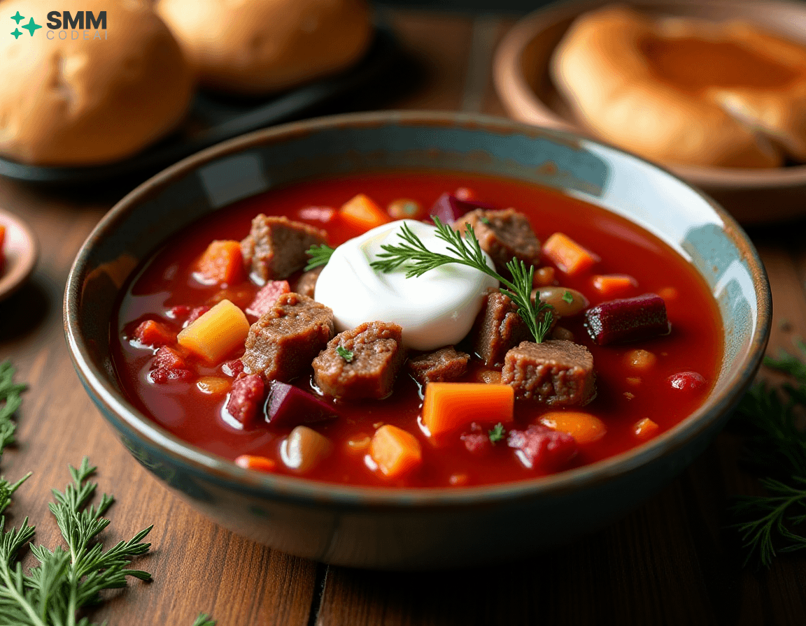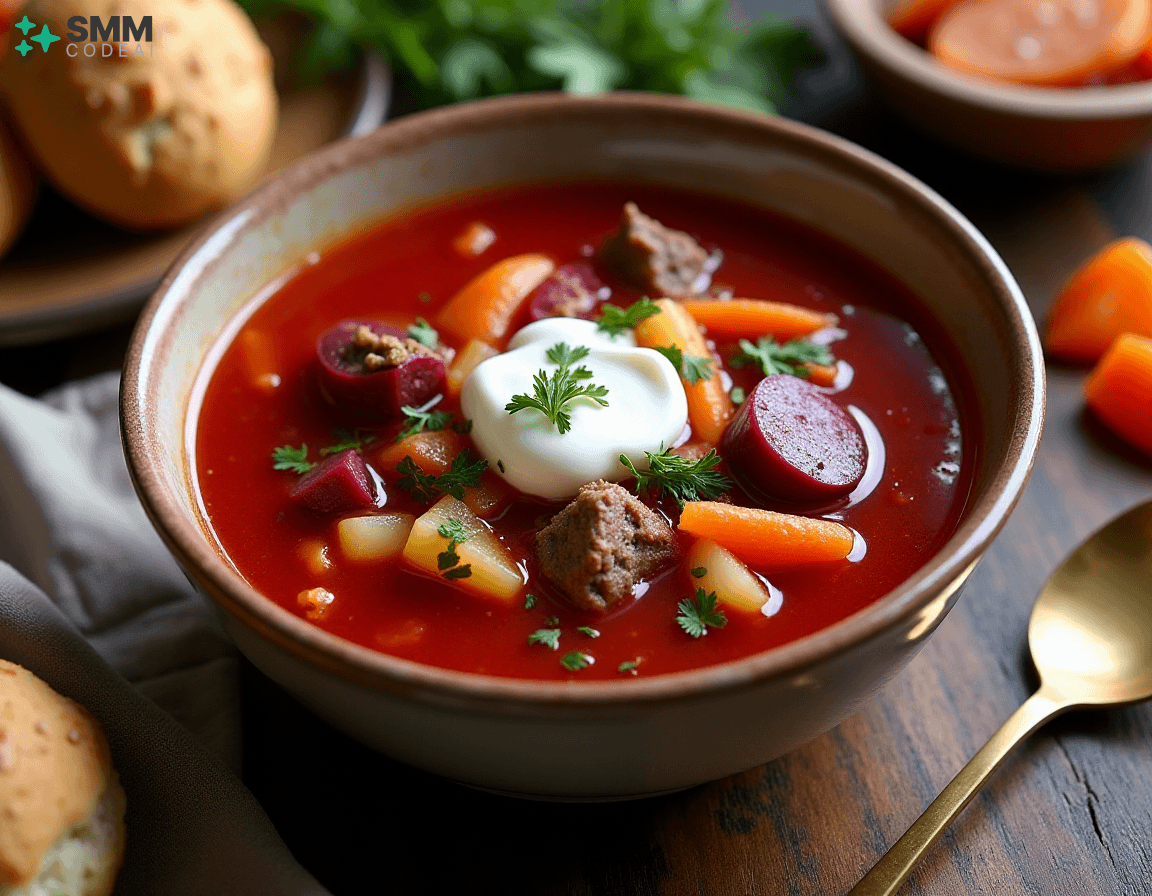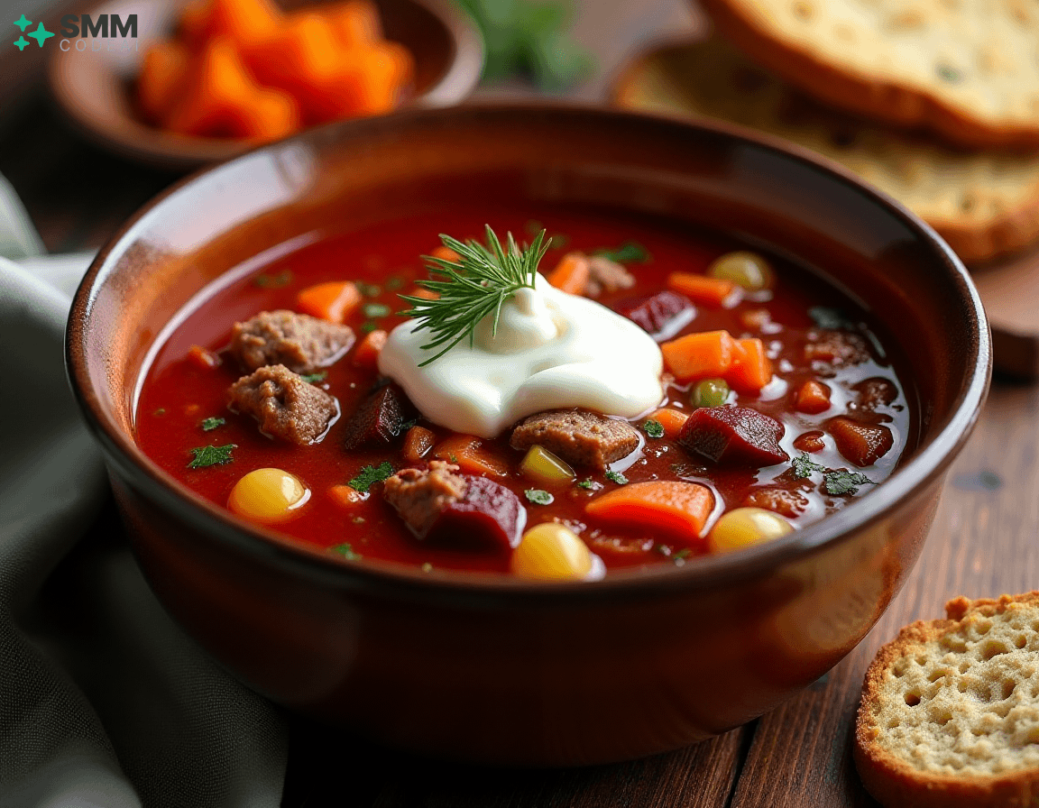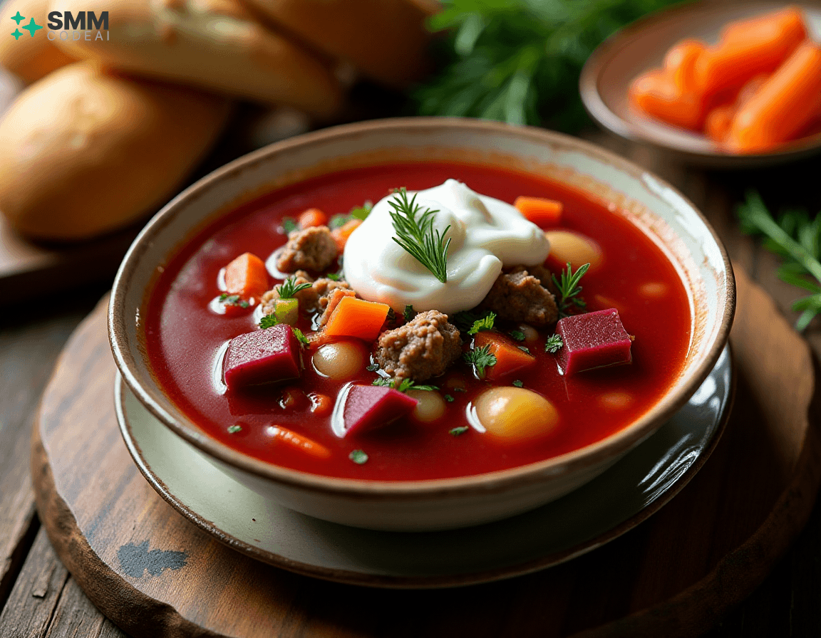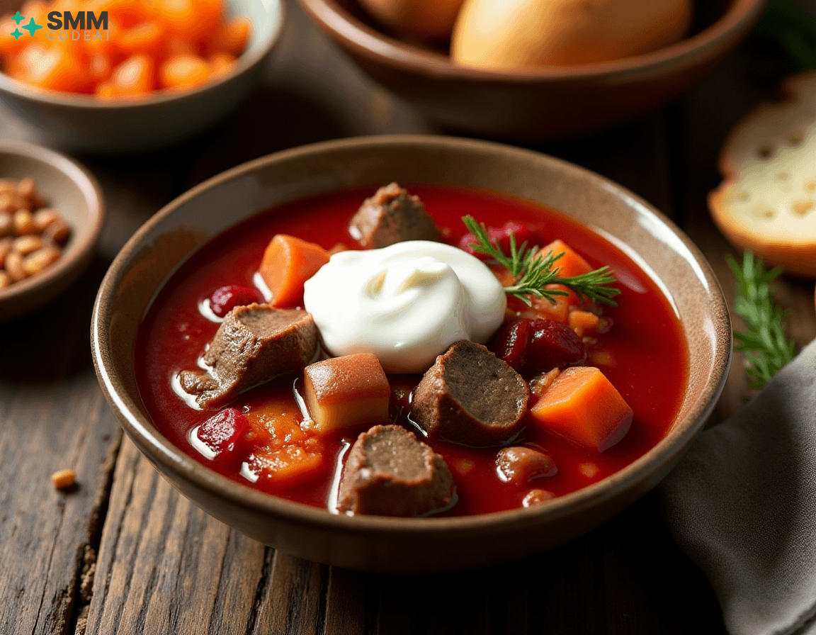 A hearty and comforting bowl of traditional Russian borscht, featuring a vibrant red soup base with tender pieces of beef and pork, simmered in a rich blend of tomato sauce and spices like dill, bay leaf, and sugar. Fresh beets contribute to the soup's deep red color and add natural sweetness. The vegetables such as shredded carrots, diced potatoes, and chopped celery provide texture and flavor. A dollop of sour cream on top adds a creamy contrast to the tartness of the borscht. Set against a wooden table with bread rolls, pickled herring, and a side of rye crust, the scene conveys warmth and nostalgia associated with Russian cuisine. Soft natural lighting highlights the rich colors and flavors, creating an inviting atmosphere that invites you to savor every delicious bite.