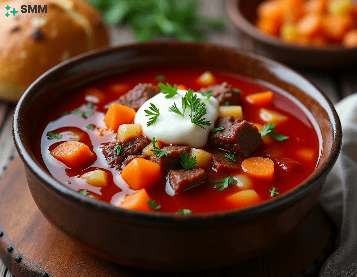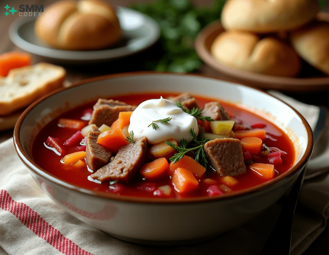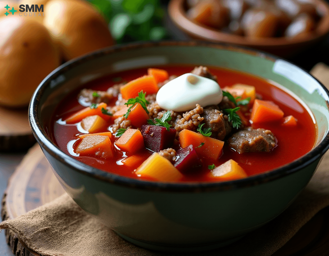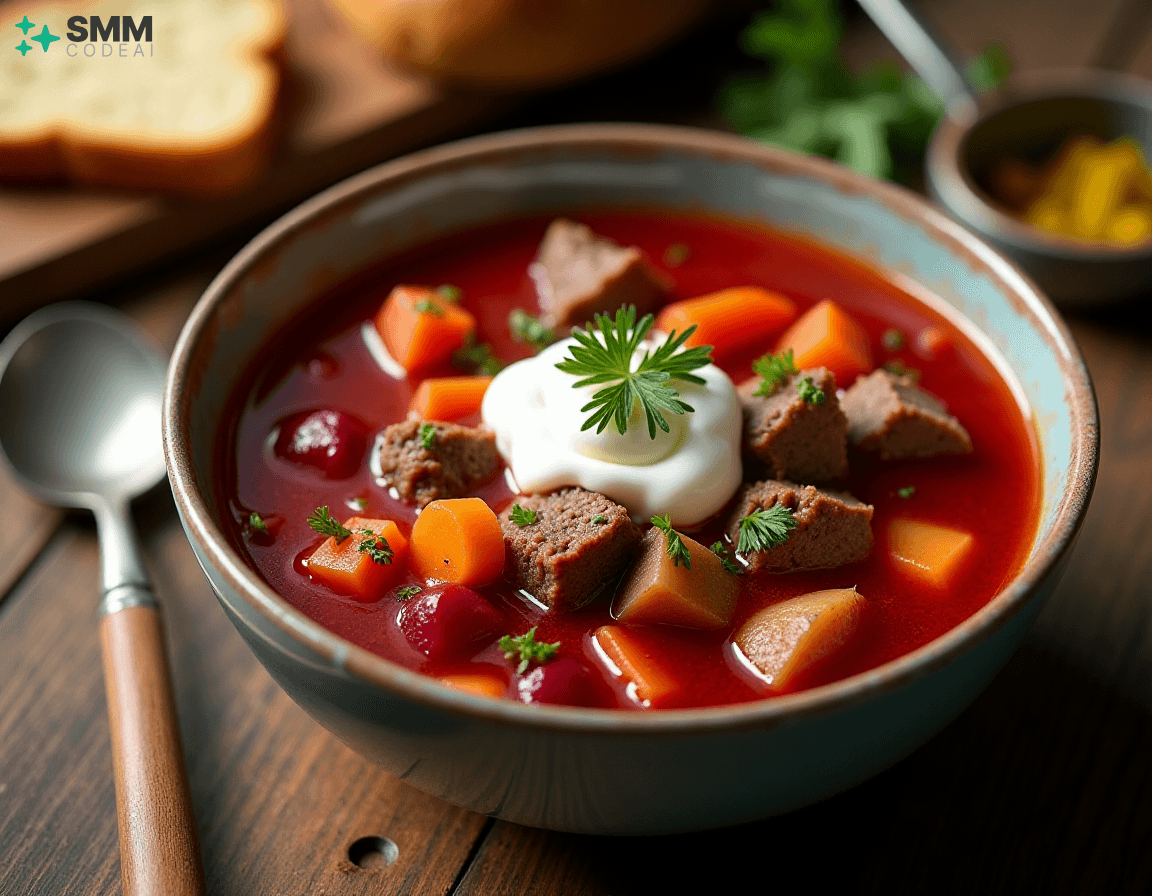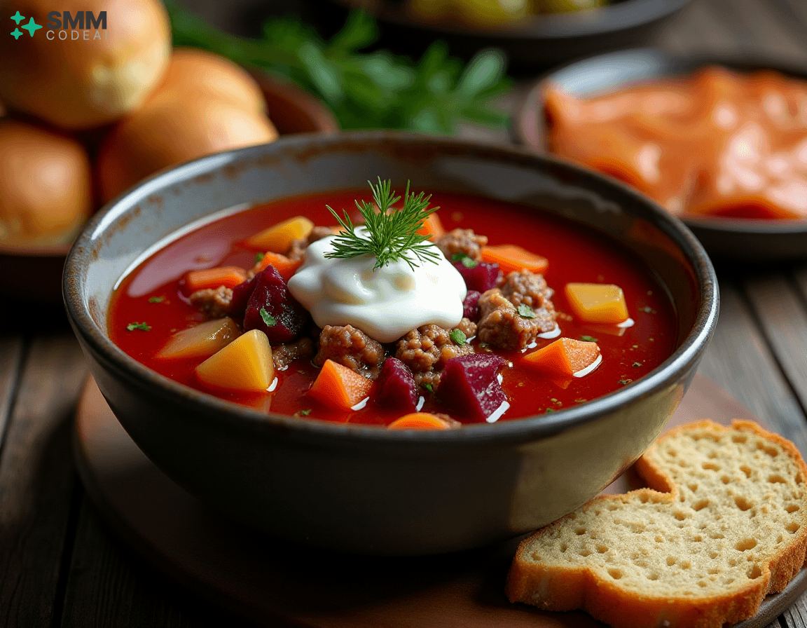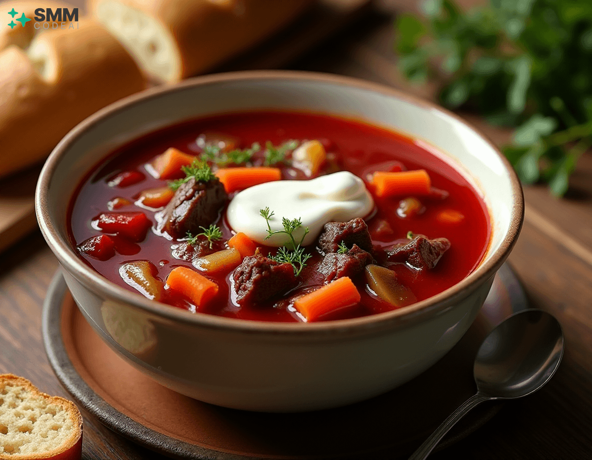 A hearty and comforting bowl of traditional Russian borscht, featuring a vibrant red soup base with tender pieces of beef and pork, simmered in a rich blend of tomato sauce and spices like dill, bay leaf, and sugar. Fresh beets contribute to the soup's deep red color and add natural sweetness. The vegetables such as shredded carrots, diced potatoes, and chopped celery provide texture and flavor. A dollop of sour cream on top adds a creamy contrast to the tartness of the borscht. Set against a wooden table with bread rolls, pickled herring, and a side of rye crust, the scene conveys warmth and nostalgia associated with Russian cuisine. Soft natural lighting highlights the rich colors and flavors, creating an inviting atmosphere that invites you to savor every delicious bite.