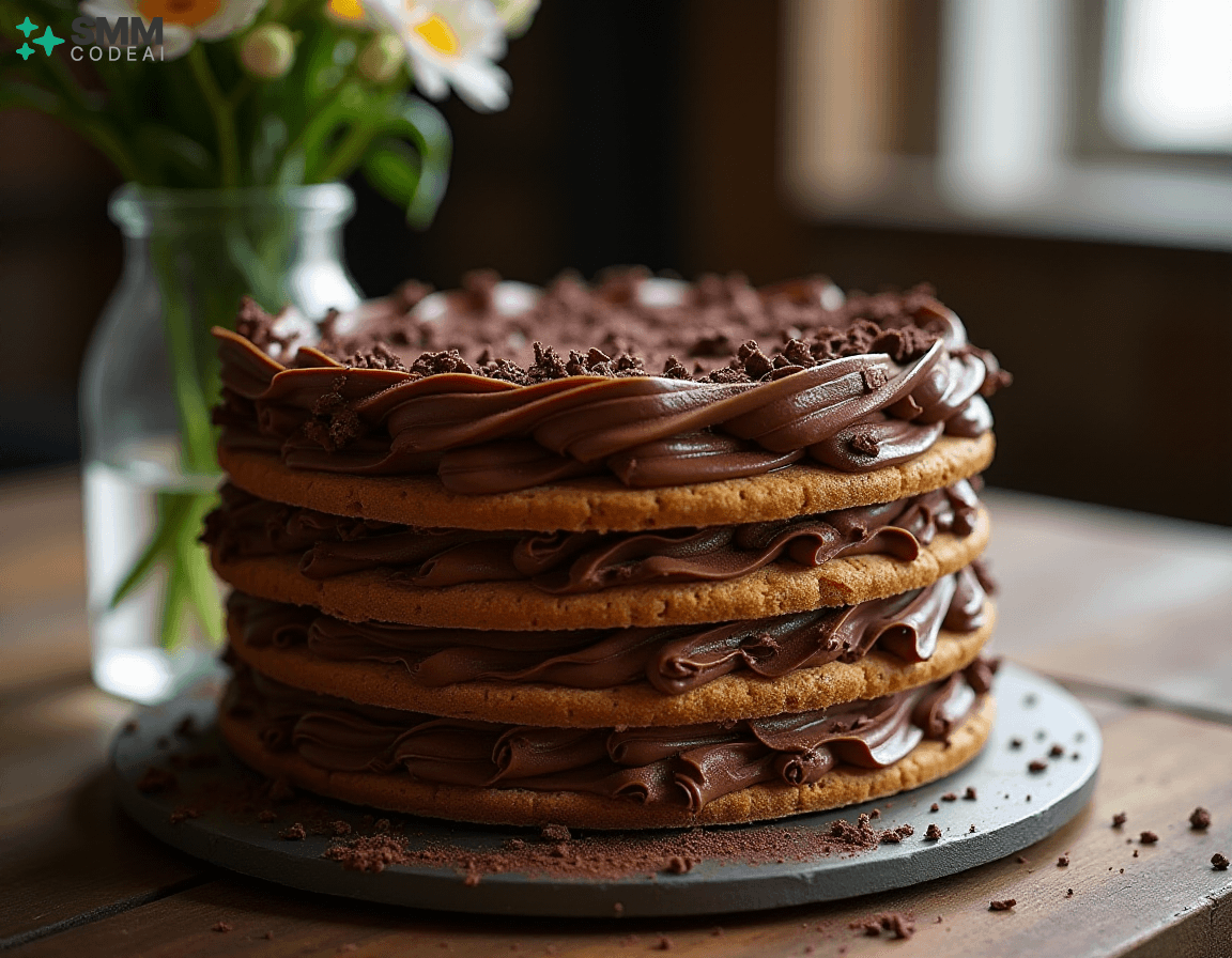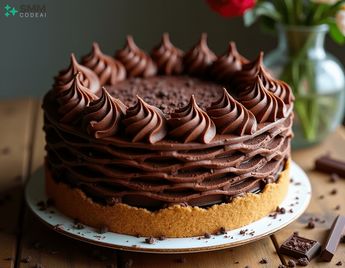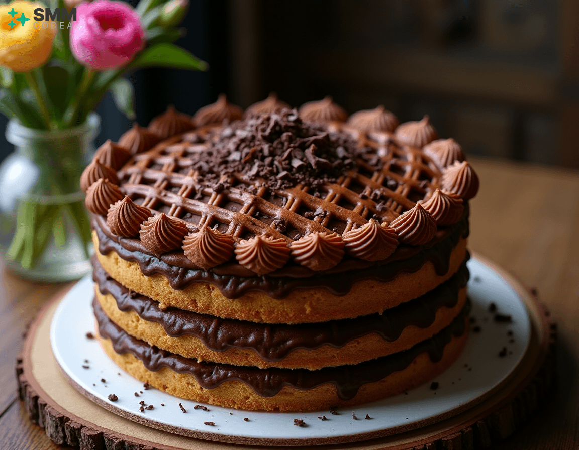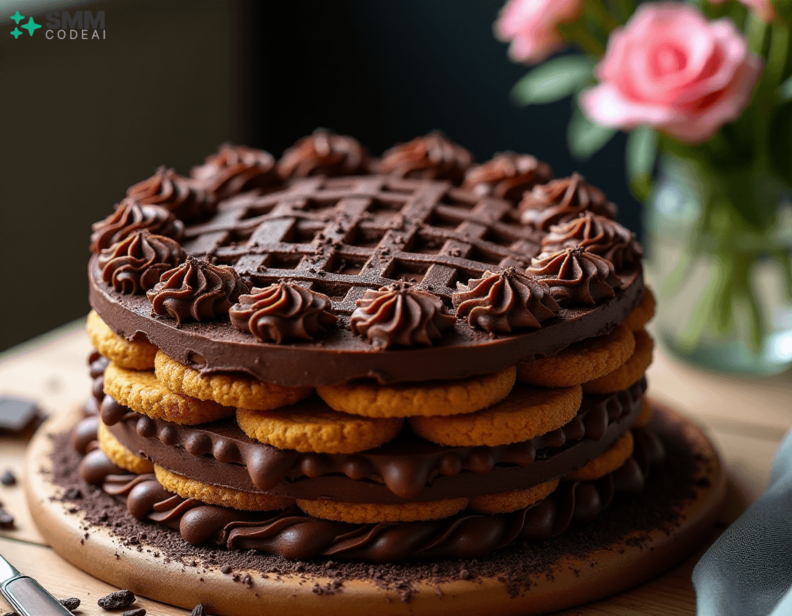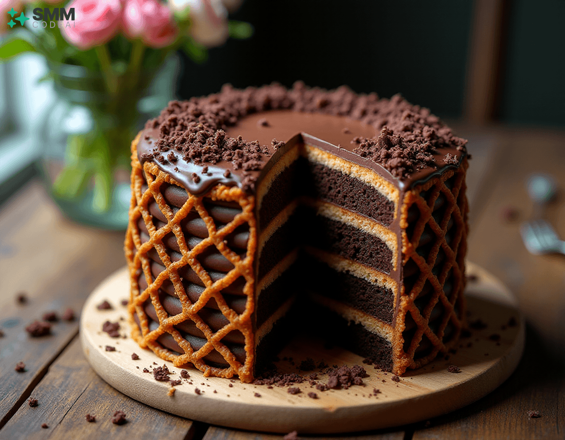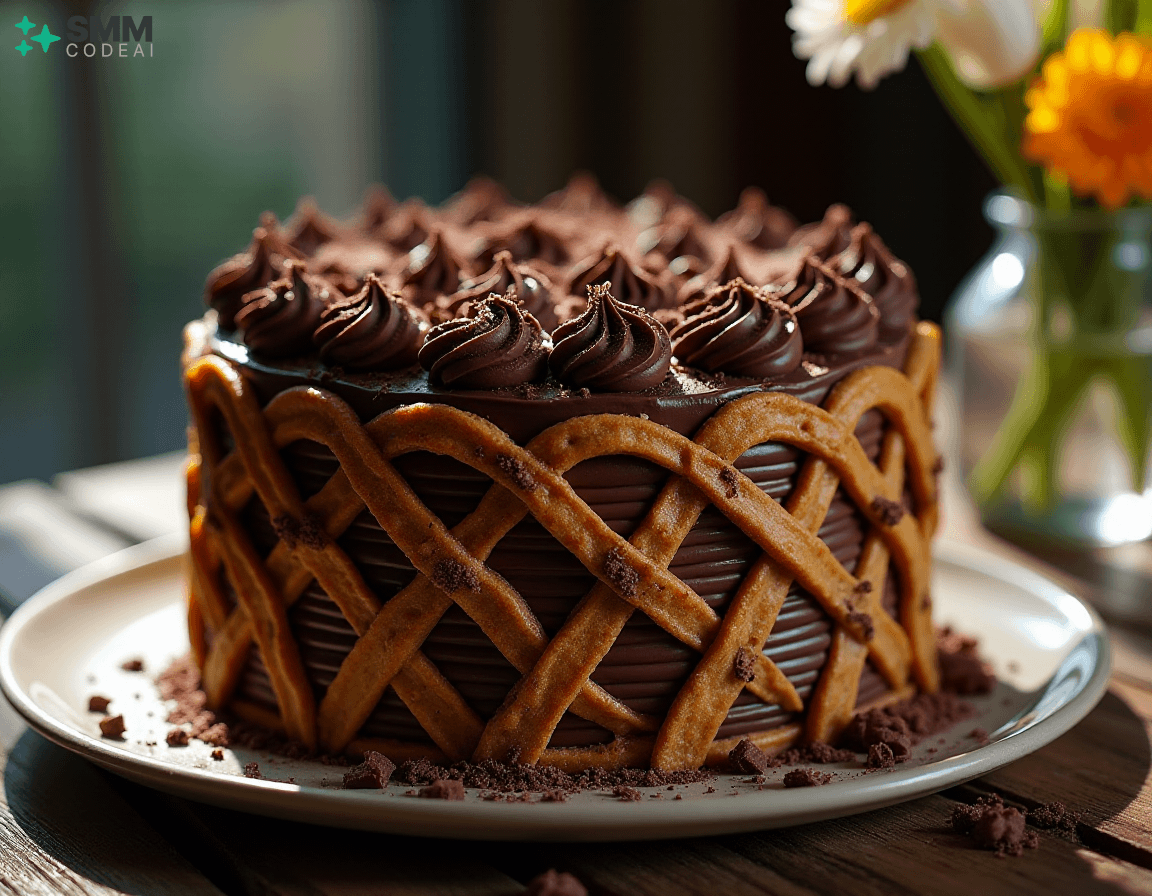 A stunningly beautiful chocolate lattice cake with intricate layers of rich, decadent chocolate and crisp, buttery biscuit crust. Each layer is adorned with delicate piping, creating a mesmerizing visual effect. The top is crowned with a sprinkle of dark chocolate shavings, adding depth and elegance to the dessert. Soft natural lighting highlights the intricate details and textures, casting soft shadows that enhance the beauty of the cake. A rustic wooden table with a glass vase filled with fresh flowers provides a perfect backdrop for this stunning display of culinary artistry. Capture every exquisite element, from the golden-brown biscuit crust to the dark chocolate shavings on top, in high detail to create an image that will leave viewers spellbound and eager to taste the deliciousness hidden within.
