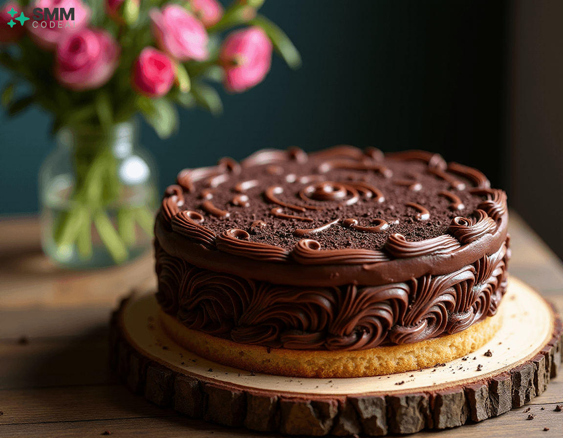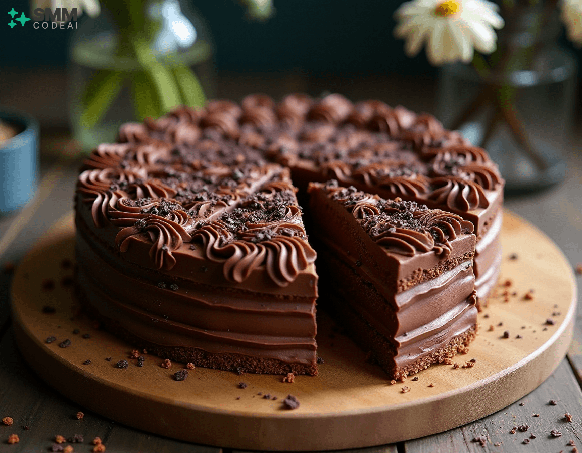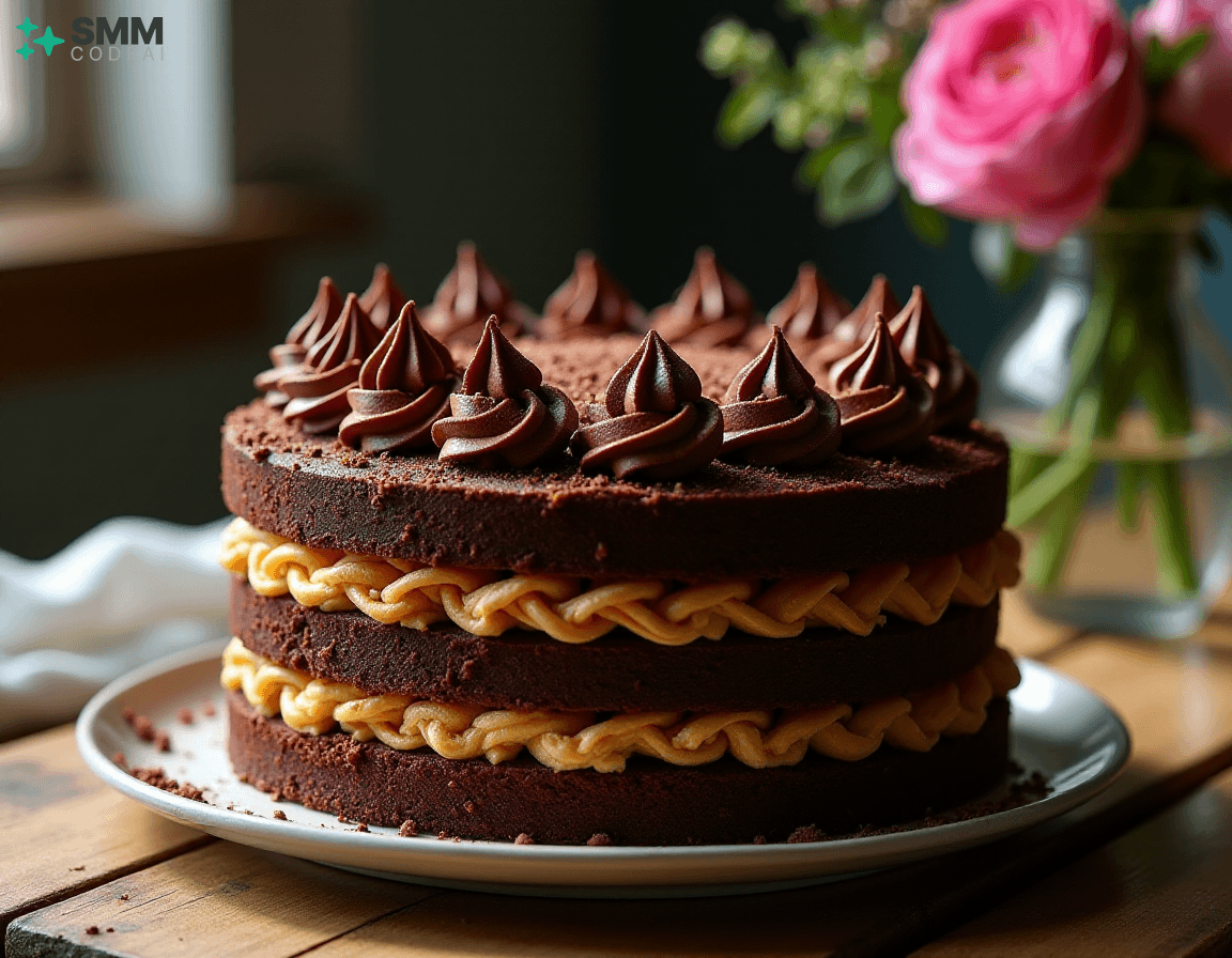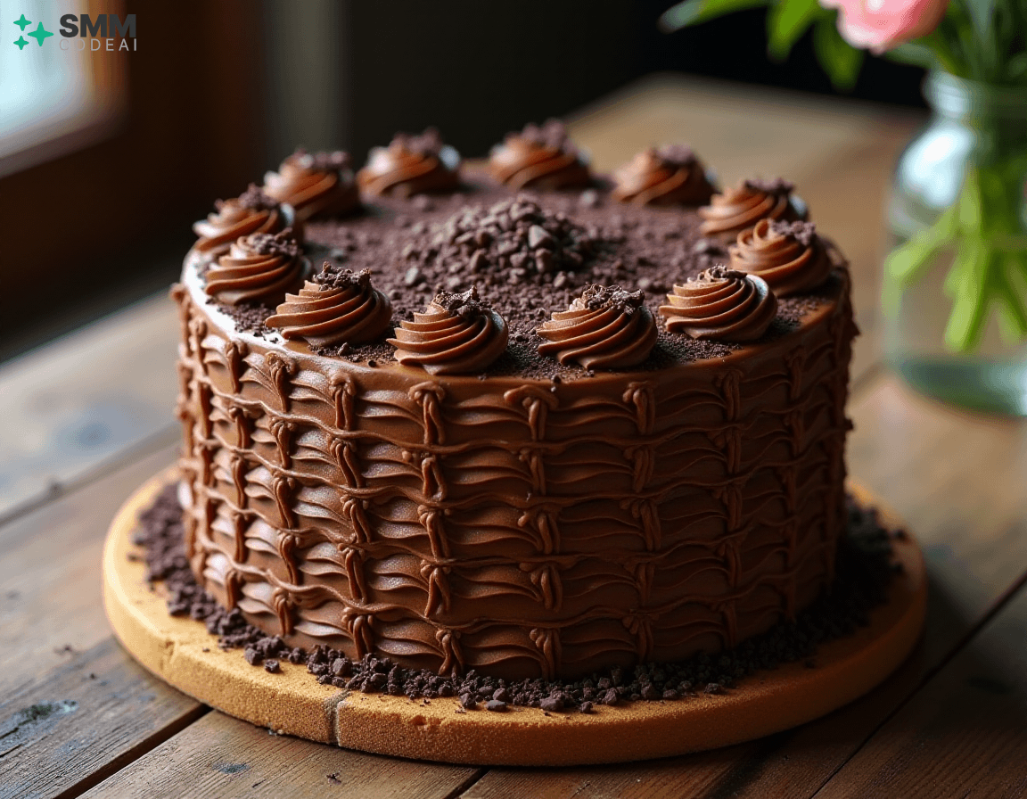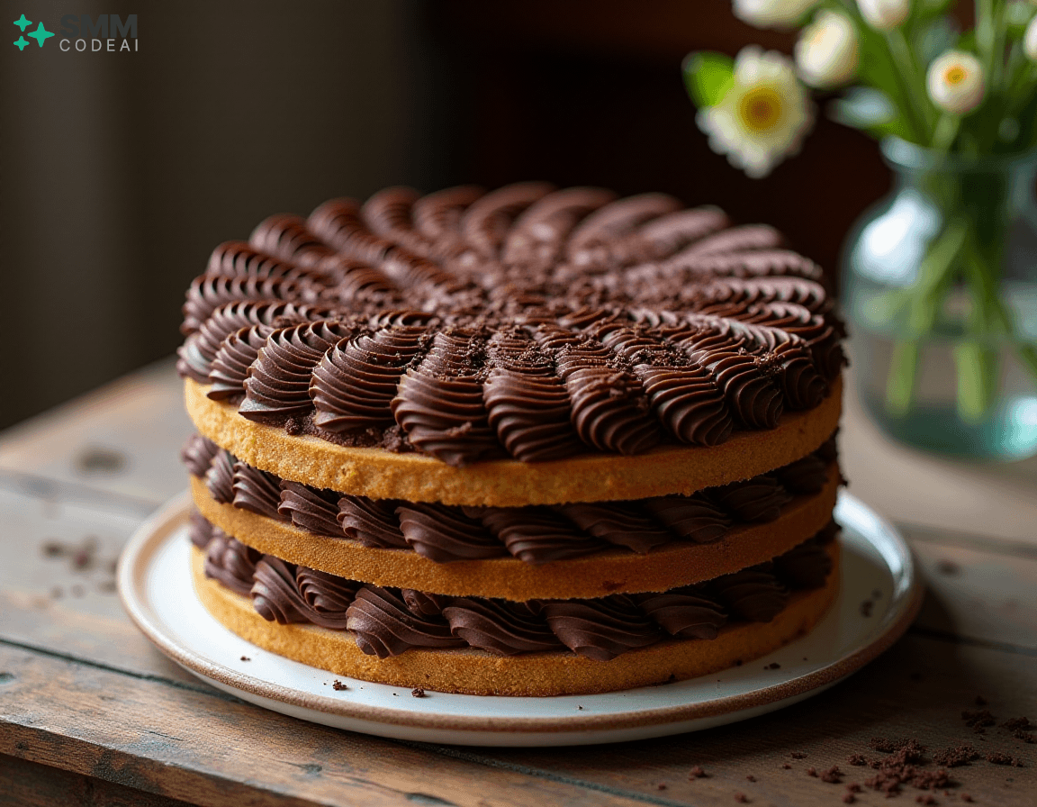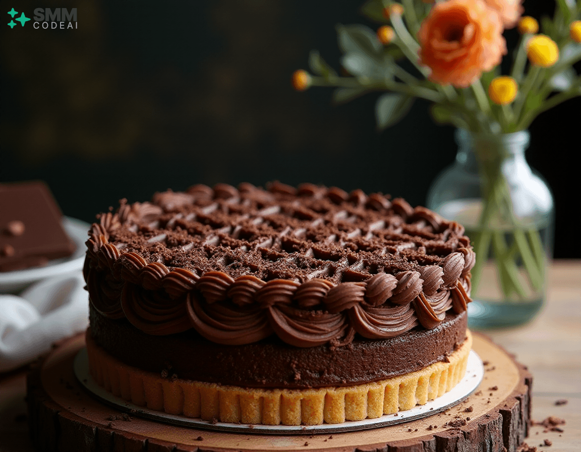 A stunningly beautiful chocolate lattice cake with intricate layers of rich, decadent chocolate and crisp, buttery biscuit crust. Each layer is adorned with delicate piping, creating a mesmerizing visual effect. The top is crowned with a sprinkle of dark chocolate shavings, adding depth and elegance to the dessert. Soft natural lighting highlights the intricate details and textures, casting soft shadows that enhance the beauty of the cake. A rustic wooden table with a glass vase filled with fresh flowers provides a perfect backdrop for this stunning display of culinary artistry. Capture every exquisite element, from the golden-brown biscuit crust to the dark chocolate shavings on top, in high detail to create an image that will leave viewers spellbound and eager to taste the deliciousness hidden within.