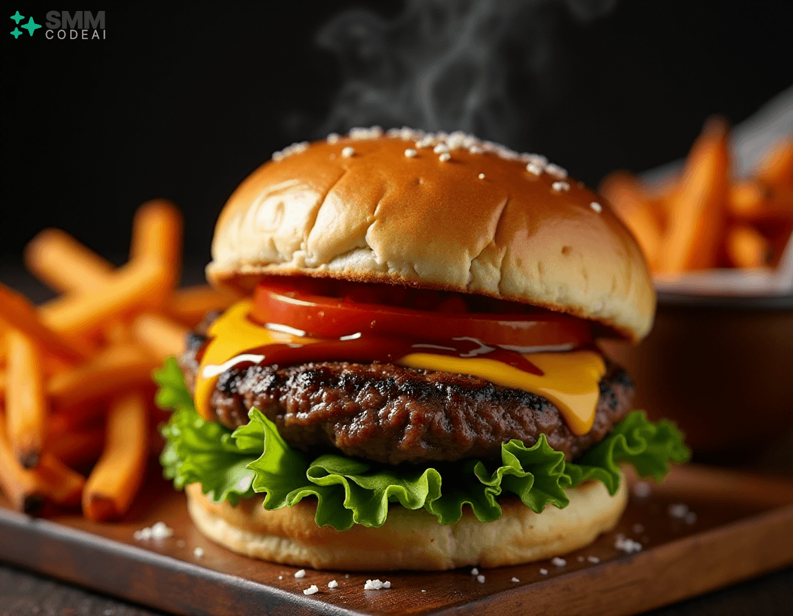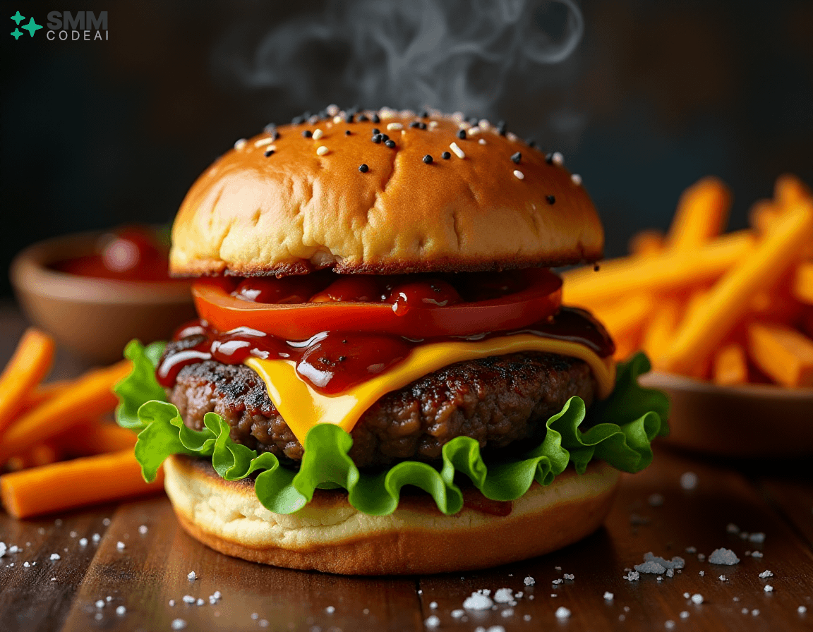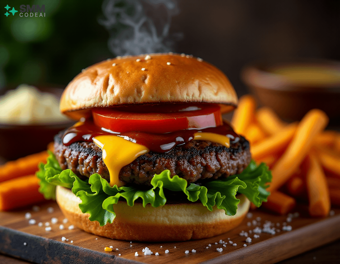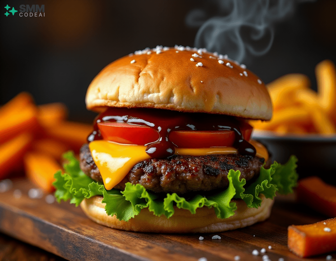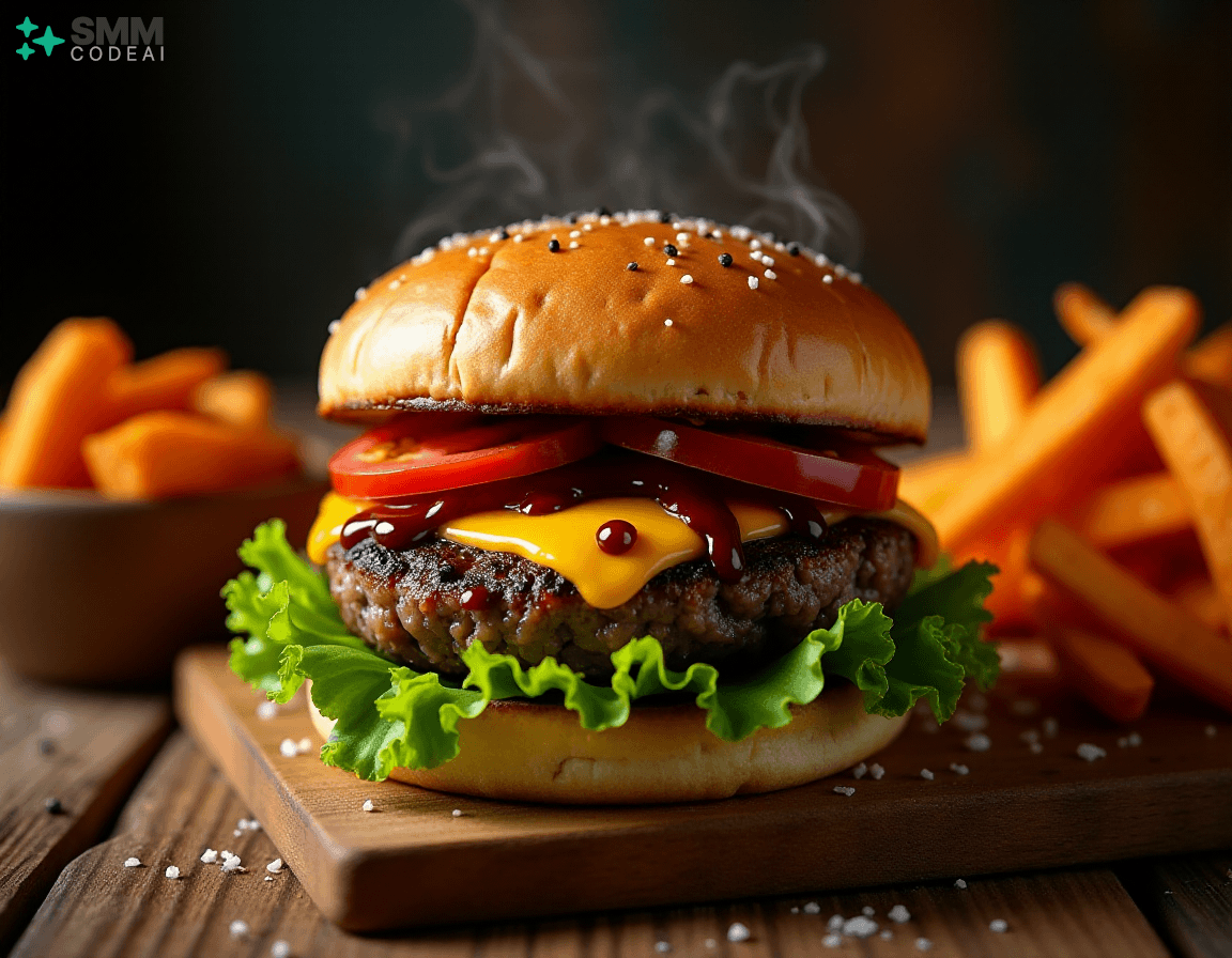 A perfectly grilled burger, its juicy patty glistening with a caramelized crust, nestled between a lightly toasted brioche bun, golden and slightly crisp. Fresh, vibrant green lettuce peeks out from the bottom slice, topped with a slice of ripe, ruby-red tomato and a generous layer of melted cheddar, oozing slightly. A drizzle of rich, smoky barbecue sauce glistens atop the burger, with a sprinkle of cracked black pepper for contrast. The beef patty should be cooked to medium-rare perfection, with a charred exterior that adds depth of flavor. Set on a rustic wooden table, surrounded by hand-cut, golden-brown fries dusted with sea salt and a side of sweet potato fries, the scene is enhanced by warm, soft lighting that casts a gentle glow, highlighting the textures and colors. The composition captures the burger slightly off-center, inviting the viewer's eye to explore the delicious details. This image embodies rustic food photography, evoking the mouthwatering aroma of grilled meat and the satisfying crunch of fresh vegetables, with steam subtly rising from the burger, promising an unforgettable bite.
