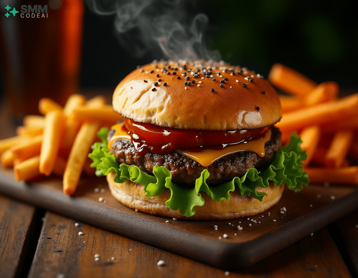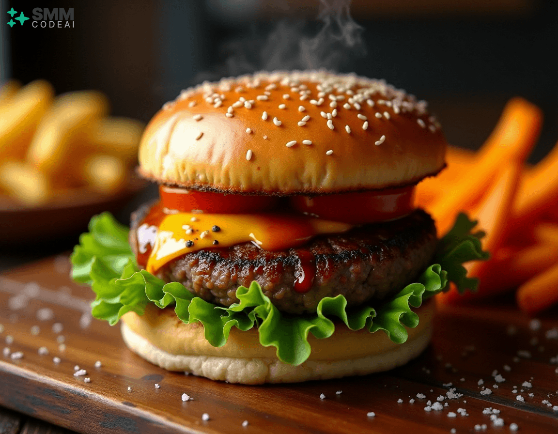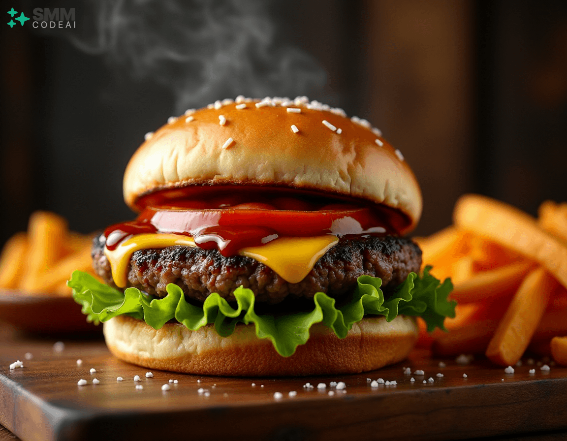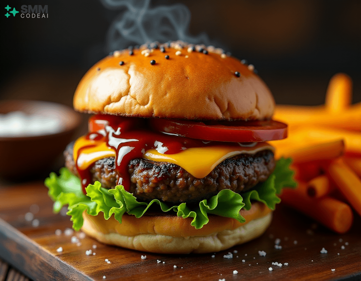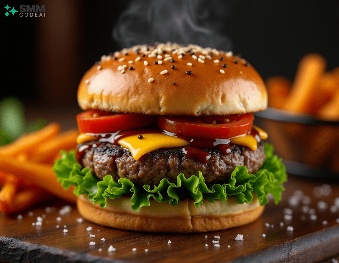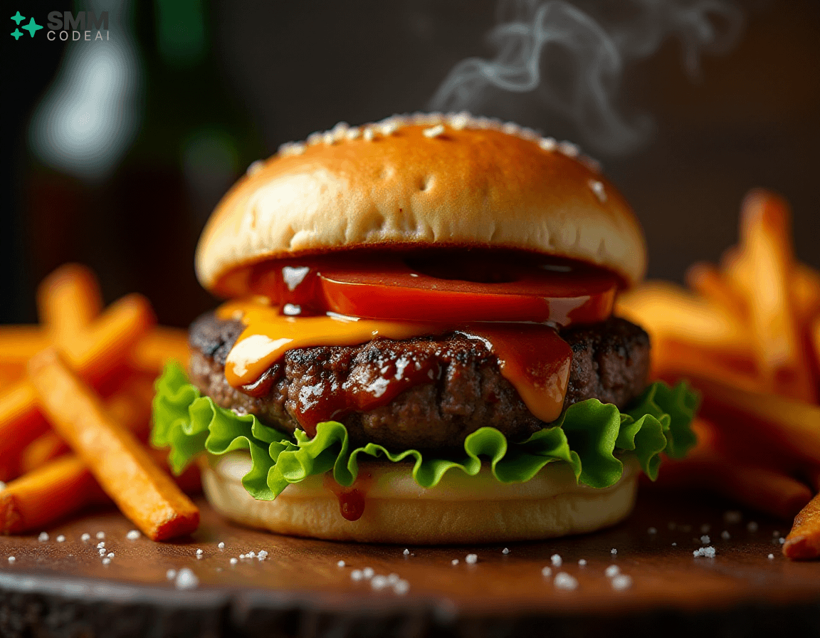 A perfectly grilled burger, its juicy patty glistening with a caramelized crust, nestled between a lightly toasted brioche bun, golden and slightly crisp. Fresh, vibrant green lettuce peeks out from the bottom slice, topped with a slice of ripe, ruby-red tomato and a generous layer of melted cheddar, oozing slightly. A drizzle of rich, smoky barbecue sauce glistens atop the burger, with a sprinkle of cracked black pepper for contrast. The beef patty should be cooked to medium-rare perfection, with a charred exterior that adds depth of flavor. Set on a rustic wooden table, surrounded by hand-cut, golden-brown fries dusted with sea salt and a side of sweet potato fries, the scene is enhanced by warm, soft lighting that casts a gentle glow, highlighting the textures and colors. The composition captures the burger slightly off-center, inviting the viewer's eye to explore the delicious details. This image embodies rustic food photography, evoking the mouthwatering aroma of grilled meat and the satisfying crunch of fresh vegetables, with steam subtly rising from the burger, promising an unforgettable bite.
