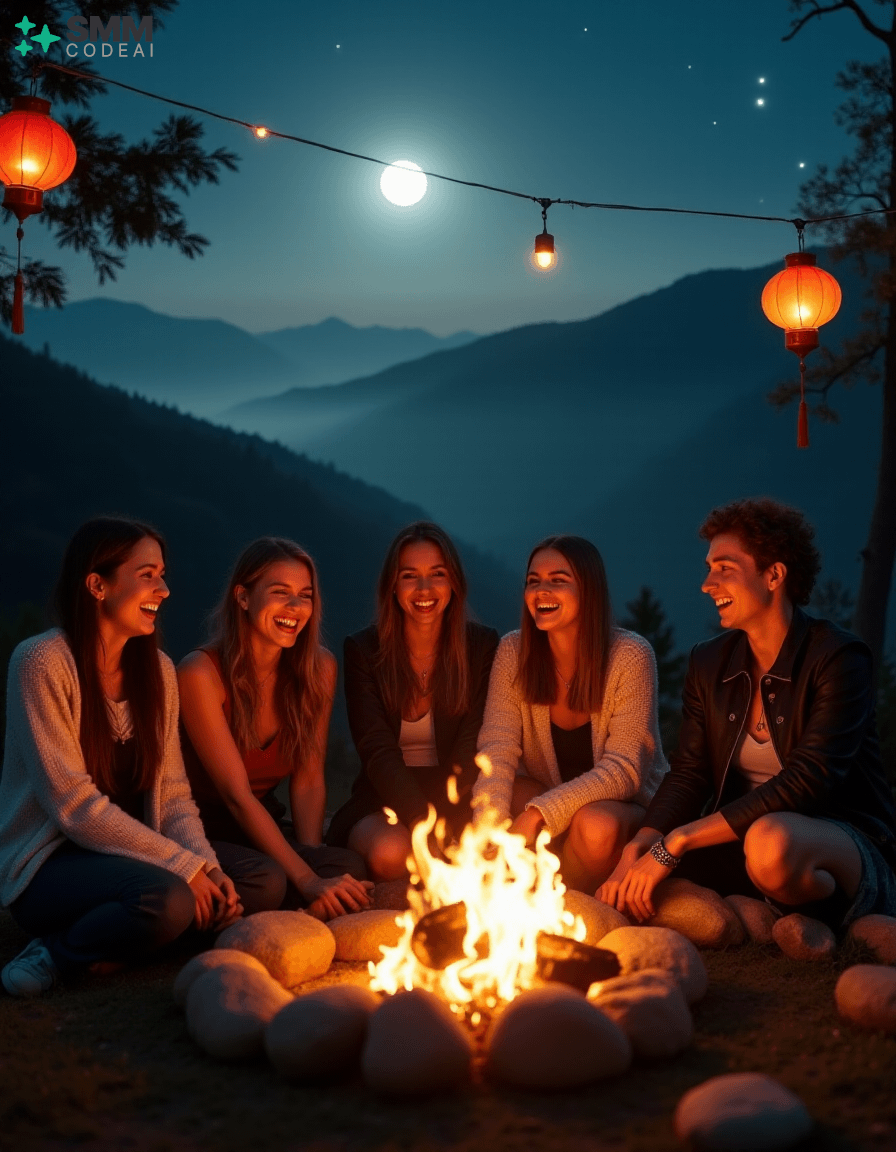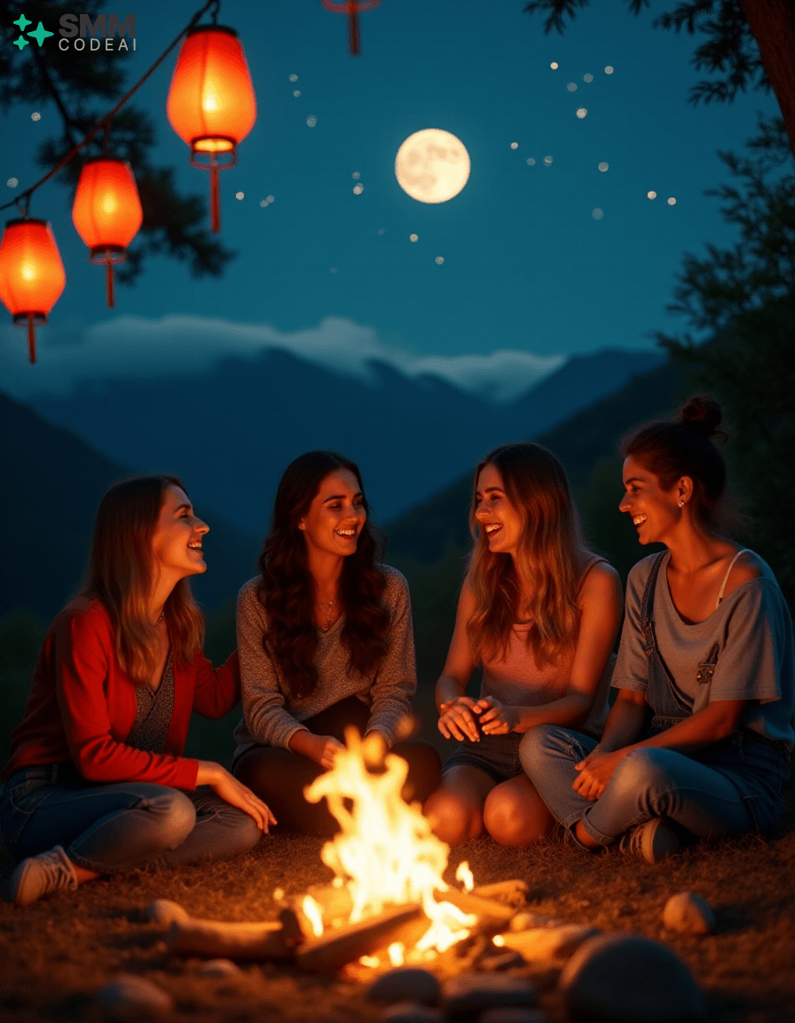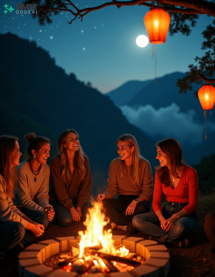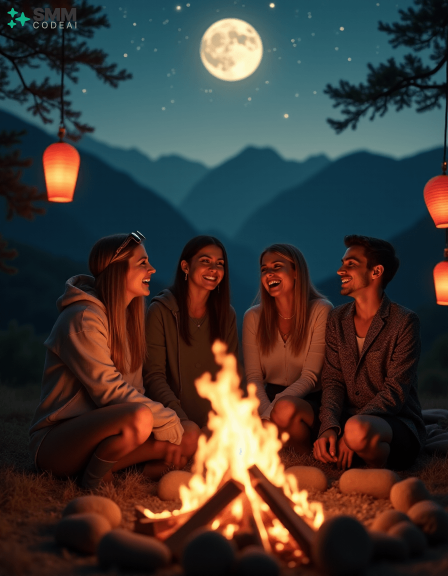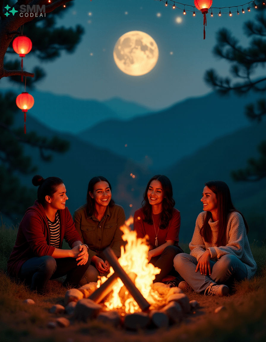 Create an eye-catching photograph capturing a group of friends gathered around a cozy outdoor bonfire under the warm glow of the full moon. The scene is set in a scenic mountainous area with soft mist rolling through the valleys and twinkling stars above. Each friend wears stylish, contrasting outfits, their laughter mingling with the crackling fire and gentle breeze. Brightly colored lanterns hang from nearby trees, adding a festive touch to the night. The atmosphere is lively yet intimate, highlighting the joy of friendship and the beauty of nature under the moonlight. Use a shallow depth of field to focus on the faces of the friends while softly blurring the background, emphasizing their connection in this magical moment.