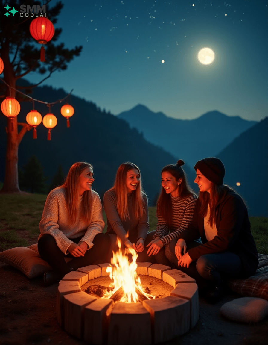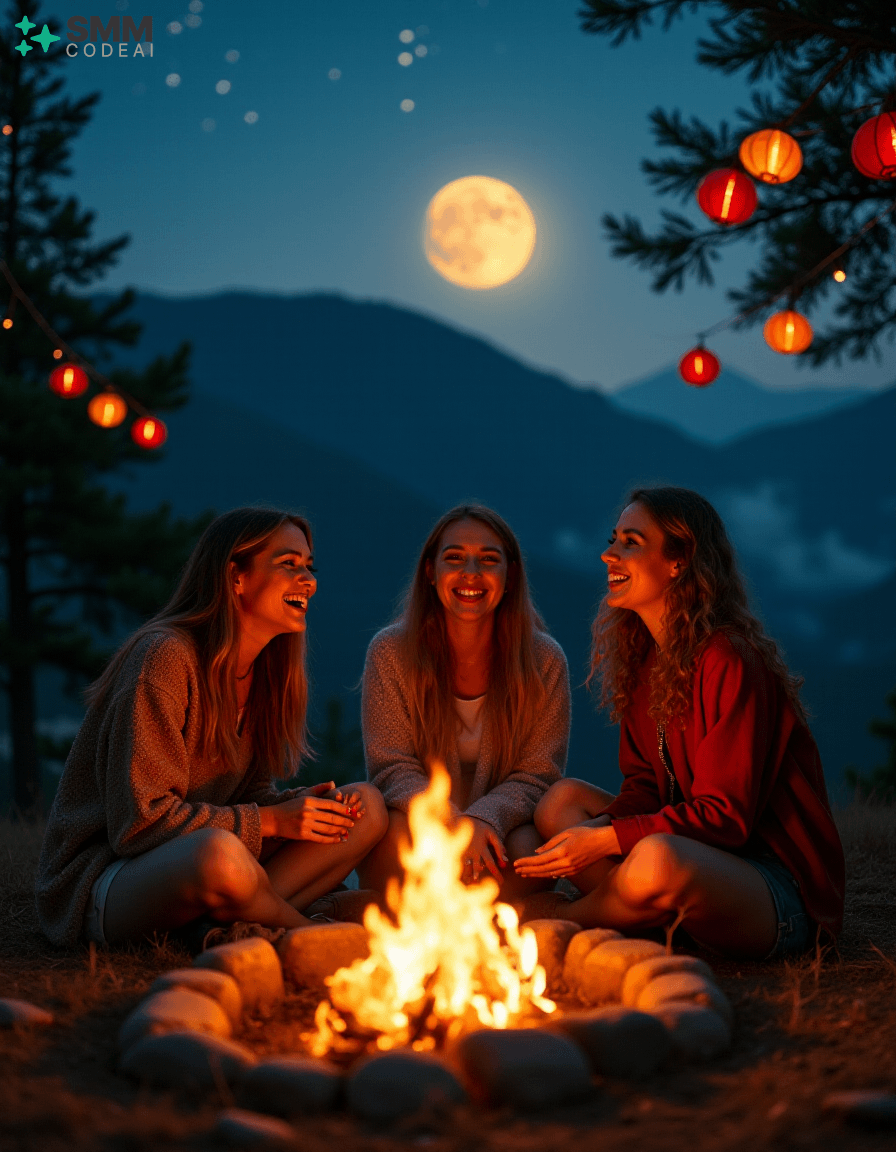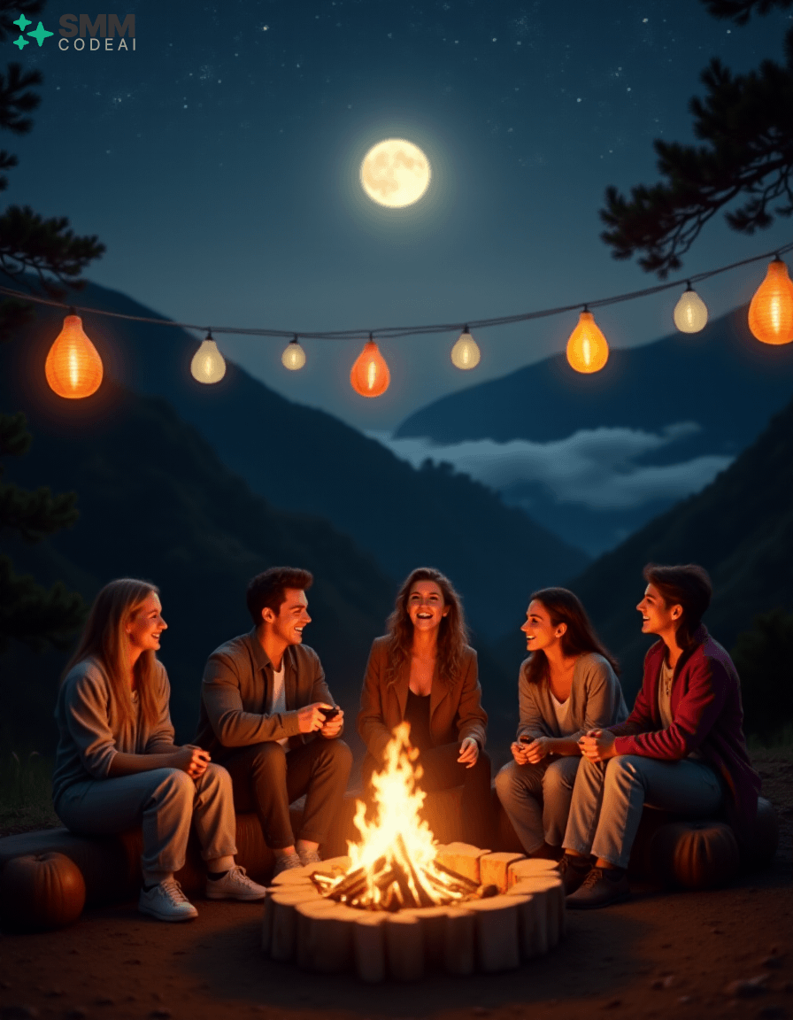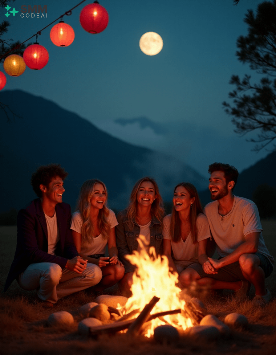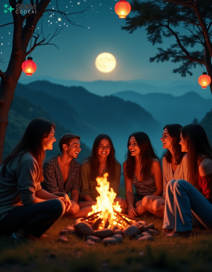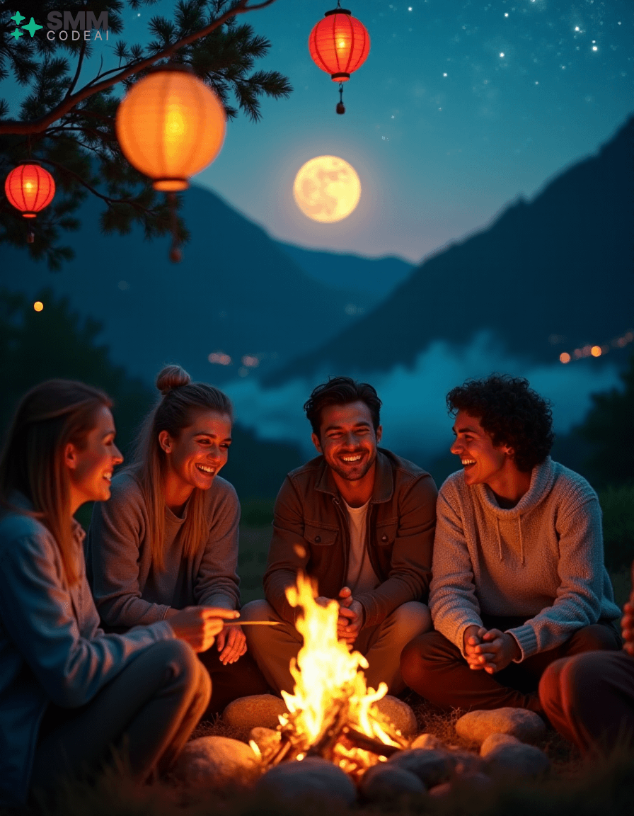 Create an eye-catching photograph capturing a group of friends gathered around a cozy outdoor bonfire under the warm glow of the full moon. The scene is set in a scenic mountainous area with soft mist rolling through the valleys and twinkling stars above. Each friend wears stylish, contrasting outfits, their laughter mingling with the crackling fire and gentle breeze. Brightly colored lanterns hang from nearby trees, adding a festive touch to the night. The atmosphere is lively yet intimate, highlighting the joy of friendship and the beauty of nature under the moonlight. Use a shallow depth of field to focus on the faces of the friends while softly blurring the background, emphasizing their connection in this magical moment.