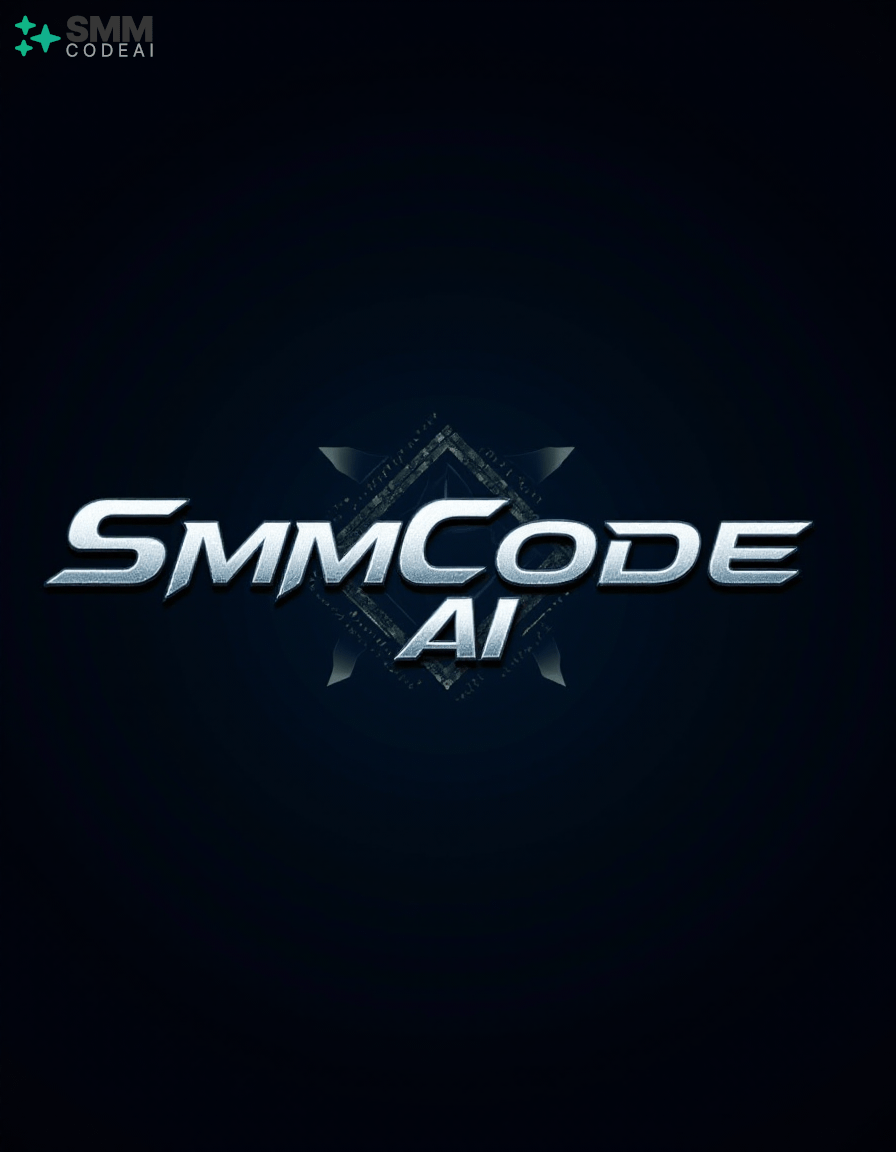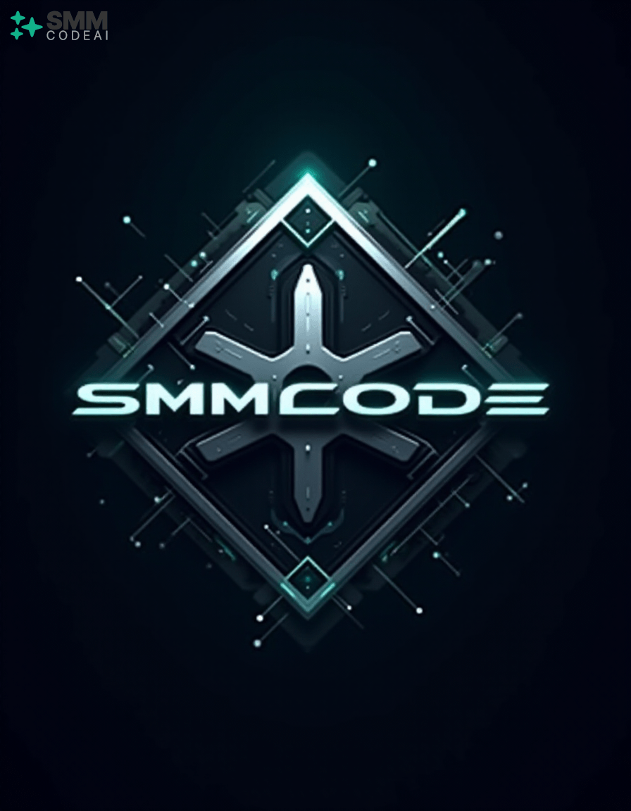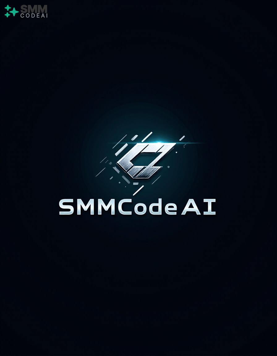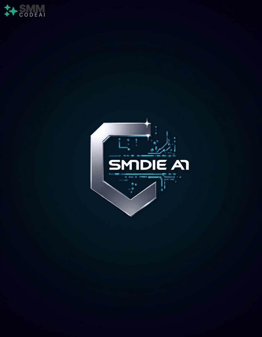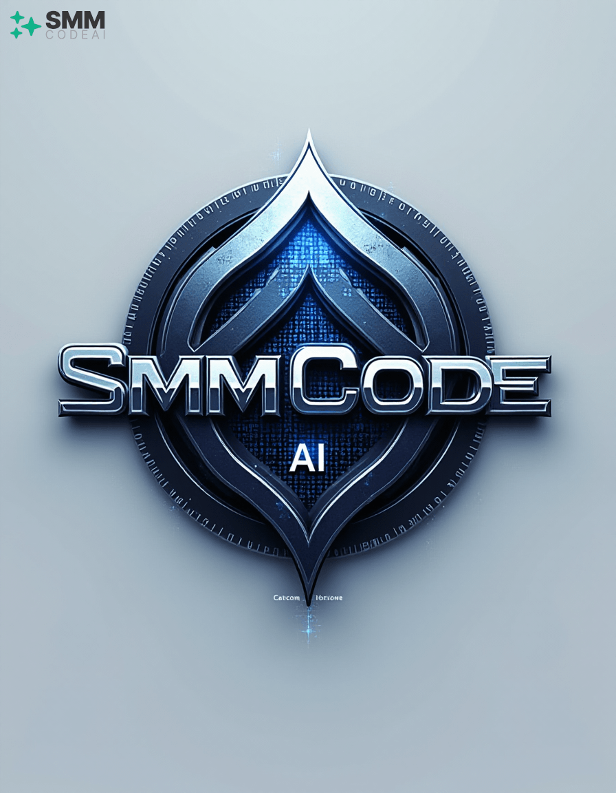 Create a bold and futuristic logo for SMMCode AI in a cyberpunk style. Use sharp, angular lines and metallic colors such as silver, chrome, and deep blues to evoke a sense of technology and high-tech. Incorporate digital elements like binary code, holograms, or circuitry patterns. The name "SMMCode AI" should be prominently displayed in a clean, modern font with a futuristic twist. Consider using a sleek, geometric shape or abstract design as the central element of the logo to represent innovation and intelligence. Ensure that the logo is versatile enough for different mediums and applications while maintaining its unique cyberpunk aesthetic.