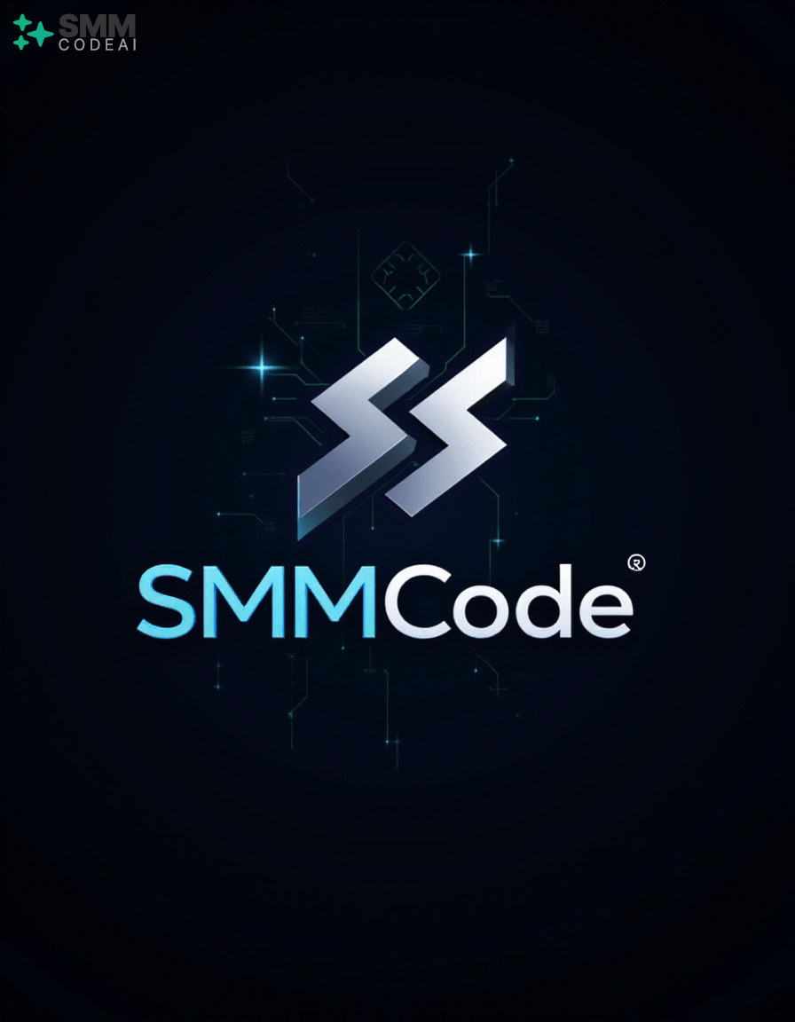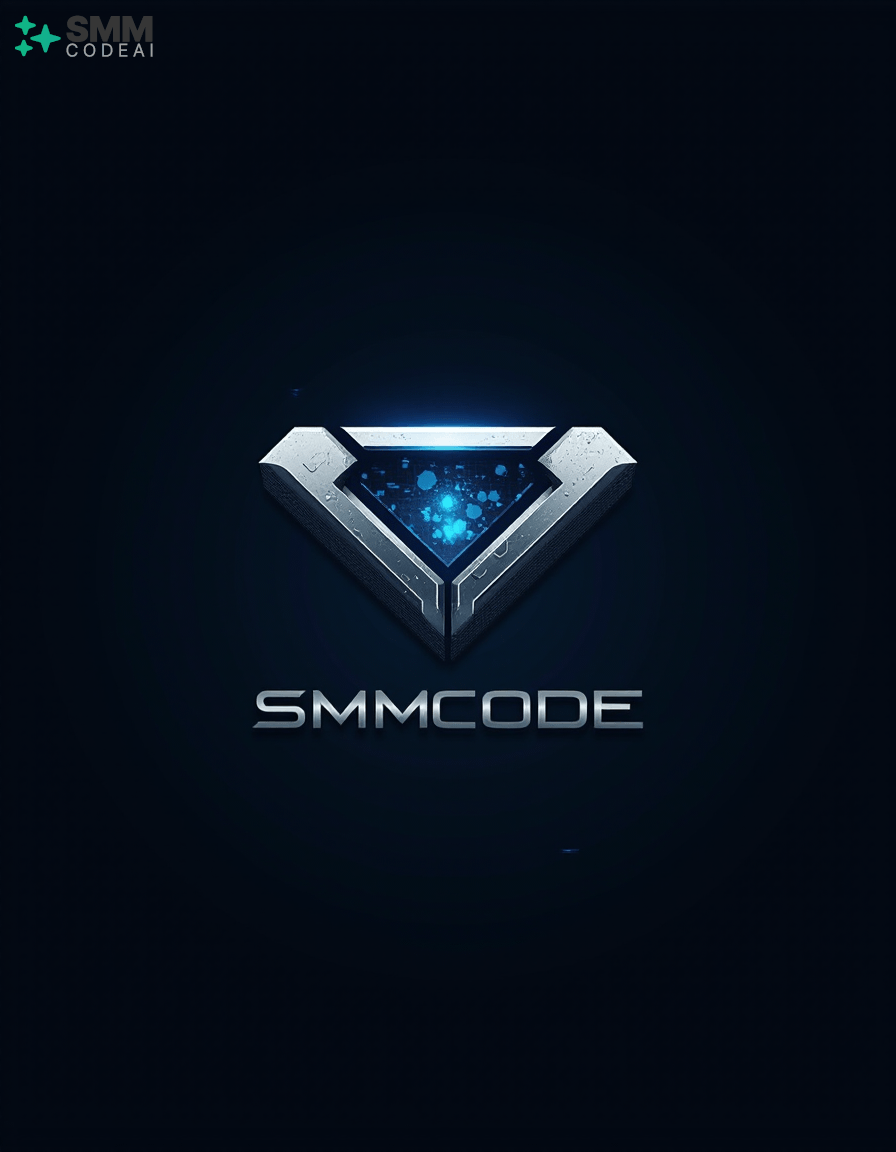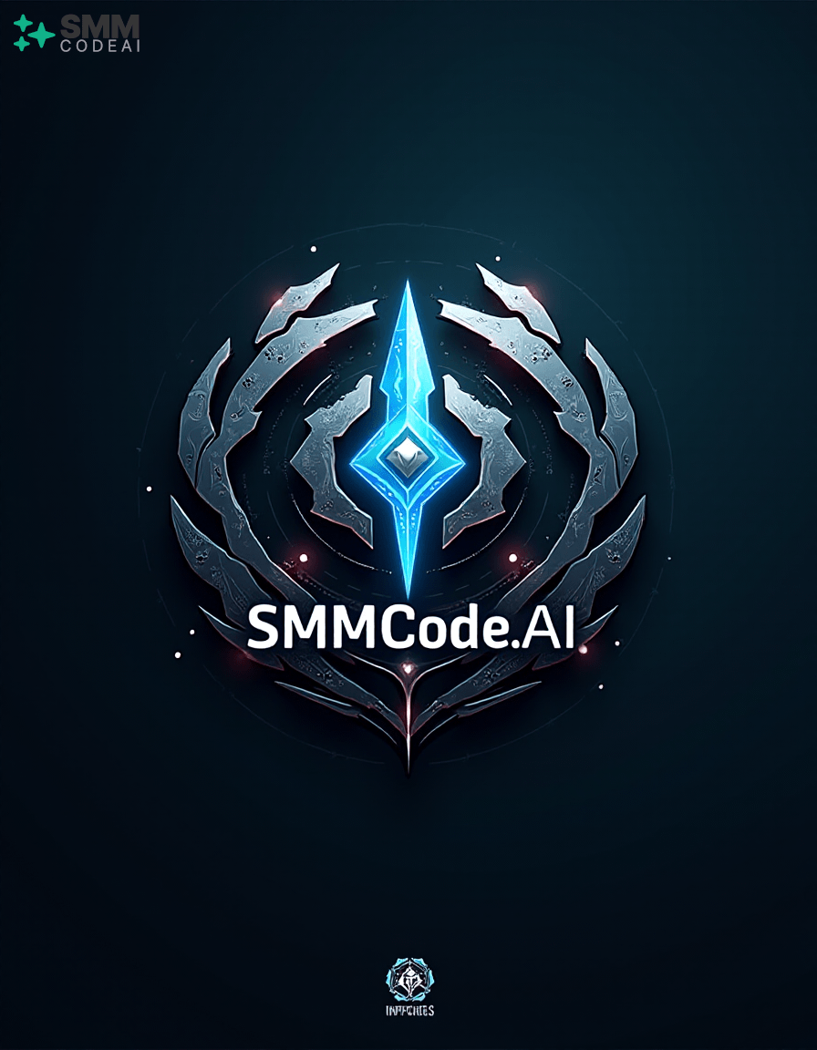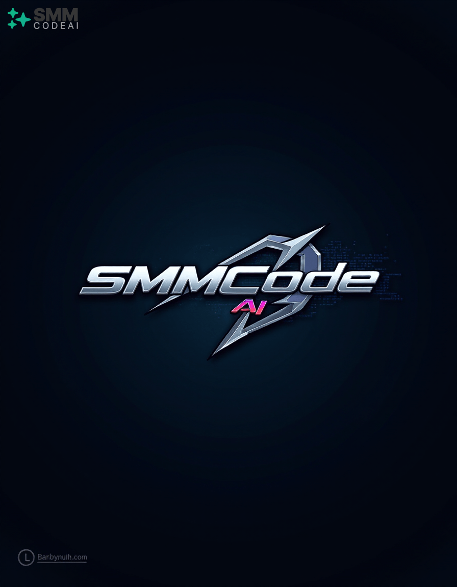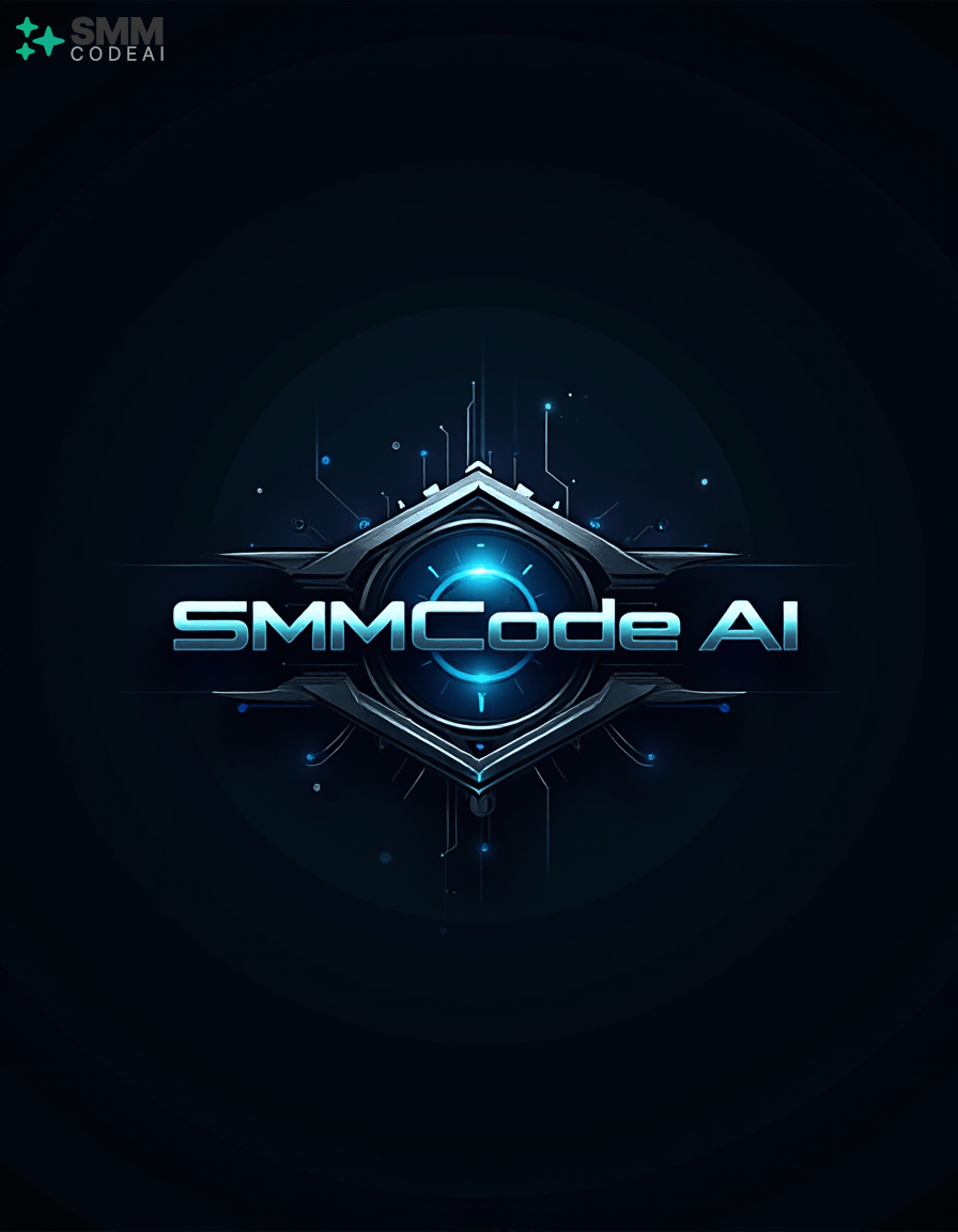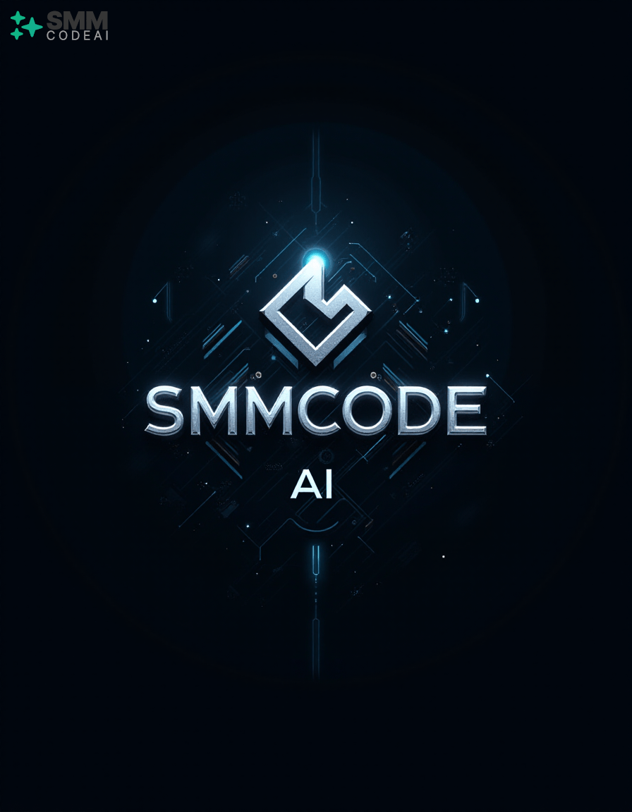 Create a bold and futuristic logo for SMMCode AI in a cyberpunk style. Use sharp, angular lines and metallic colors such as silver, chrome, and deep blues to evoke a sense of technology and high-tech. Incorporate digital elements like binary code, holograms, or circuitry patterns. The name "SMMCode AI" should be prominently displayed in a clean, modern font with a futuristic twist. Consider using a sleek, geometric shape or abstract design as the central element of the logo to represent innovation and intelligence. Ensure that the logo is versatile enough for different mediums and applications while maintaining its unique cyberpunk aesthetic.