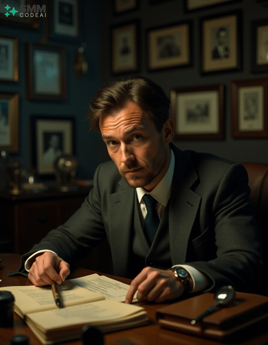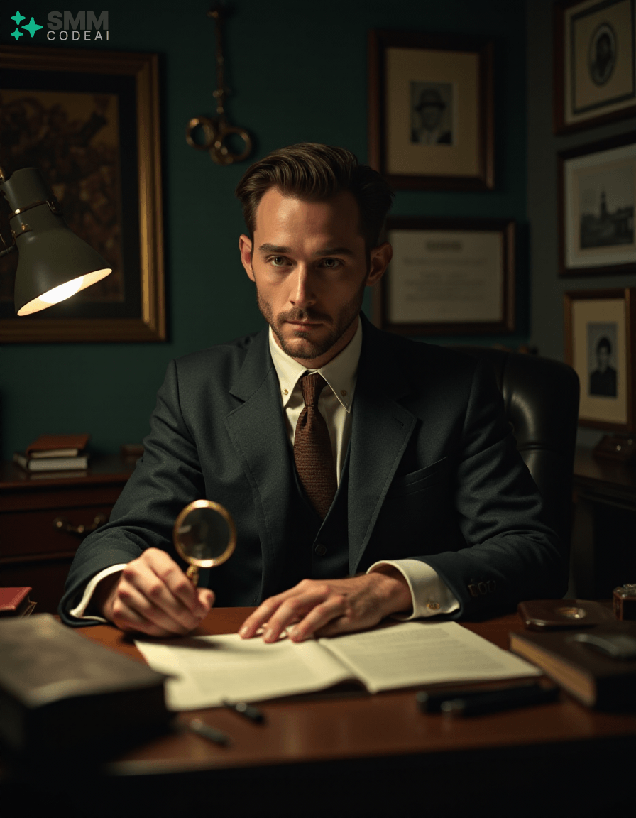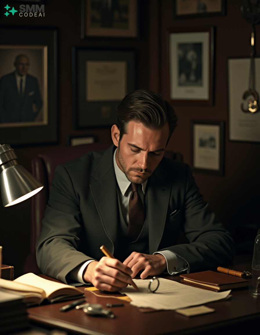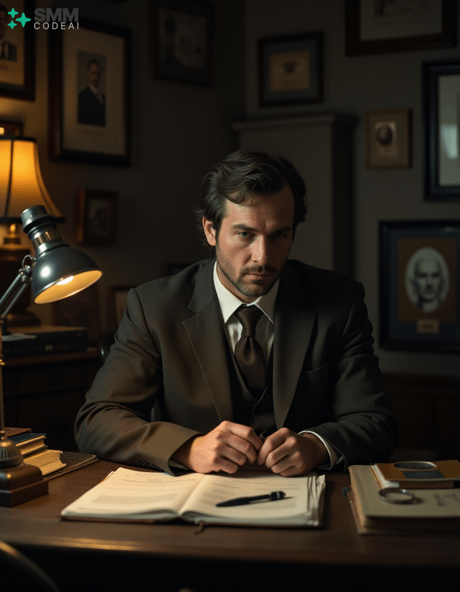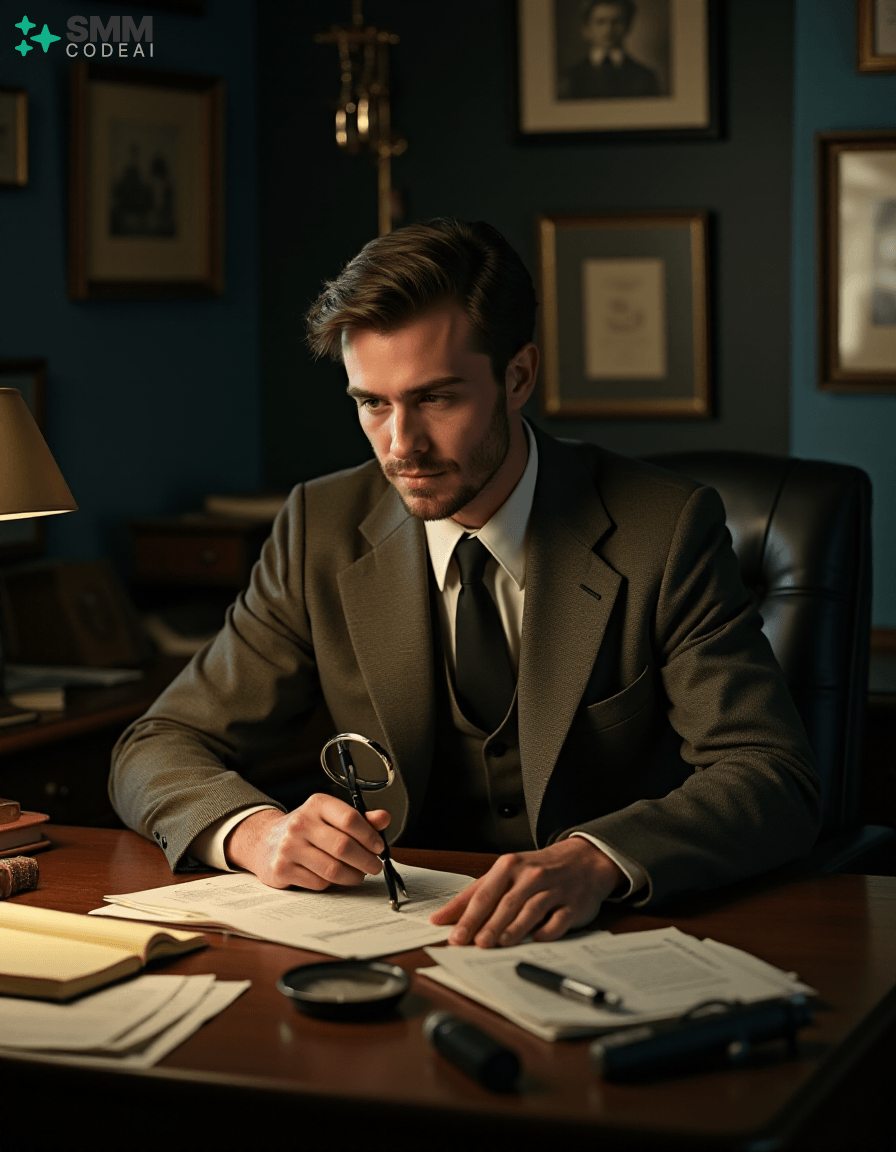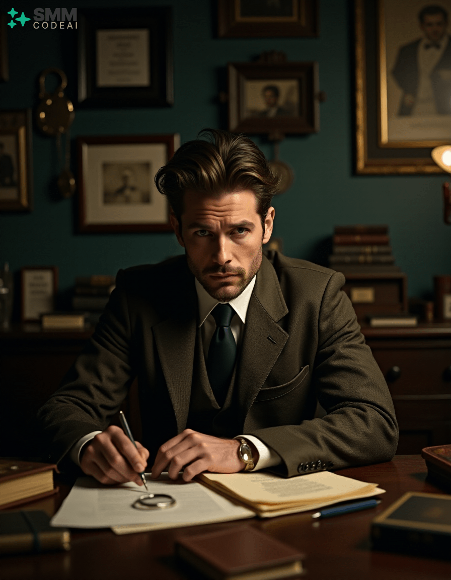 Create an atmospheric portrait of a vintage detective sitting at his cluttered desk in a dimly lit, old-fashioned police station. He wears a well-worn suit with a crisp shirt and a sharp tie, displaying a thoughtful expression as he reviews a stack of papers and a magnifying glass. His hair is neatly combed, but slightly tousled from the day's work. The walls are lined with framed photos and awards, creating an aura of professionalism and experience. The desk is filled with various tools and items used in his investigation, including a leather-bound notebook, a penlight, and a pair of handcuffs hanging on the wall. The lighting is soft and warm, casting shadows that accentuate his features and create a cozy atmosphere. Use a 50mm lens to capture the essence of his work while maintaining clarity in his expression. The mood should be nostalgic and intriguing, evoking a sense of mystery and adventure as the detective delves into solving a case.
