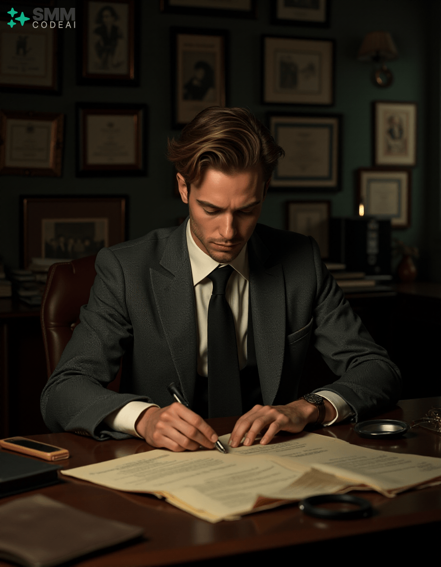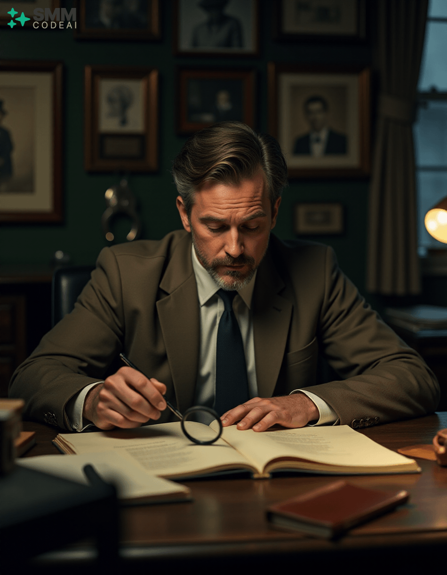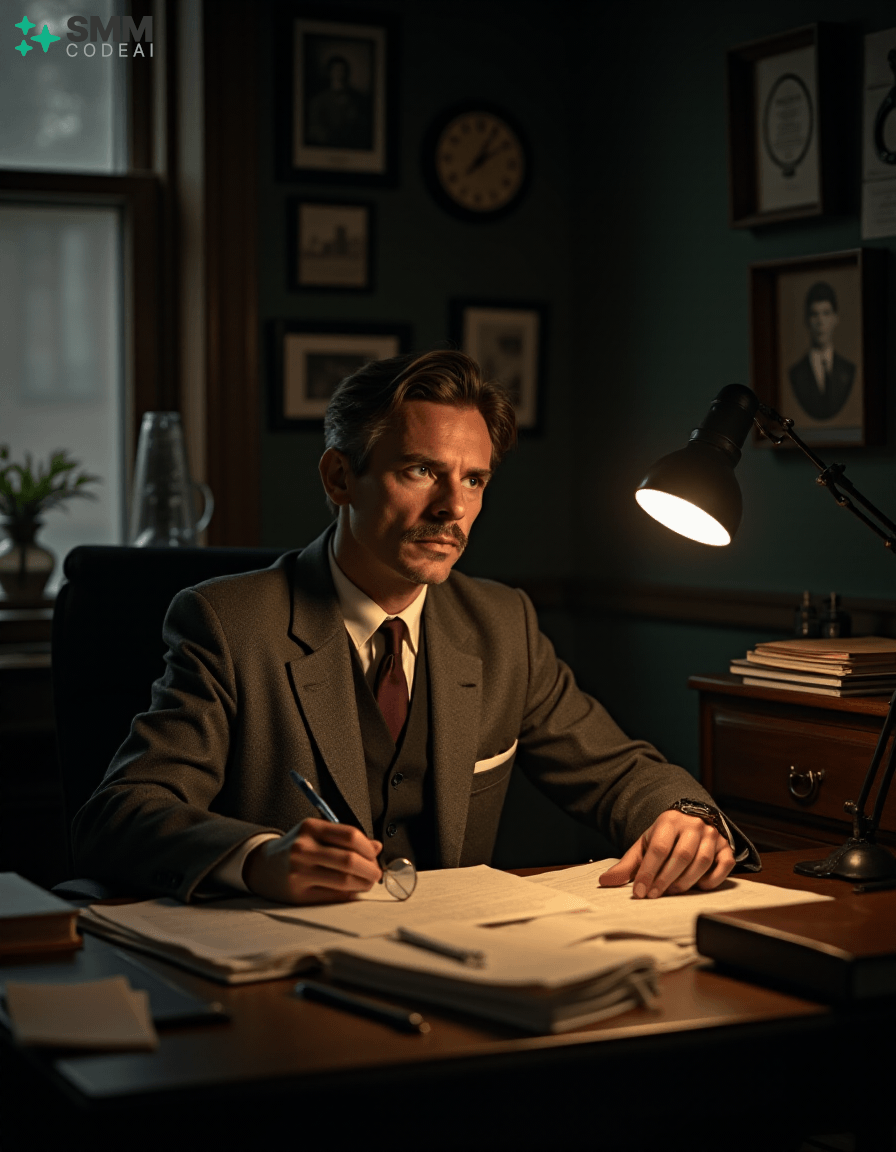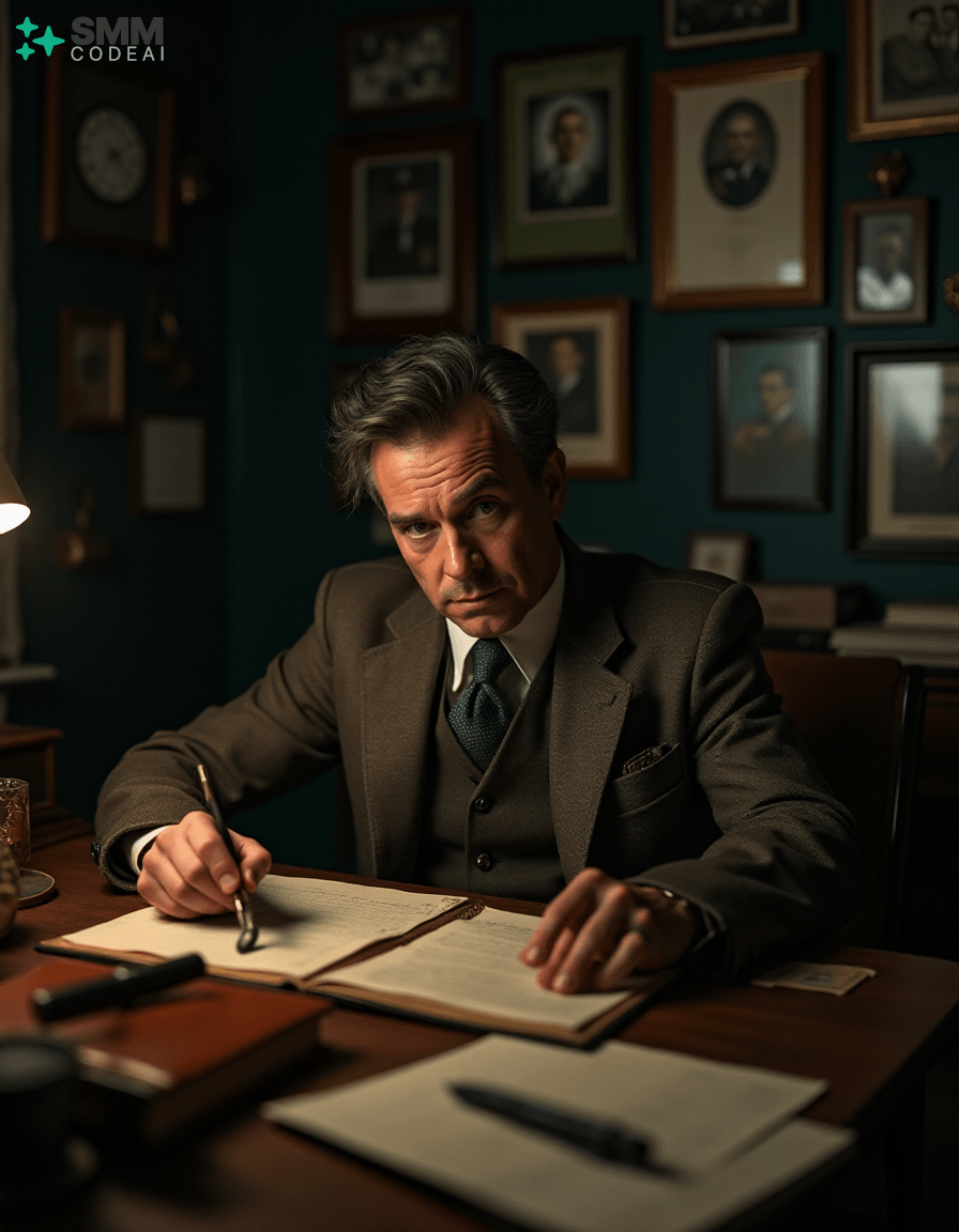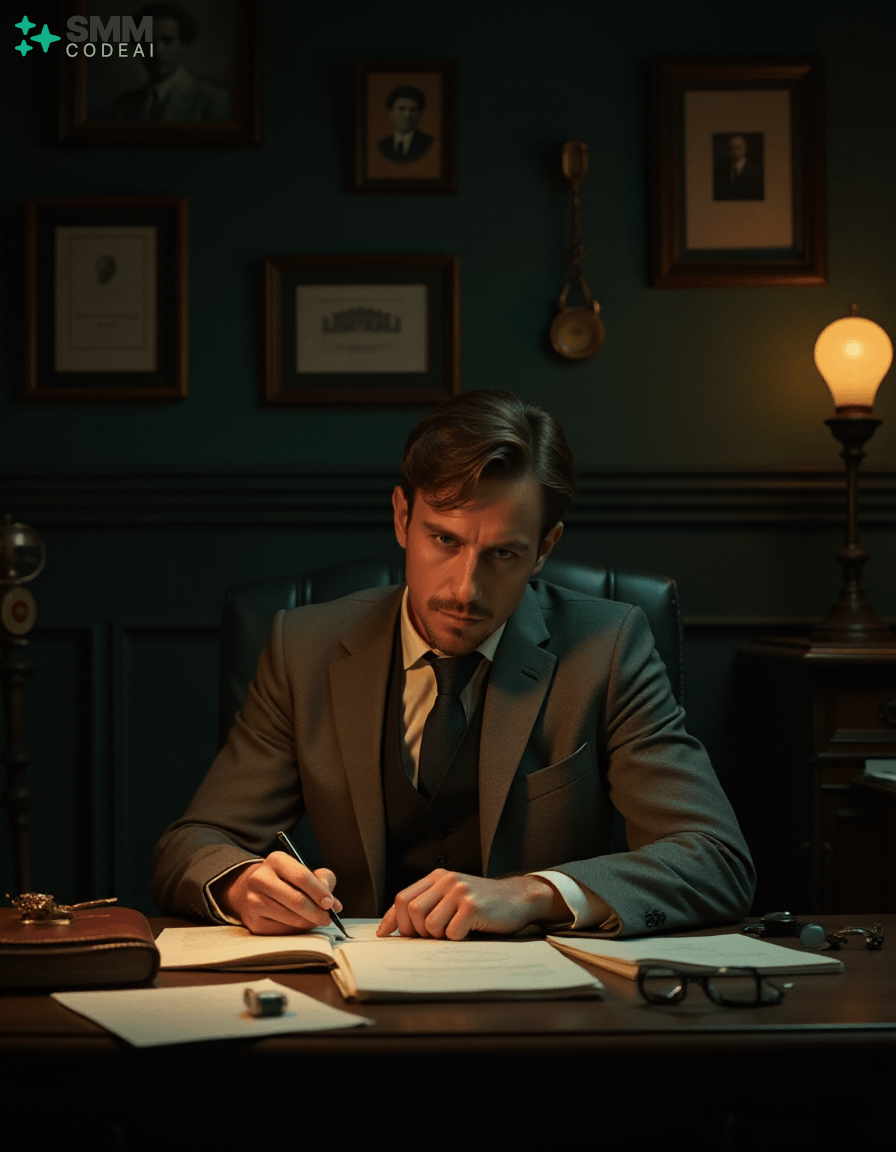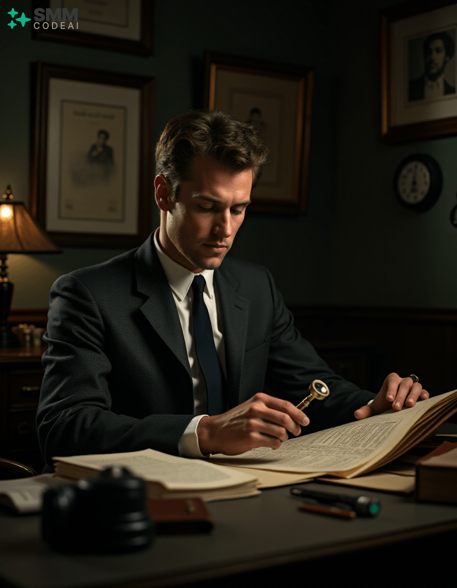 Create an atmospheric portrait of a vintage detective sitting at his cluttered desk in a dimly lit, old-fashioned police station. He wears a well-worn suit with a crisp shirt and a sharp tie, displaying a thoughtful expression as he reviews a stack of papers and a magnifying glass. His hair is neatly combed, but slightly tousled from the day's work. The walls are lined with framed photos and awards, creating an aura of professionalism and experience. The desk is filled with various tools and items used in his investigation, including a leather-bound notebook, a penlight, and a pair of handcuffs hanging on the wall. The lighting is soft and warm, casting shadows that accentuate his features and create a cozy atmosphere. Use a 50mm lens to capture the essence of his work while maintaining clarity in his expression. The mood should be nostalgic and intriguing, evoking a sense of mystery and adventure as the detective delves into solving a case.