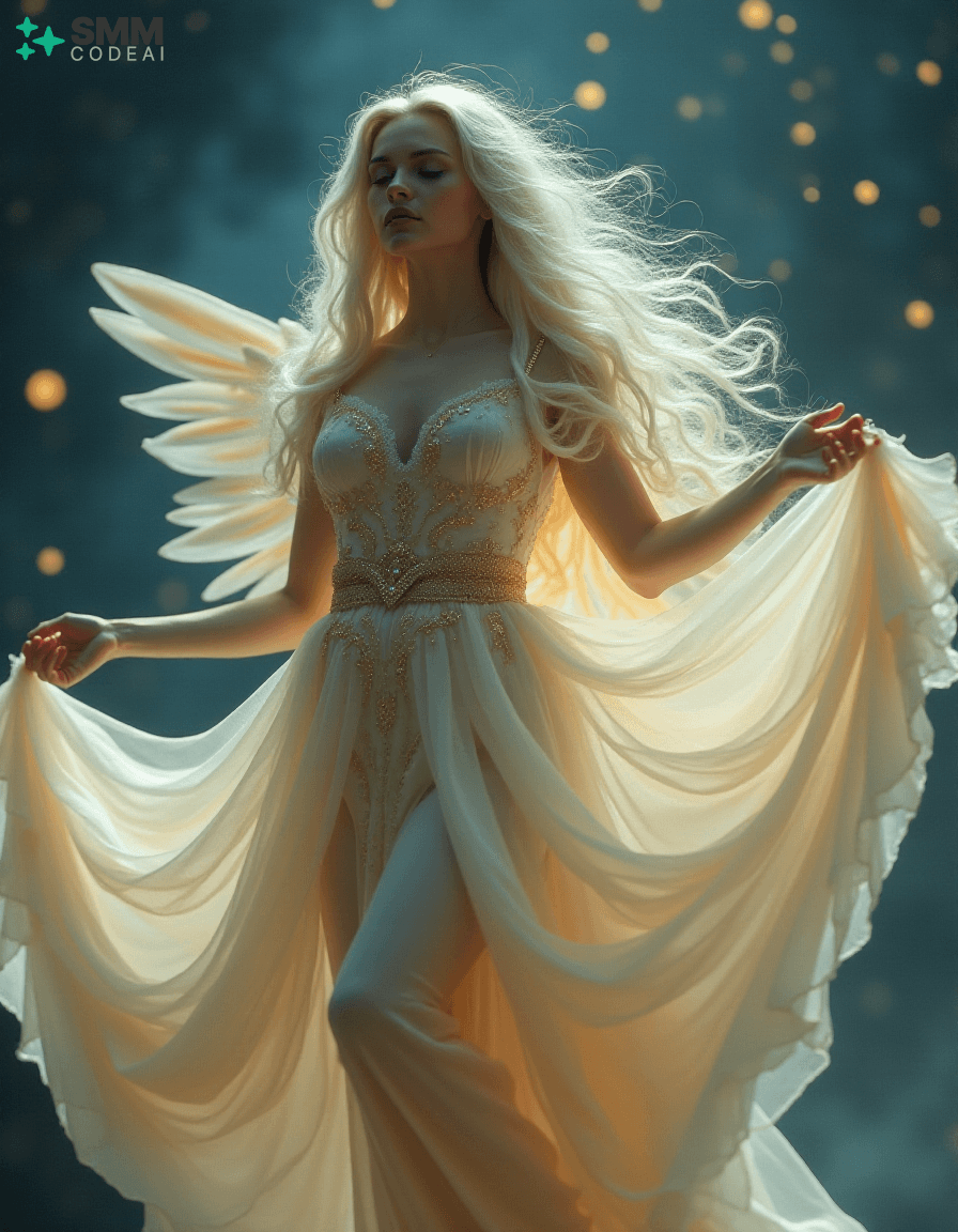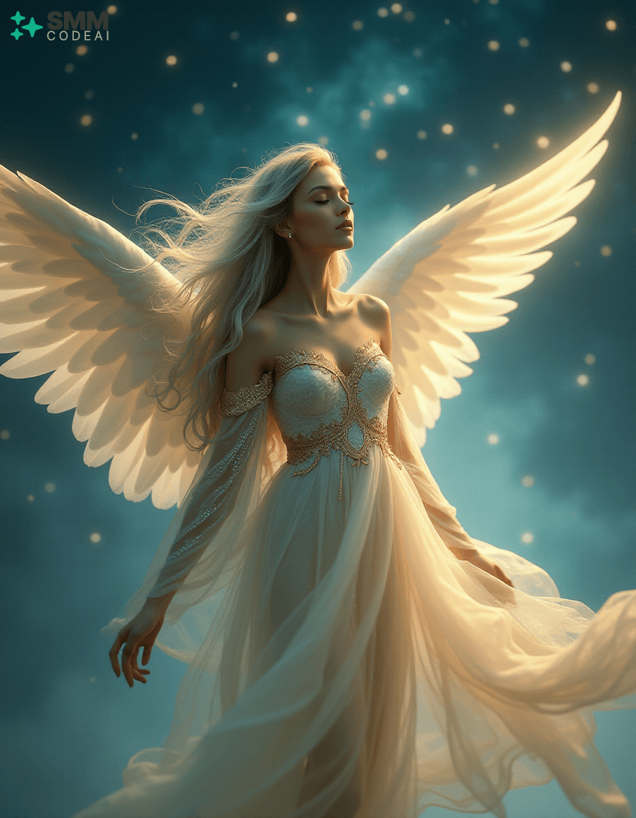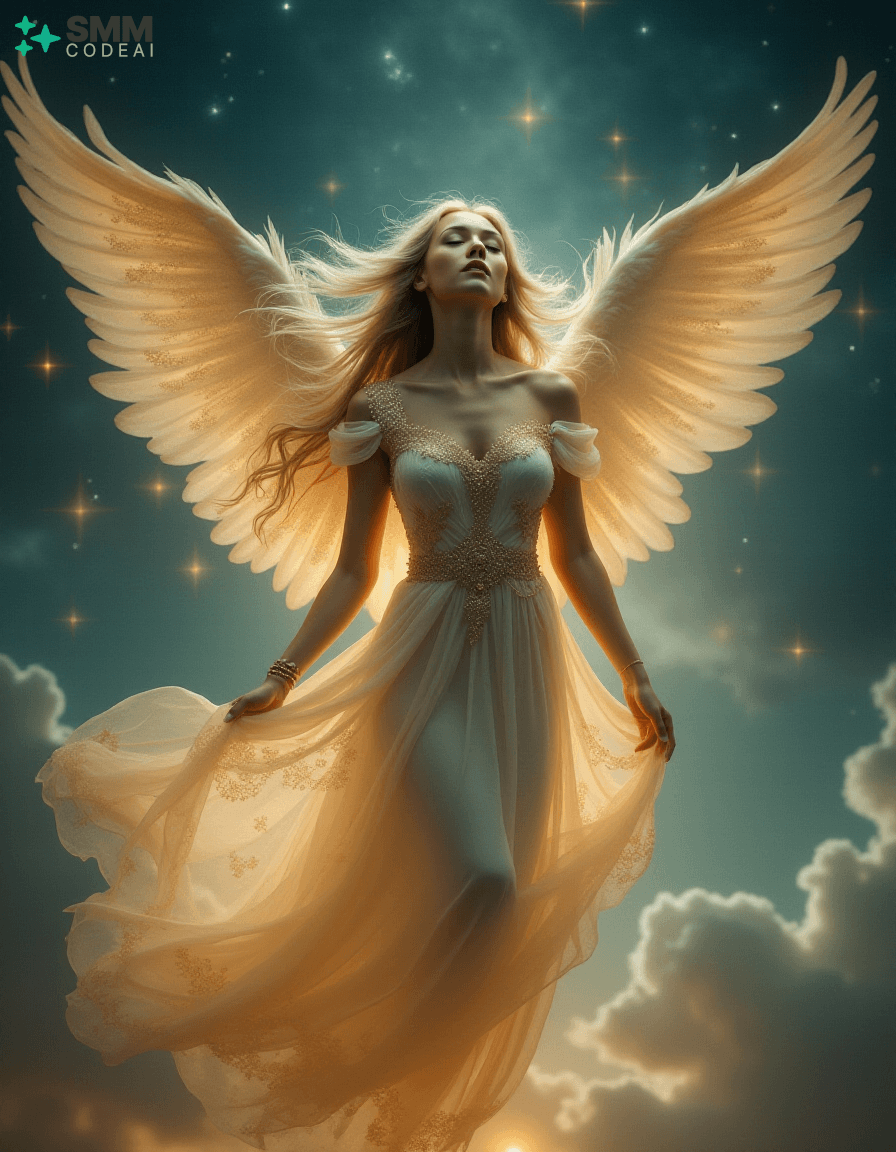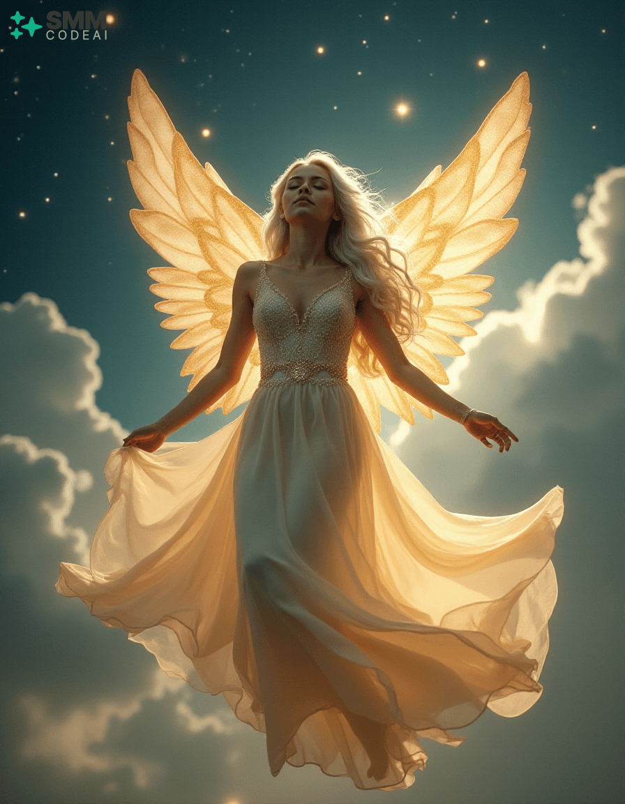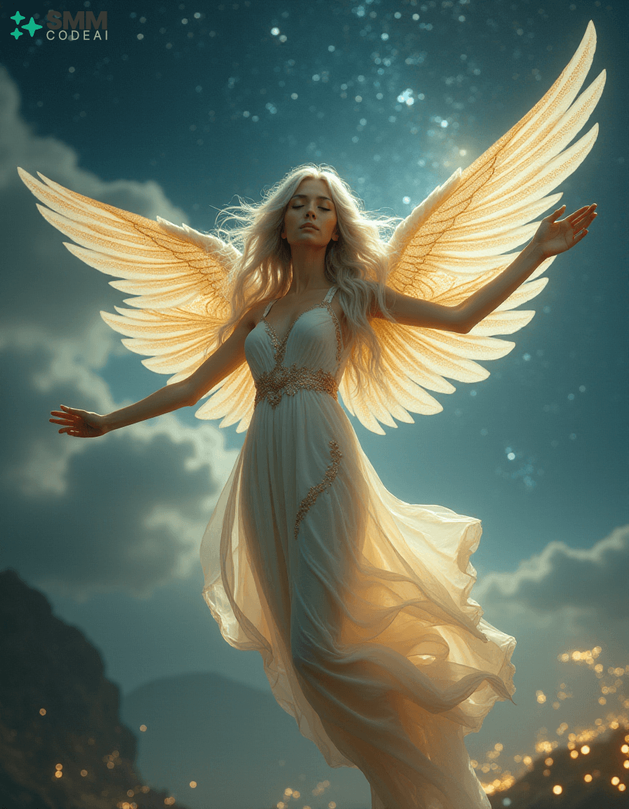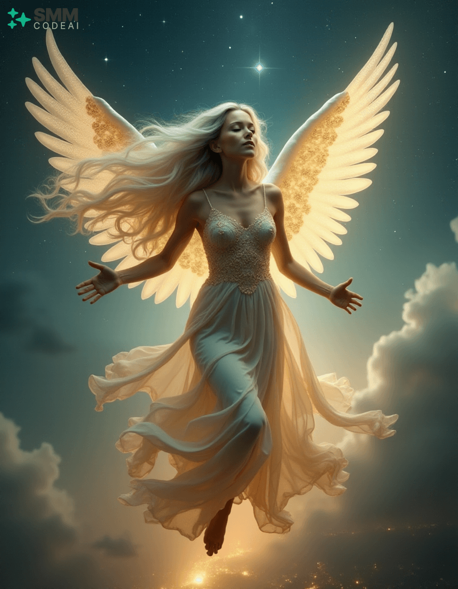 Create a captivating portrait of an ethereal angel floating gracefully in mid-air. She wears a beautiful, flowing gown that is shimmering with divine light and adorned with intricate golden patterns. Her hair is long and cascades down her back, with a touch of silver mixed among the soft, white strands. She has a serene expression on her face, and her eyes are closed as if in deep meditation or contemplation. The background should feature a vast expanse of stars twinkling above, with a faint glow emanating from an ethereal city below. The lighting is soft and magical, casting gentle shadows that highlight her features and create a sense of otherworldly beauty. Use a 50mm lens to capture the intimate details of her face while softly blurring the background, emphasizing the peaceful atmosphere and the timeless beauty of nature. The mood should be otherworldly and mystical, capturing the essence of an ethereal angel's presence and the serenity it brings to those around her.