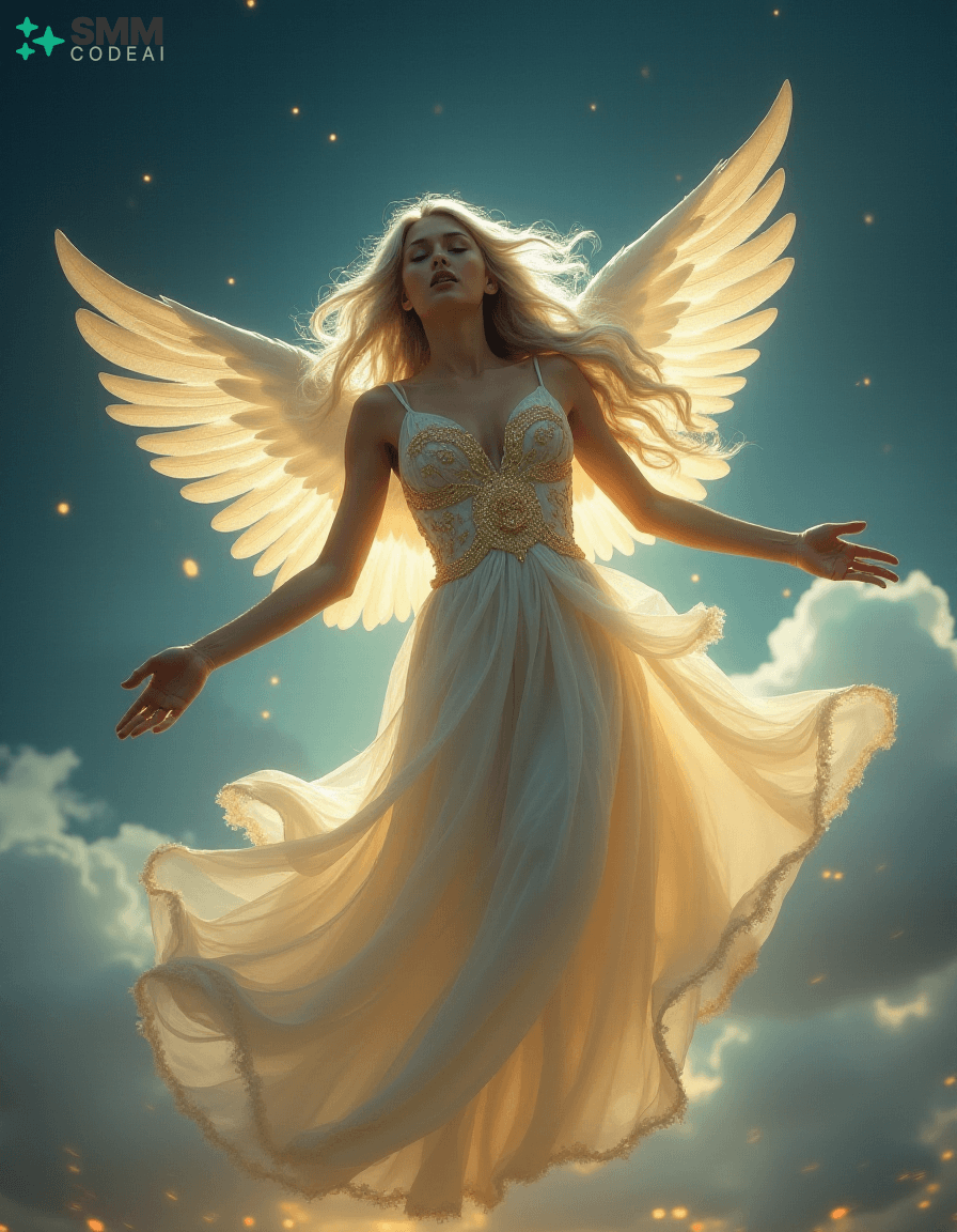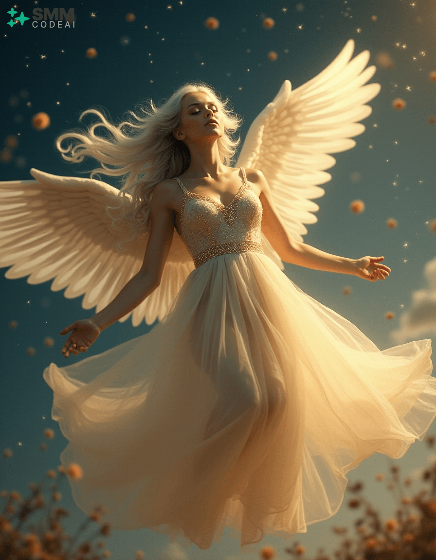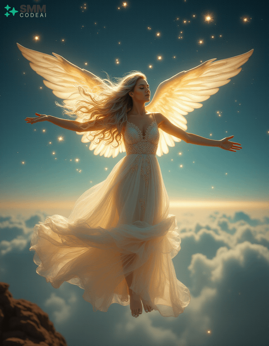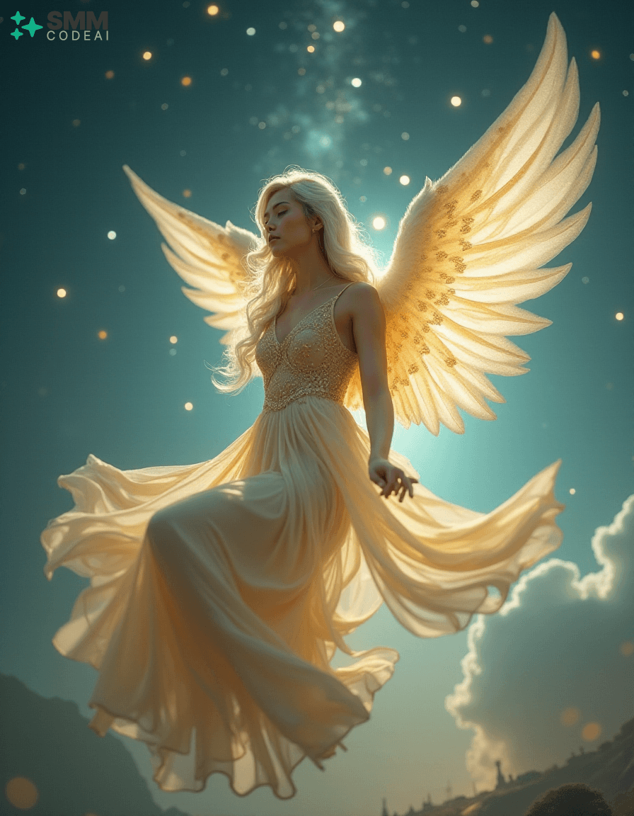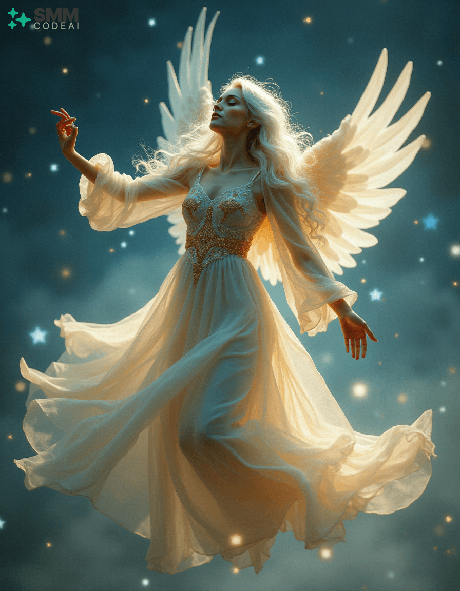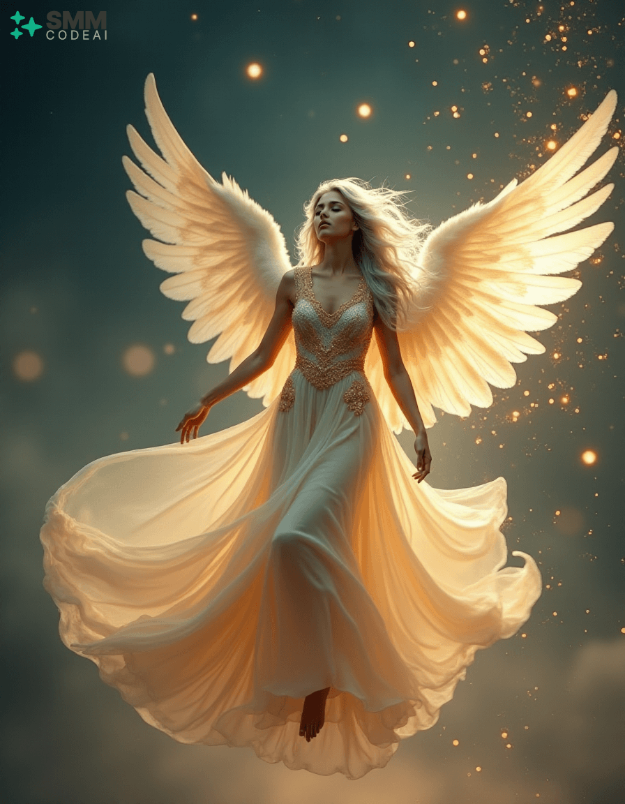 Create a captivating portrait of an ethereal angel floating gracefully in mid-air. She wears a beautiful, flowing gown that is shimmering with divine light and adorned with intricate golden patterns. Her hair is long and cascades down her back, with a touch of silver mixed among the soft, white strands. She has a serene expression on her face, and her eyes are closed as if in deep meditation or contemplation. The background should feature a vast expanse of stars twinkling above, with a faint glow emanating from an ethereal city below. The lighting is soft and magical, casting gentle shadows that highlight her features and create a sense of otherworldly beauty. Use a 50mm lens to capture the intimate details of her face while softly blurring the background, emphasizing the peaceful atmosphere and the timeless beauty of nature. The mood should be otherworldly and mystical, capturing the essence of an ethereal angel's presence and the serenity it brings to those around her.