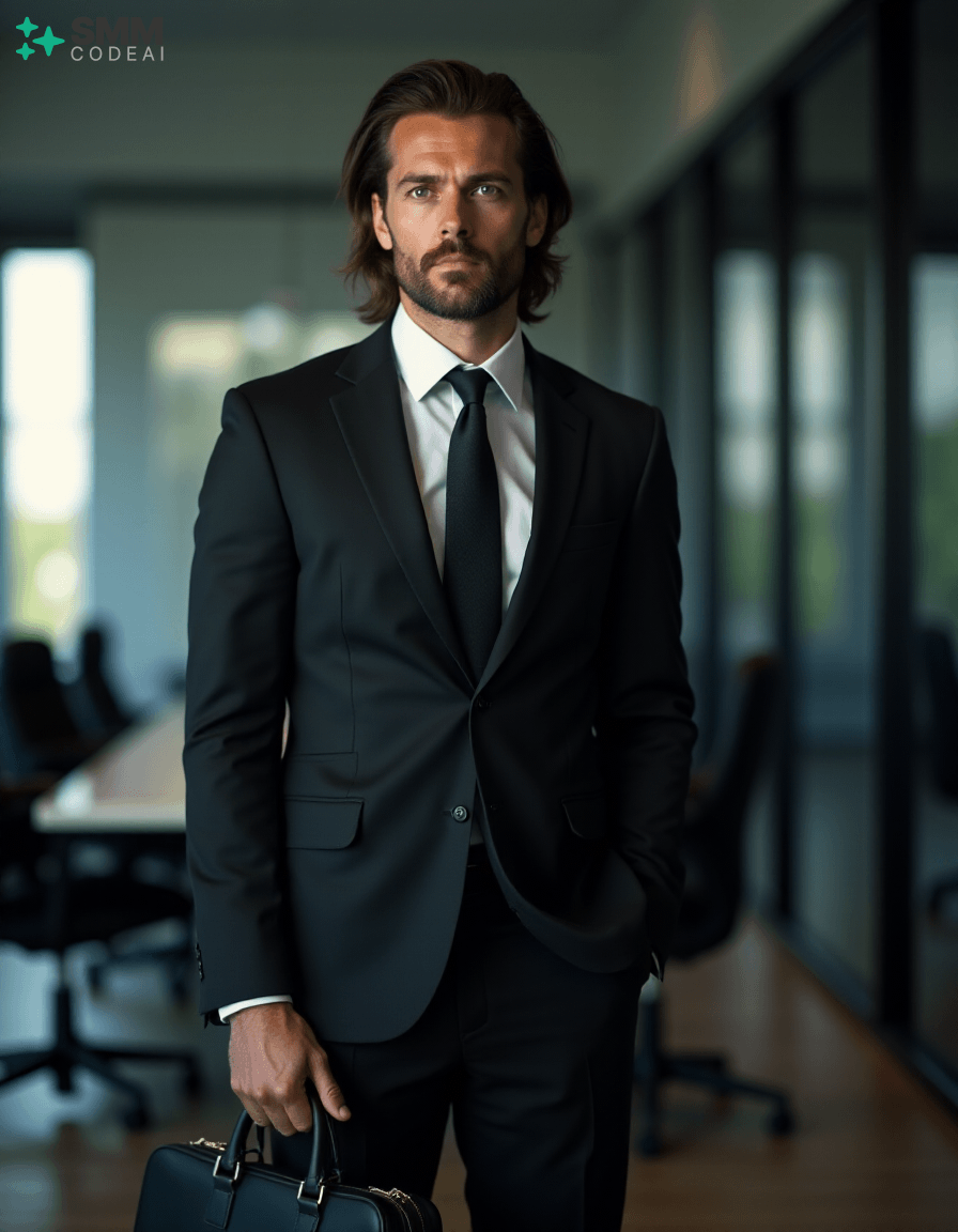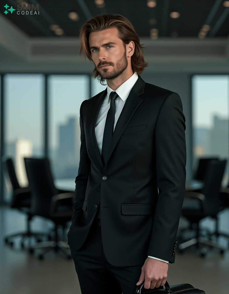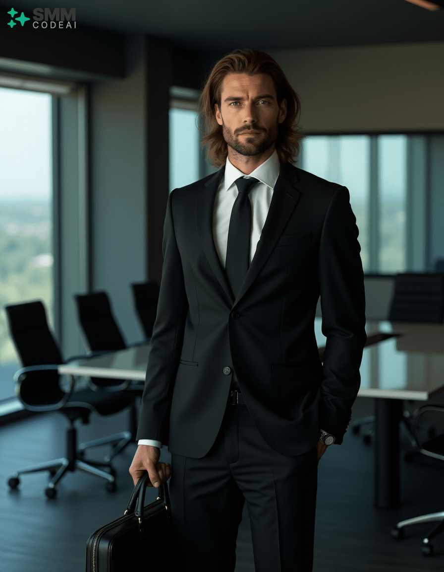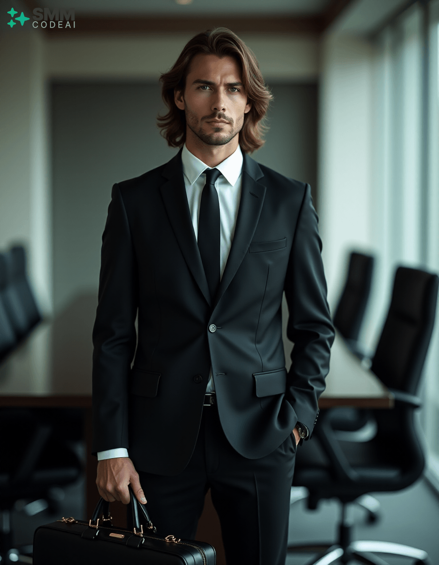 Create an authoritative portrait of a serious professional standing in a modern office setting. He wears a sharp black suit with a crisp white shirt and a stylish tie, conveying a sense of professionalism and competence. His long, neatly styled hair is slightly tousled from the day's work, and his face is set in a determined expression. He holds a briefcase firmly in one hand, ready to address an important meeting or client interaction. The background should feature a high-tech conference room with modern furniture and sleek, reflective surfaces. The lighting is soft and professional, casting shadows that highlight his features and create a sense of confidence and reliability. Use a 50mm lens to capture the intimate details of his face while maintaining clarity in his expression. The mood should be serious and focused, capturing the essence of a professional who embodies expertise and dedication in their work.