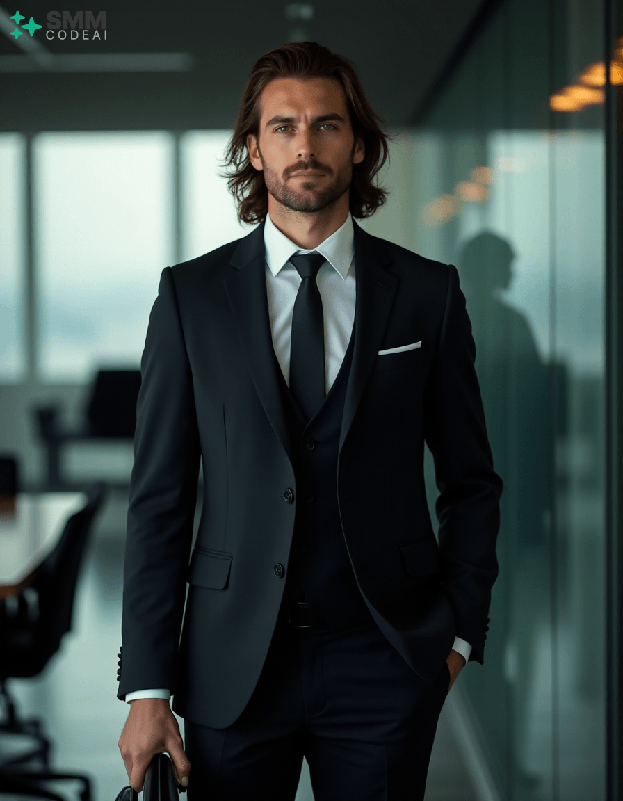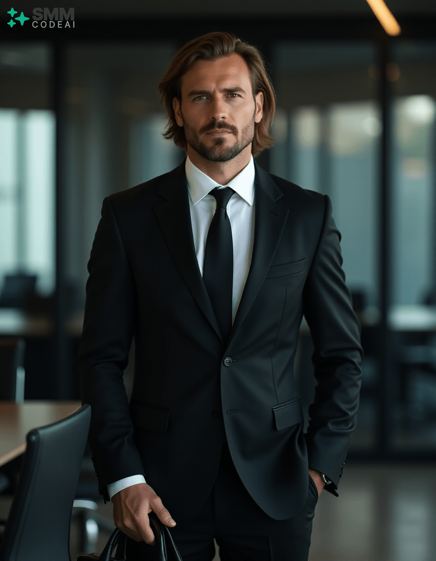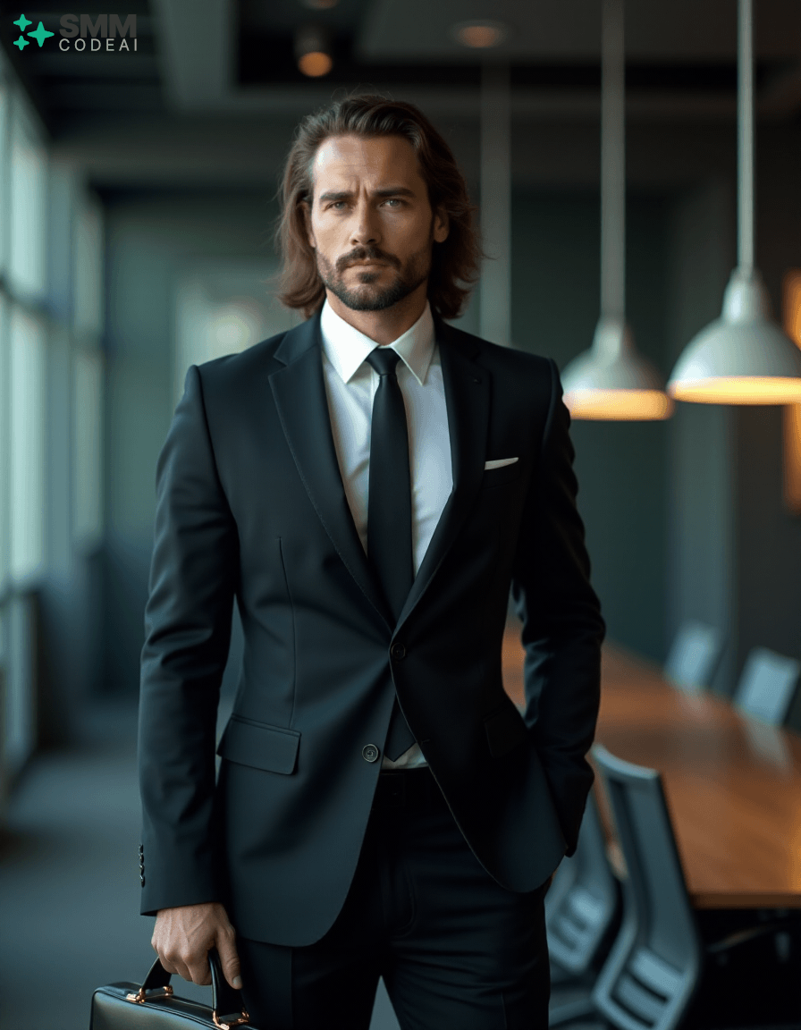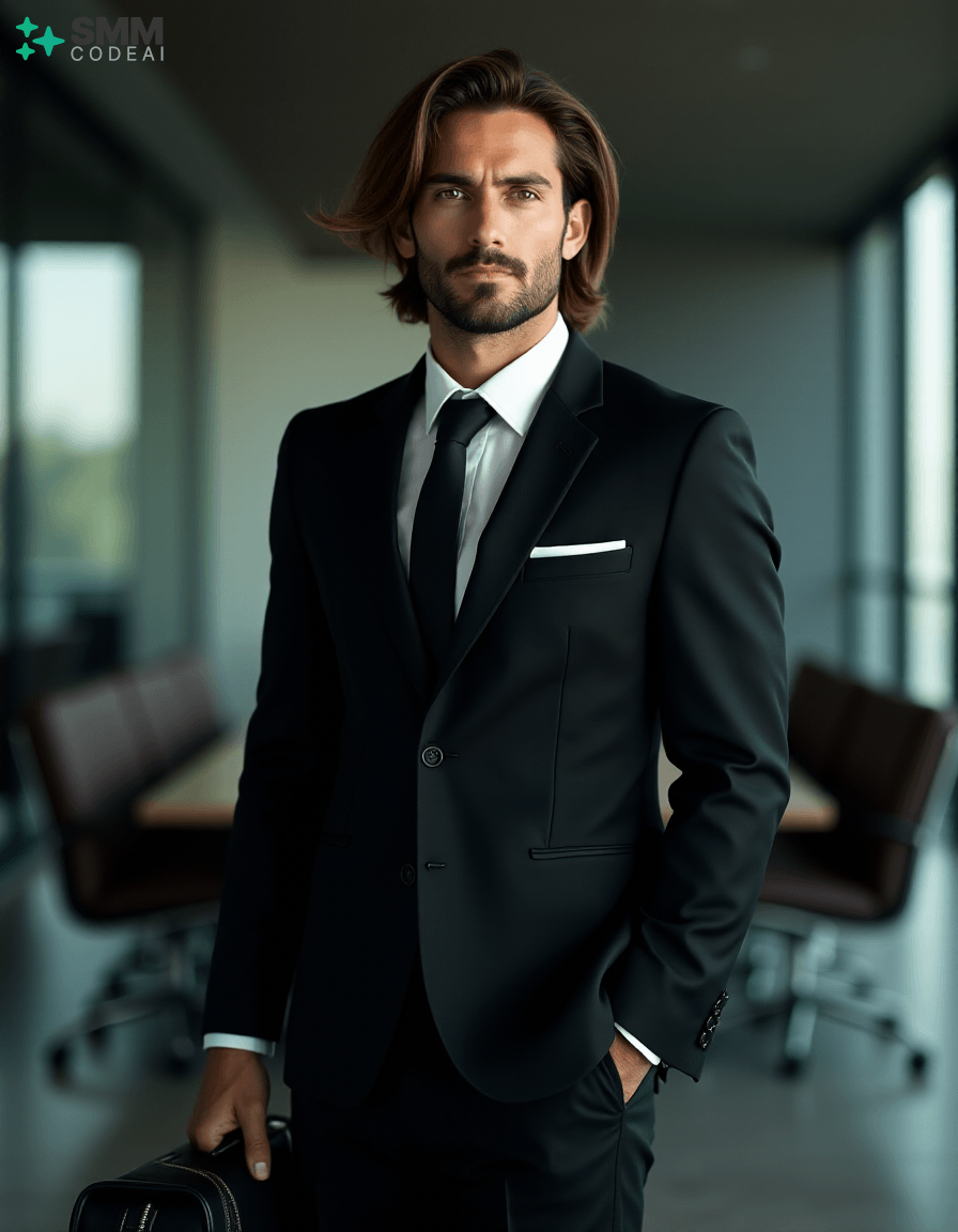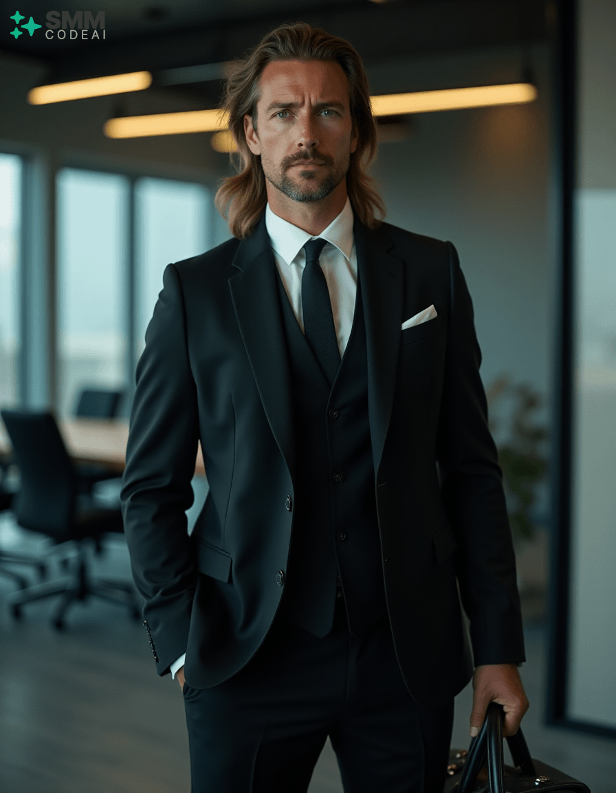 Create an authoritative portrait of a serious professional standing in a modern office setting. He wears a sharp black suit with a crisp white shirt and a stylish tie, conveying a sense of professionalism and competence. His long, neatly styled hair is slightly tousled from the day's work, and his face is set in a determined expression. He holds a briefcase firmly in one hand, ready to address an important meeting or client interaction. The background should feature a high-tech conference room with modern furniture and sleek, reflective surfaces. The lighting is soft and professional, casting shadows that highlight his features and create a sense of confidence and reliability. Use a 50mm lens to capture the intimate details of his face while maintaining clarity in his expression. The mood should be serious and focused, capturing the essence of a professional who embodies expertise and dedication in their work.