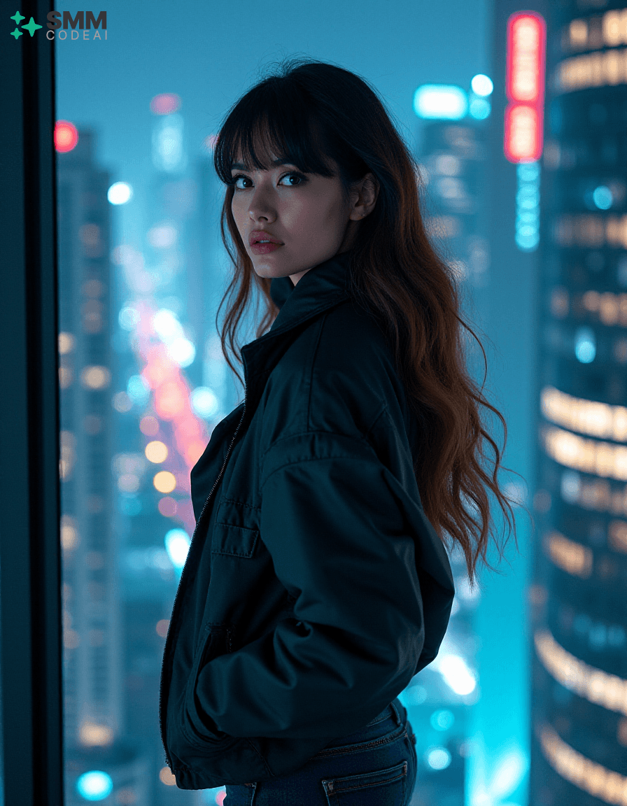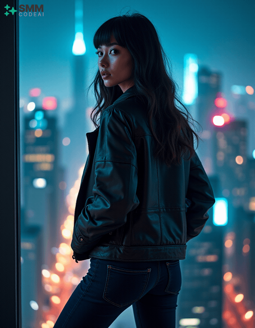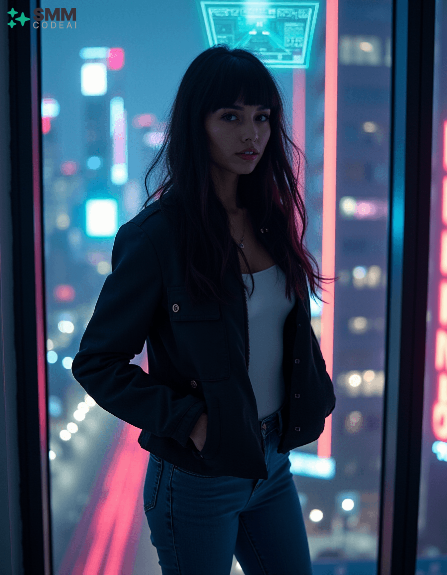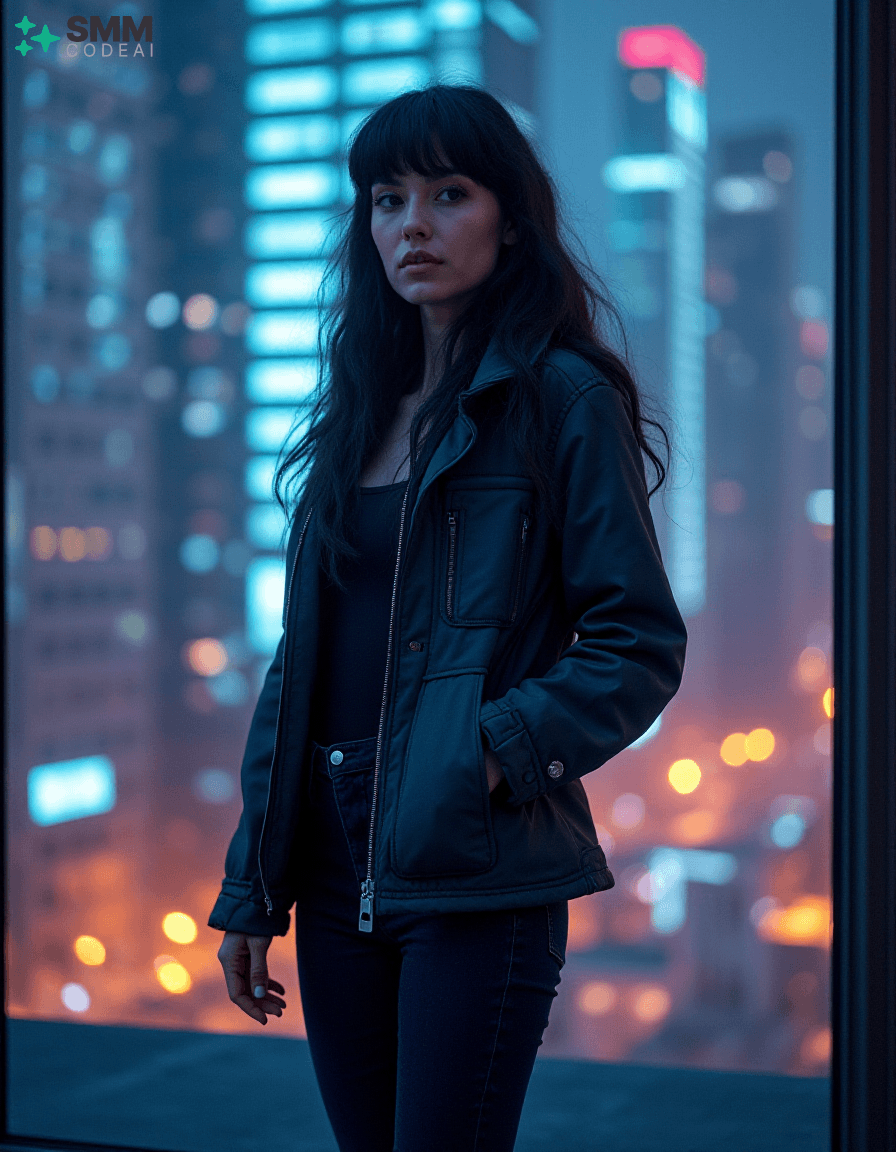 Create a portrait of a visionary woman standing in her futuristic city apartment, with a look of determination on her face as she looks out over a sprawling metropolis bathed in neon lights. Her long, flowing hair is styled in loose waves and falls just past her shoulders, framed by bold bangs that are a striking contrast to the sleek geometric patterns of her outfit. She wears a stylish yet practical outfit, consisting of a fitted jacket with large pockets, paired with slim jeans and ankle boots. The background should feature high-rise buildings reaching towards the sky, their windows reflecting the bright city lights, and a holographic display floating above her shoulder. The lighting is dramatic, casting sharp shadows that accentuate her features and create an air of confidence and innovation. Use a 35mm lens to capture the energy and excitement of the moment while maintaining clarity in her expression. The mood should be energetic and forward-thinking, capturing the spirit of a visionary who sees beyond the ordinary and drives progress for the future.