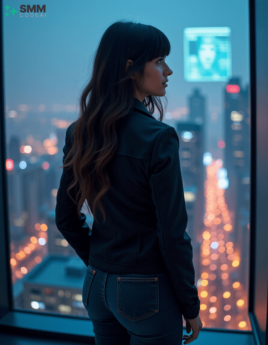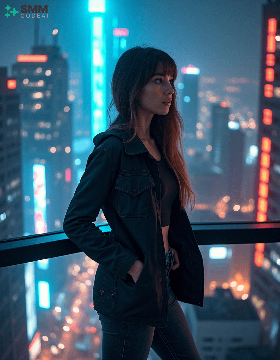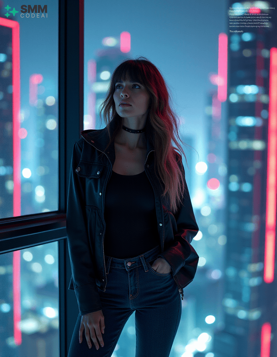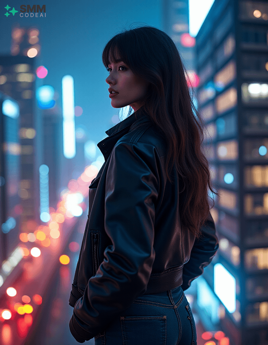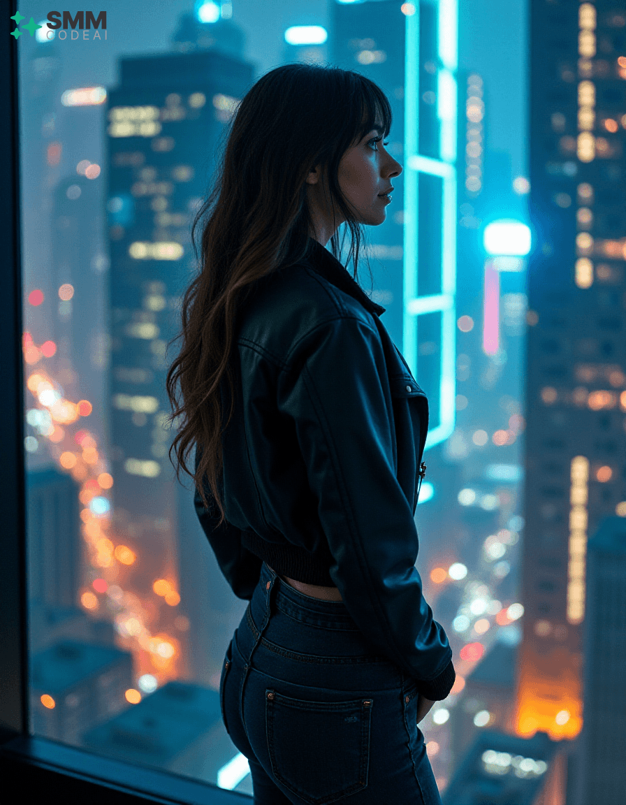 Create a portrait of a visionary woman standing in her futuristic city apartment, with a look of determination on her face as she looks out over a sprawling metropolis bathed in neon lights. Her long, flowing hair is styled in loose waves and falls just past her shoulders, framed by bold bangs that are a striking contrast to the sleek geometric patterns of her outfit. She wears a stylish yet practical outfit, consisting of a fitted jacket with large pockets, paired with slim jeans and ankle boots. The background should feature high-rise buildings reaching towards the sky, their windows reflecting the bright city lights, and a holographic display floating above her shoulder. The lighting is dramatic, casting sharp shadows that accentuate her features and create an air of confidence and innovation. Use a 35mm lens to capture the energy and excitement of the moment while maintaining clarity in her expression. The mood should be energetic and forward-thinking, capturing the spirit of a visionary who sees beyond the ordinary and drives progress for the future.