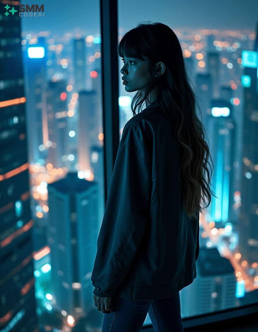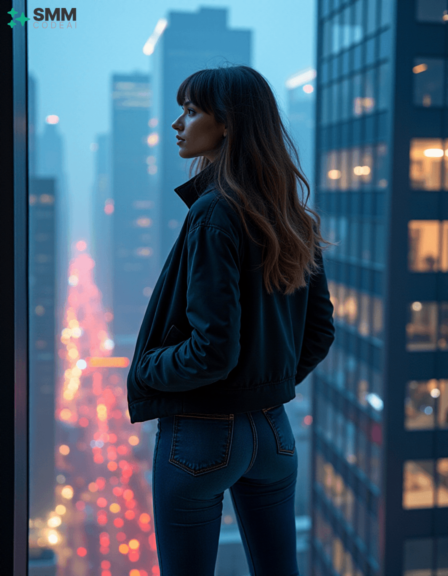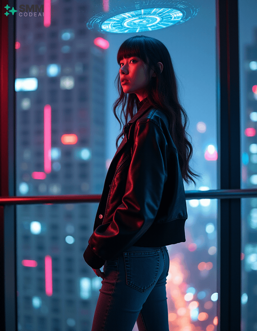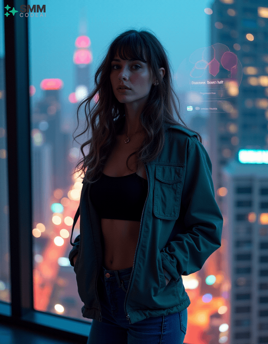 Create a portrait of a visionary woman standing in her futuristic city apartment, with a look of determination on her face as she looks out over a sprawling metropolis bathed in neon lights. Her long, flowing hair is styled in loose waves and falls just past her shoulders, framed by bold bangs that are a striking contrast to the sleek geometric patterns of her outfit. She wears a stylish yet practical outfit, consisting of a fitted jacket with large pockets, paired with slim jeans and ankle boots. The background should feature high-rise buildings reaching towards the sky, their windows reflecting the bright city lights, and a holographic display floating above her shoulder. The lighting is dramatic, casting sharp shadows that accentuate her features and create an air of confidence and innovation. Use a 35mm lens to capture the energy and excitement of the moment while maintaining clarity in her expression. The mood should be energetic and forward-thinking, capturing the spirit of a visionary who sees beyond the ordinary and drives progress for the future.